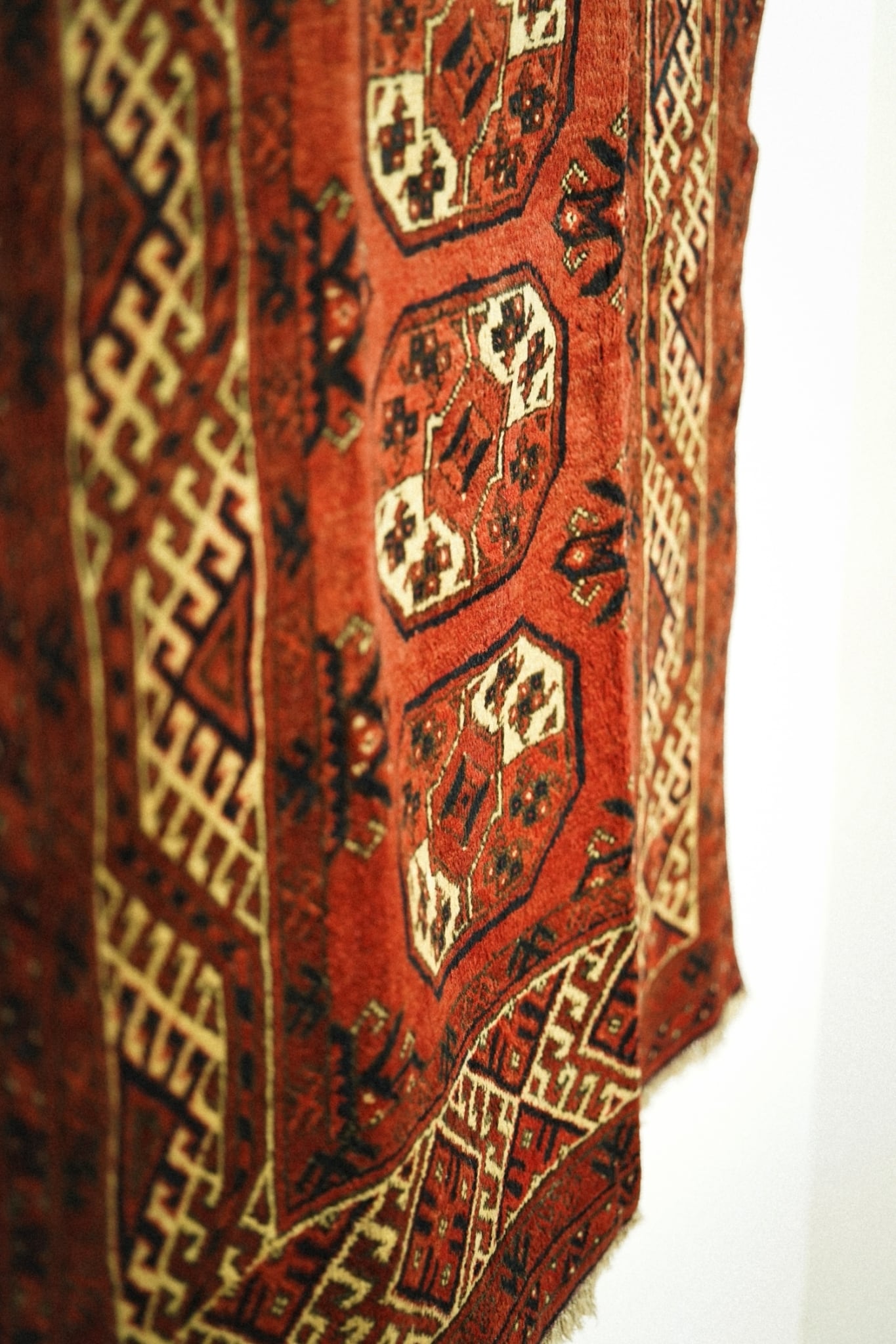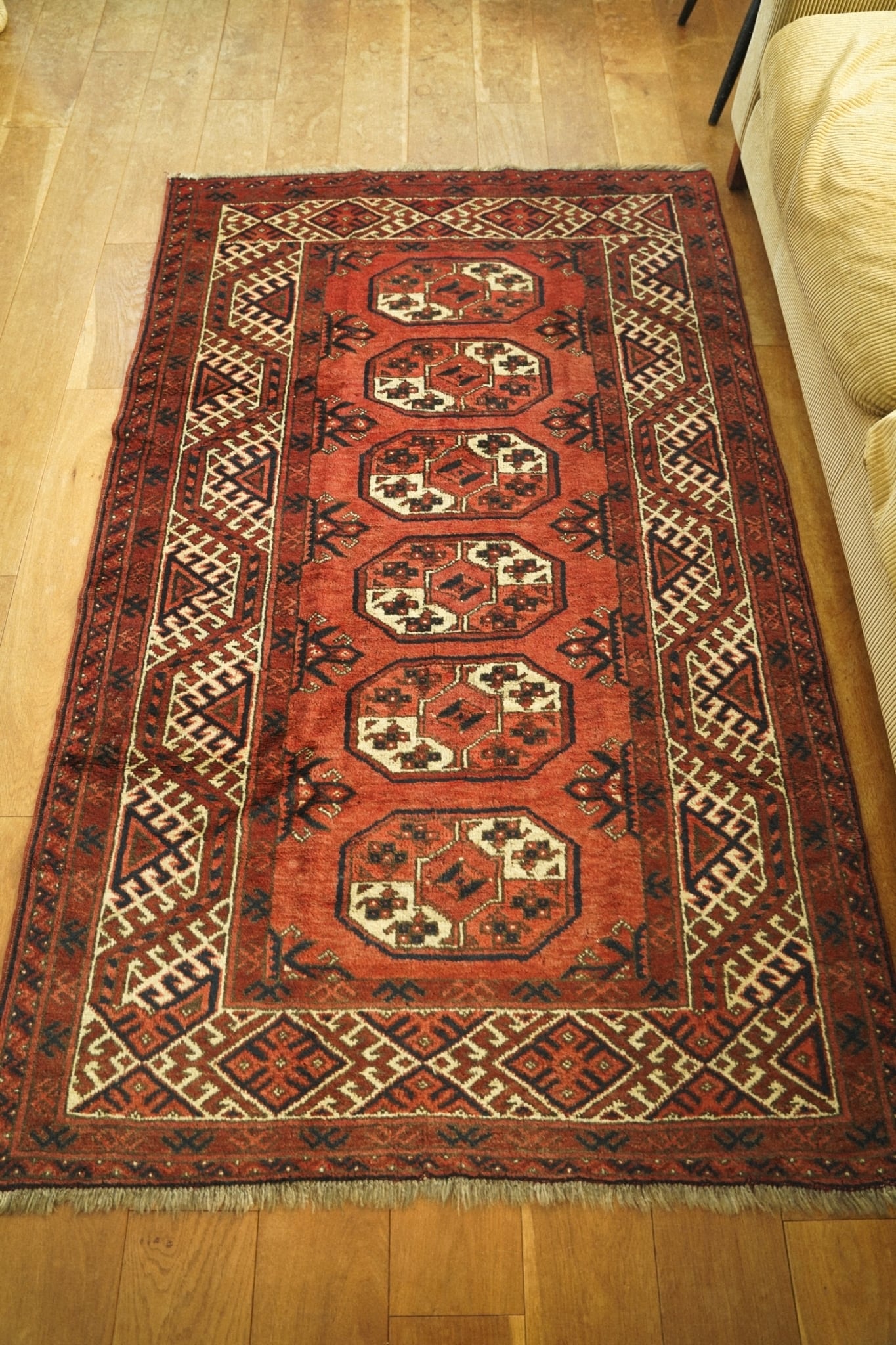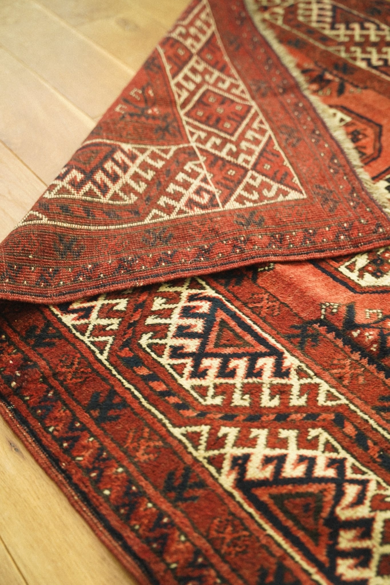 1940年代に織られたアフガニスタン産のトルクメンラグ。経年により熟成された美しい茜色のフィールドに大きなギュルが並ぶデザイン。