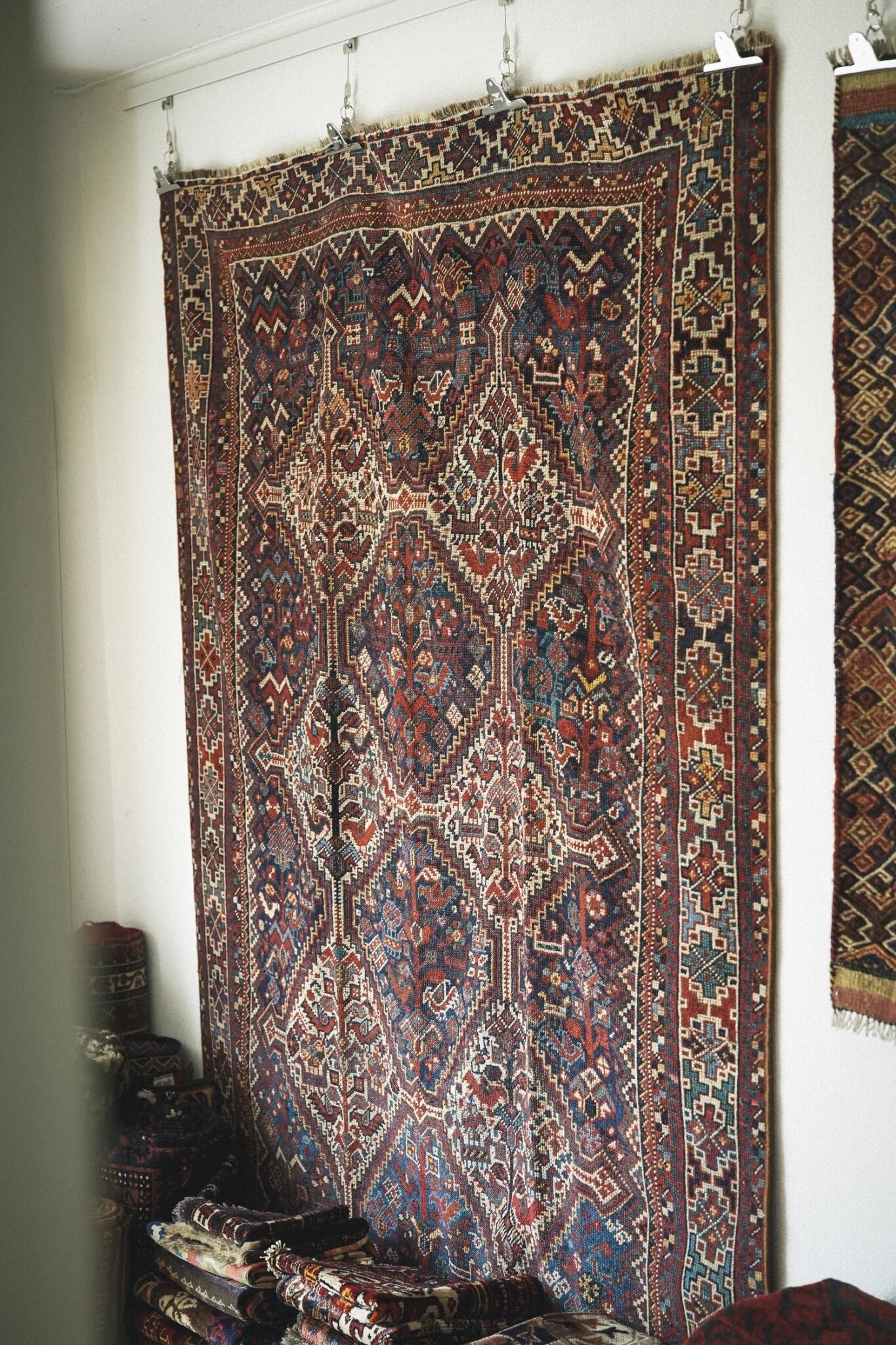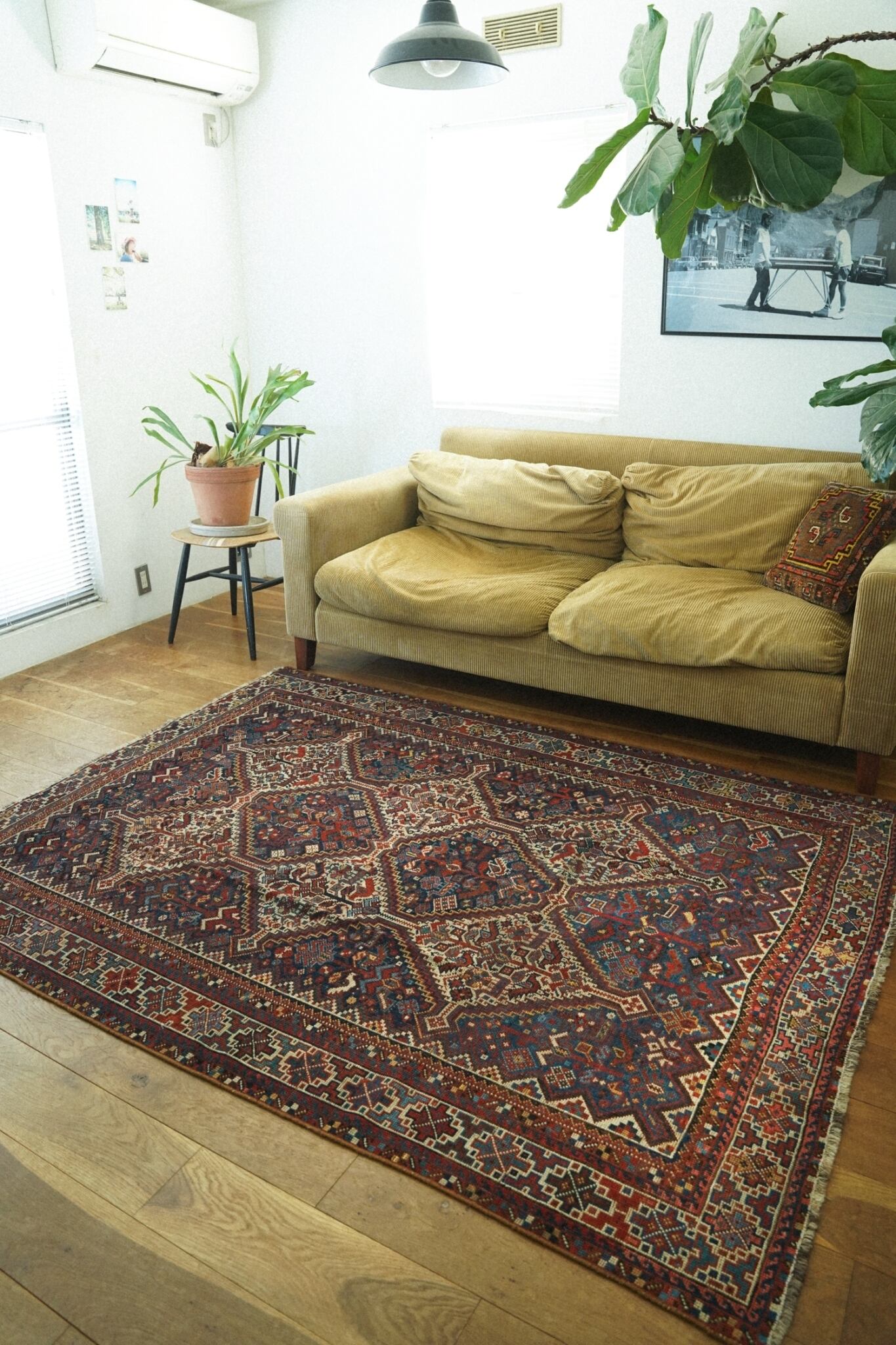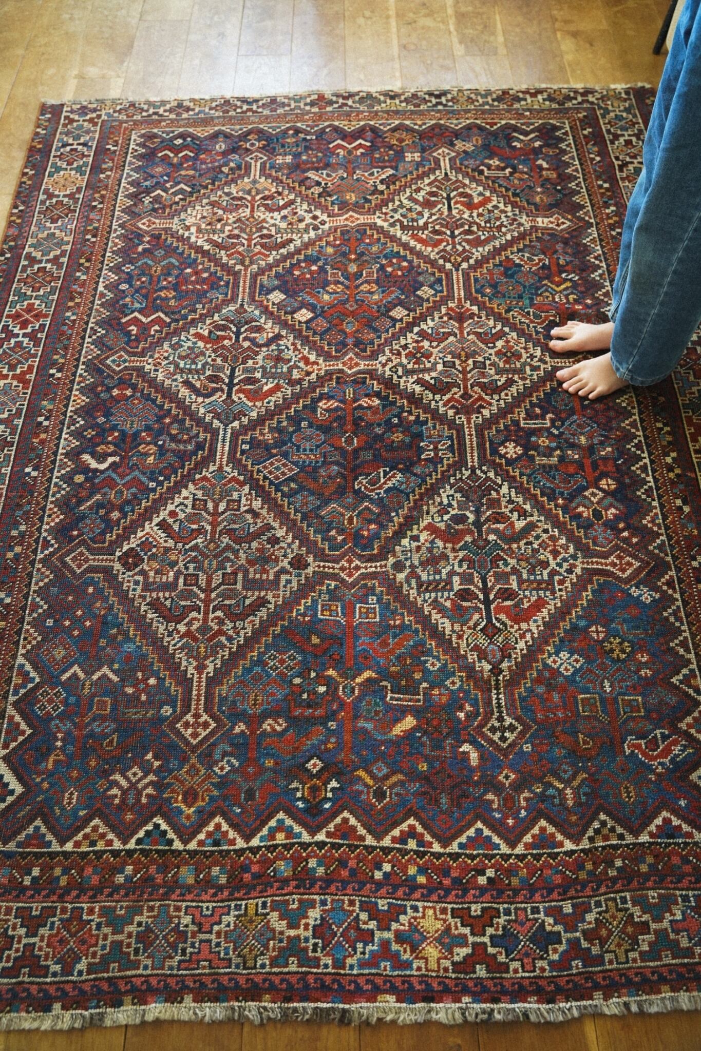 イラン南部に住むハムセ連合によるムルグ(鶏)文様がたくさん描かれた伝統的なデザインのラグ。