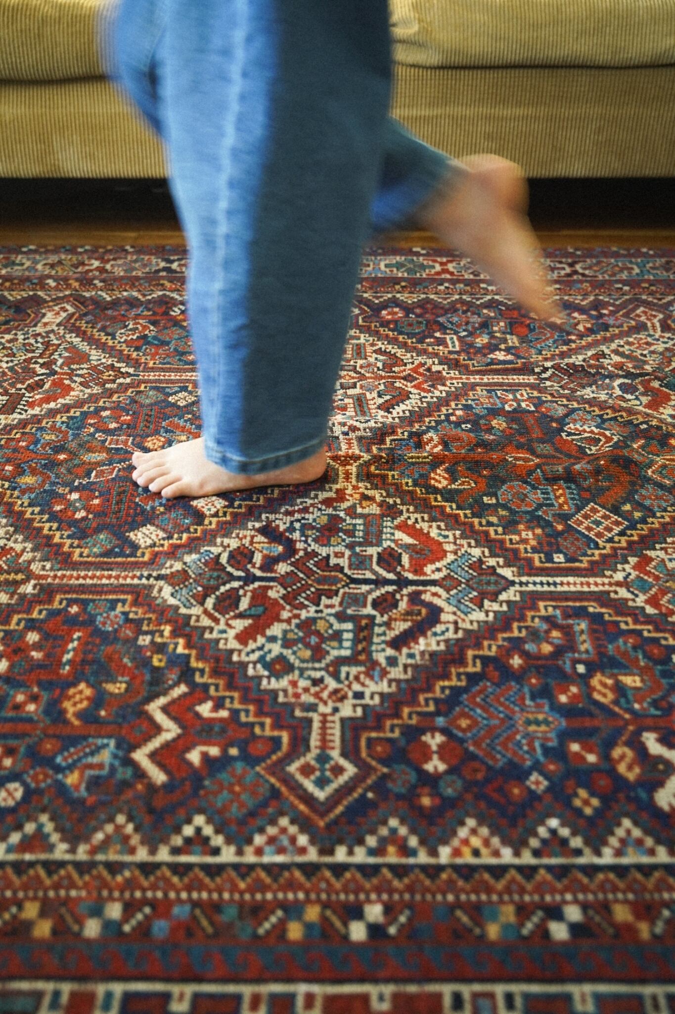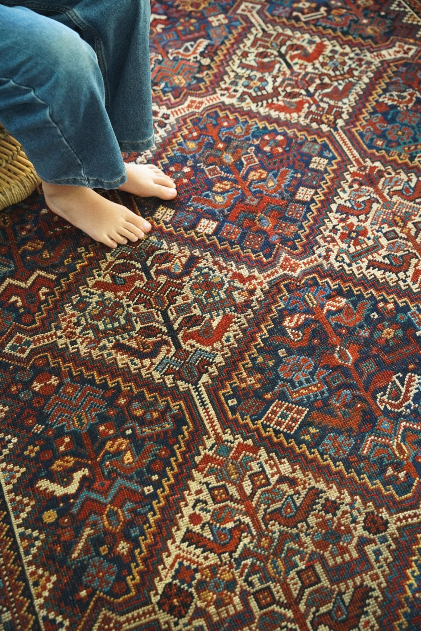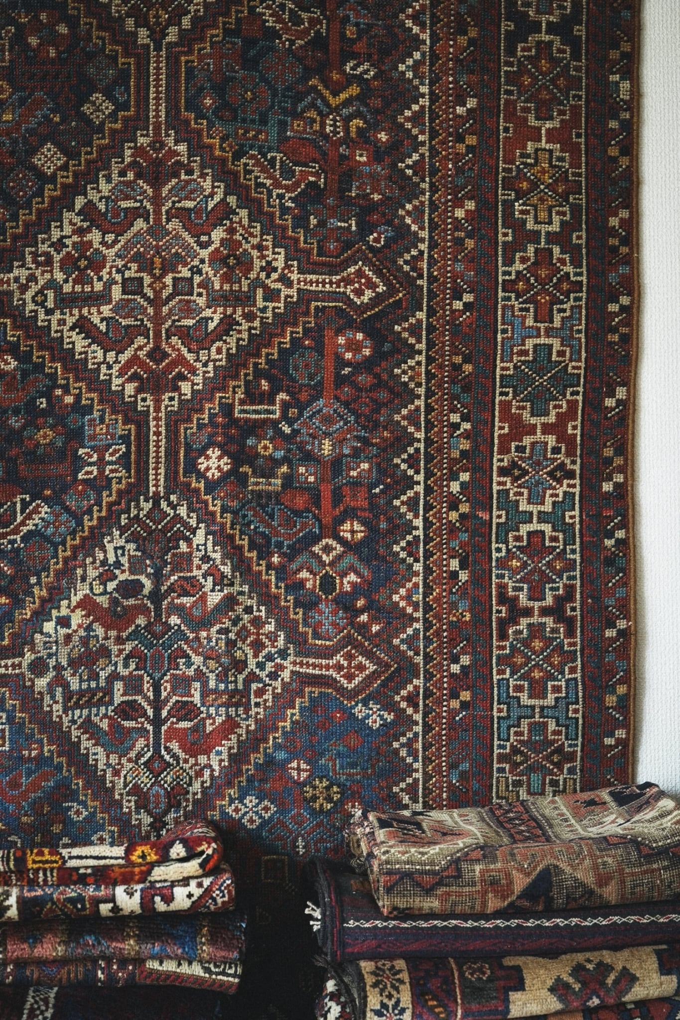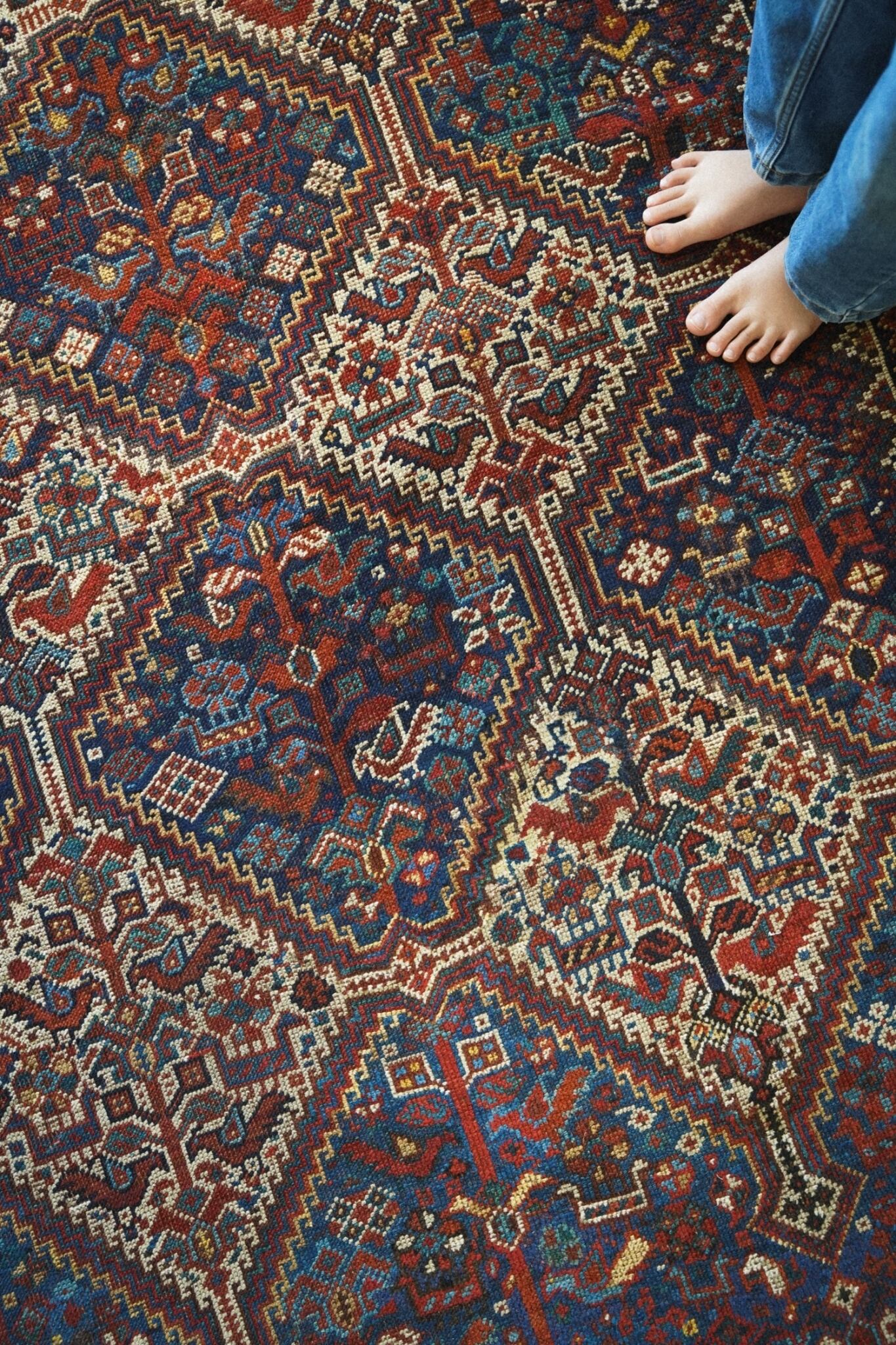 イラン南部に住むハムセ連合によるムルグ(鶏)文様がたくさん描かれた伝統的なデザインのラグ。