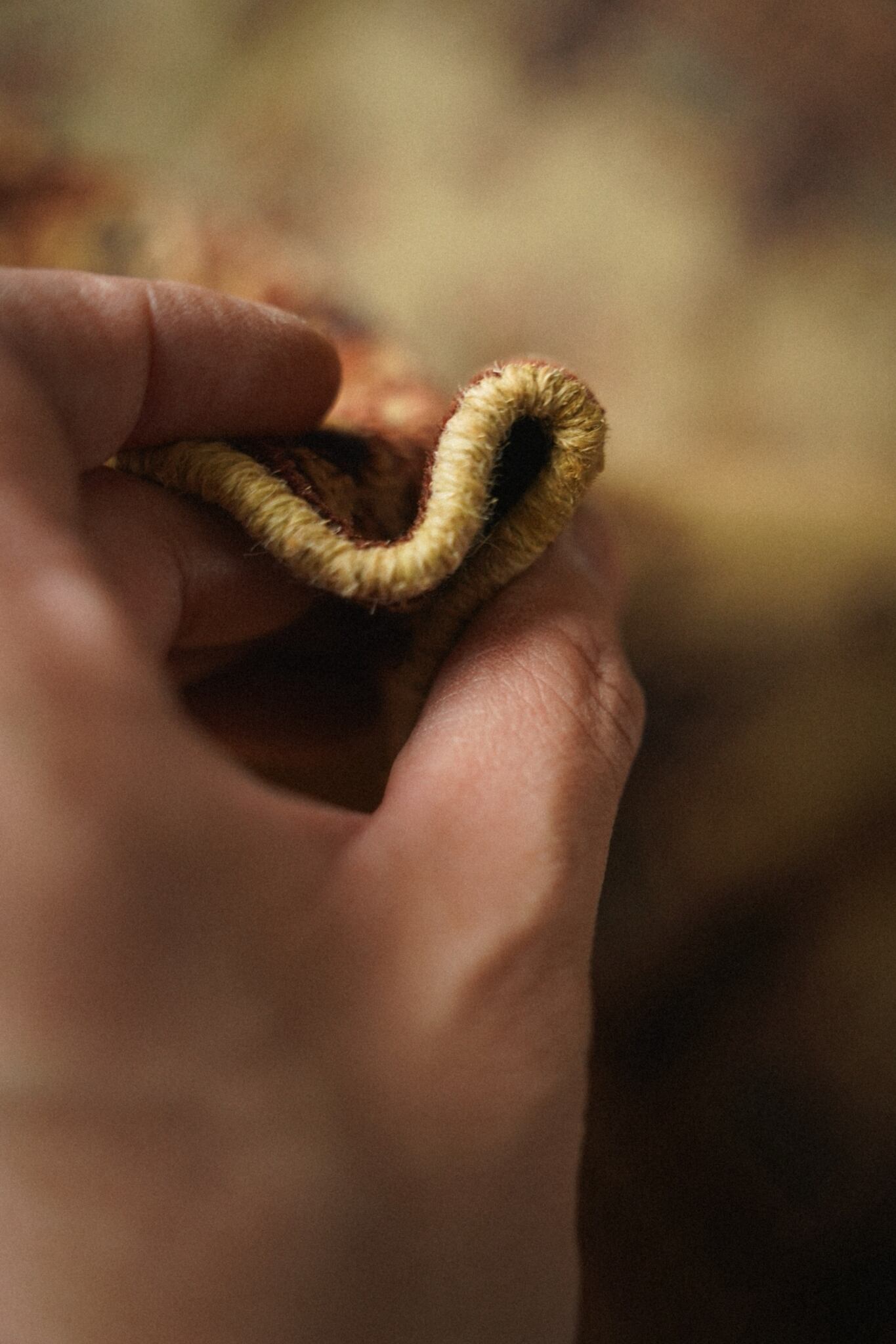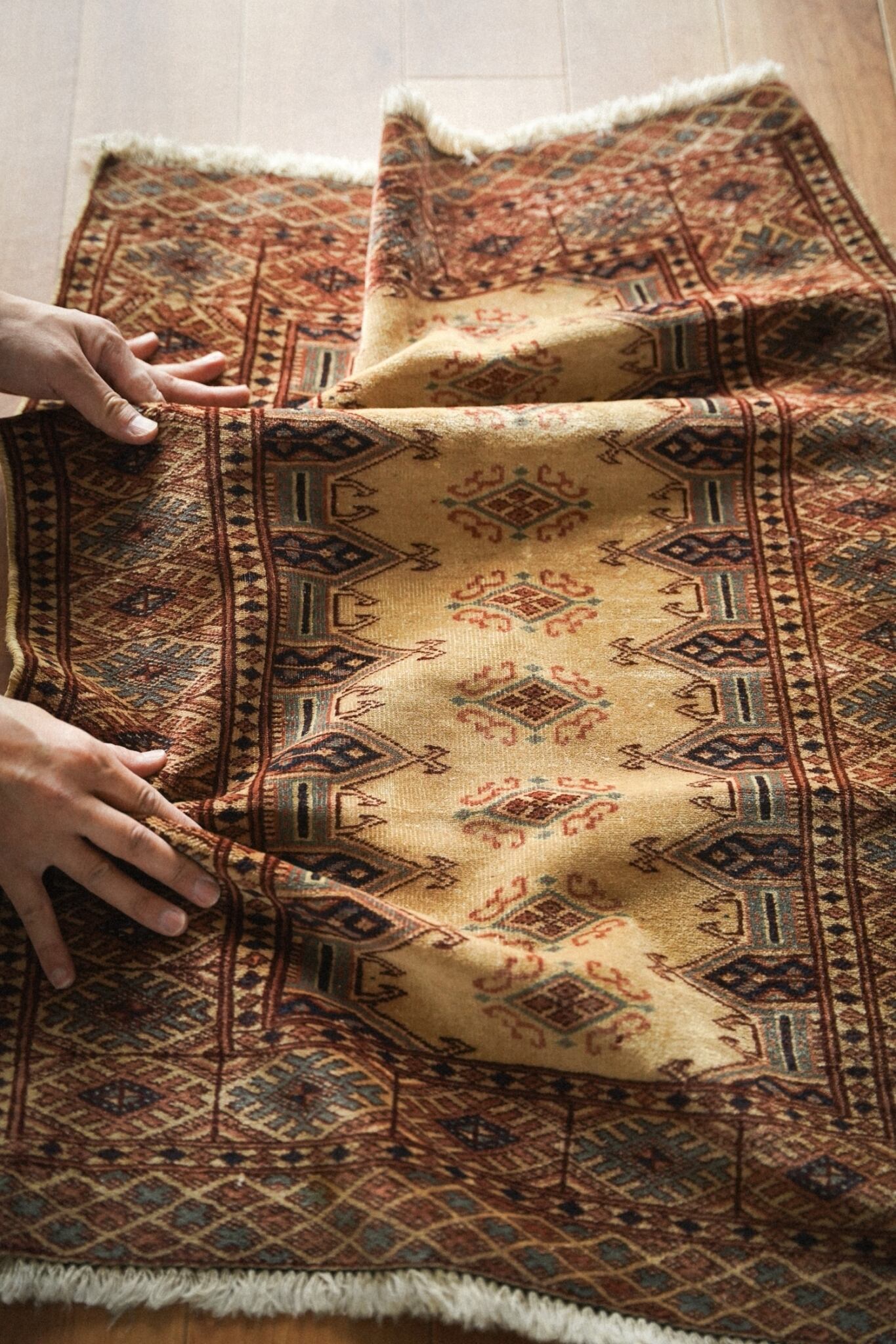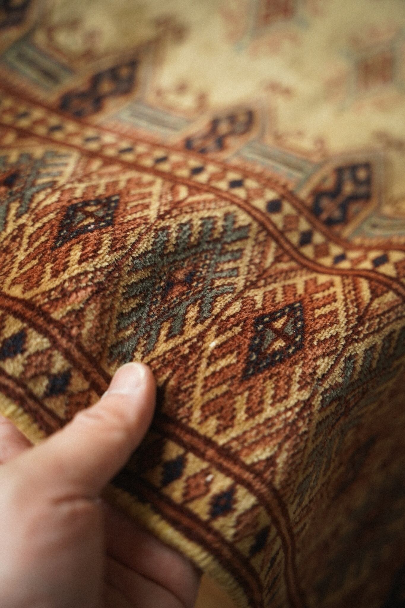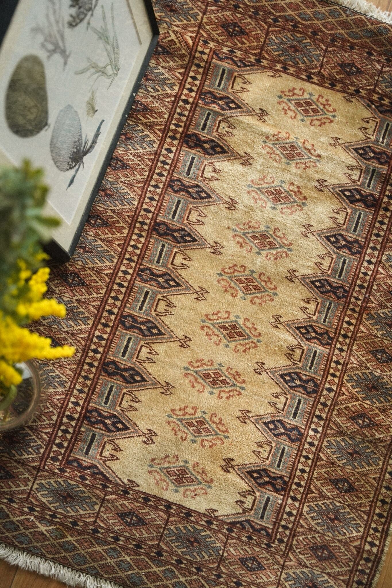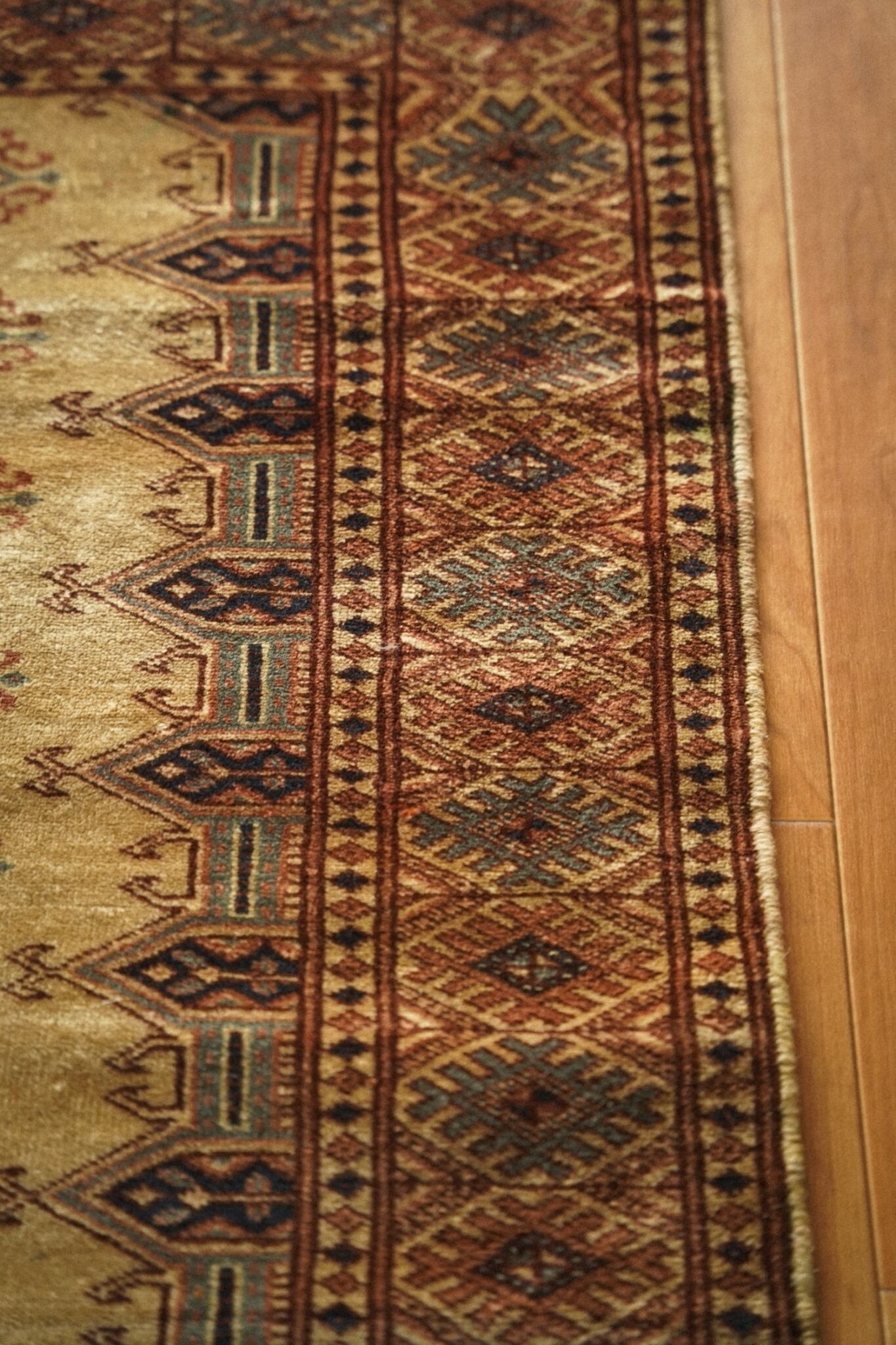 フィールドには雄羊の角が屋根に付いたモスクやフックドメダリオンが並び、ボーダー部分には細かな連続紋様が沢山織り込まれています。