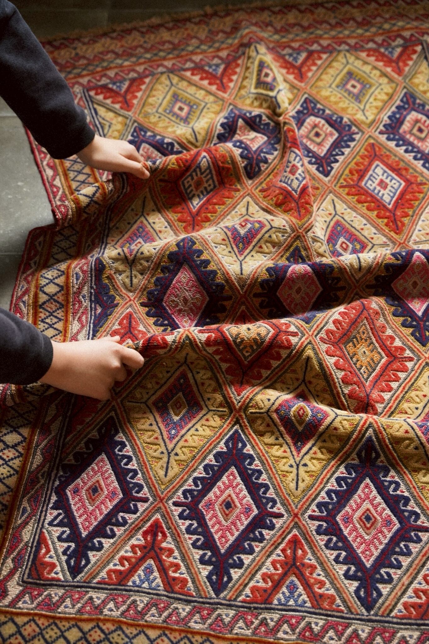 触り心地はしっとりとしており、キリム部分だけでなくパイル織との組み合わせのためチクチク感は全くありません。