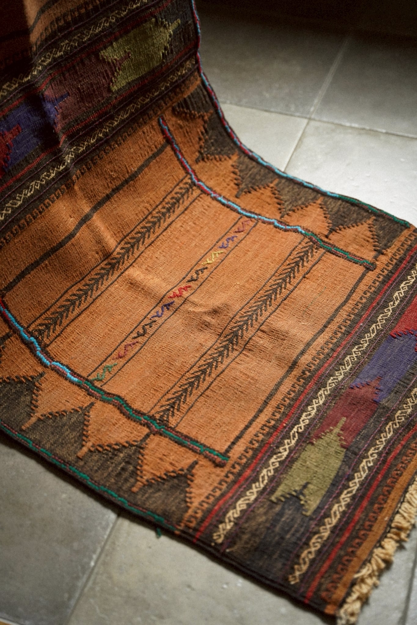 細長い形のソフレはこの上にお食事を載せて、みんなで食卓を囲む際に使われたキリムです。キャメルベースにグリーン、ブルー、レッド、ブラックで描かれたジグザグ紋様。