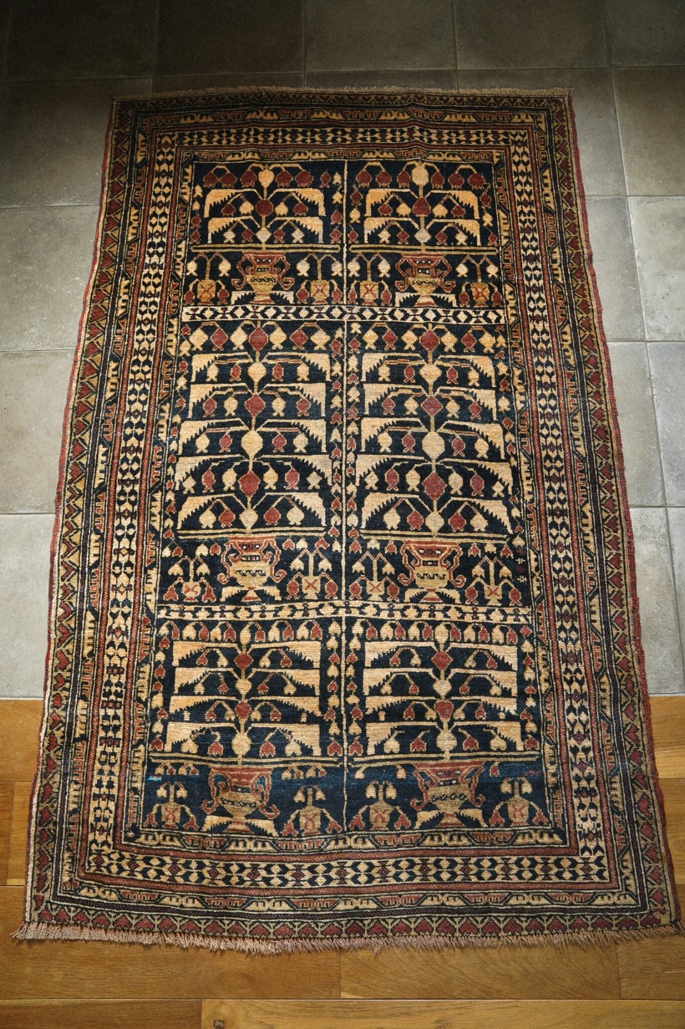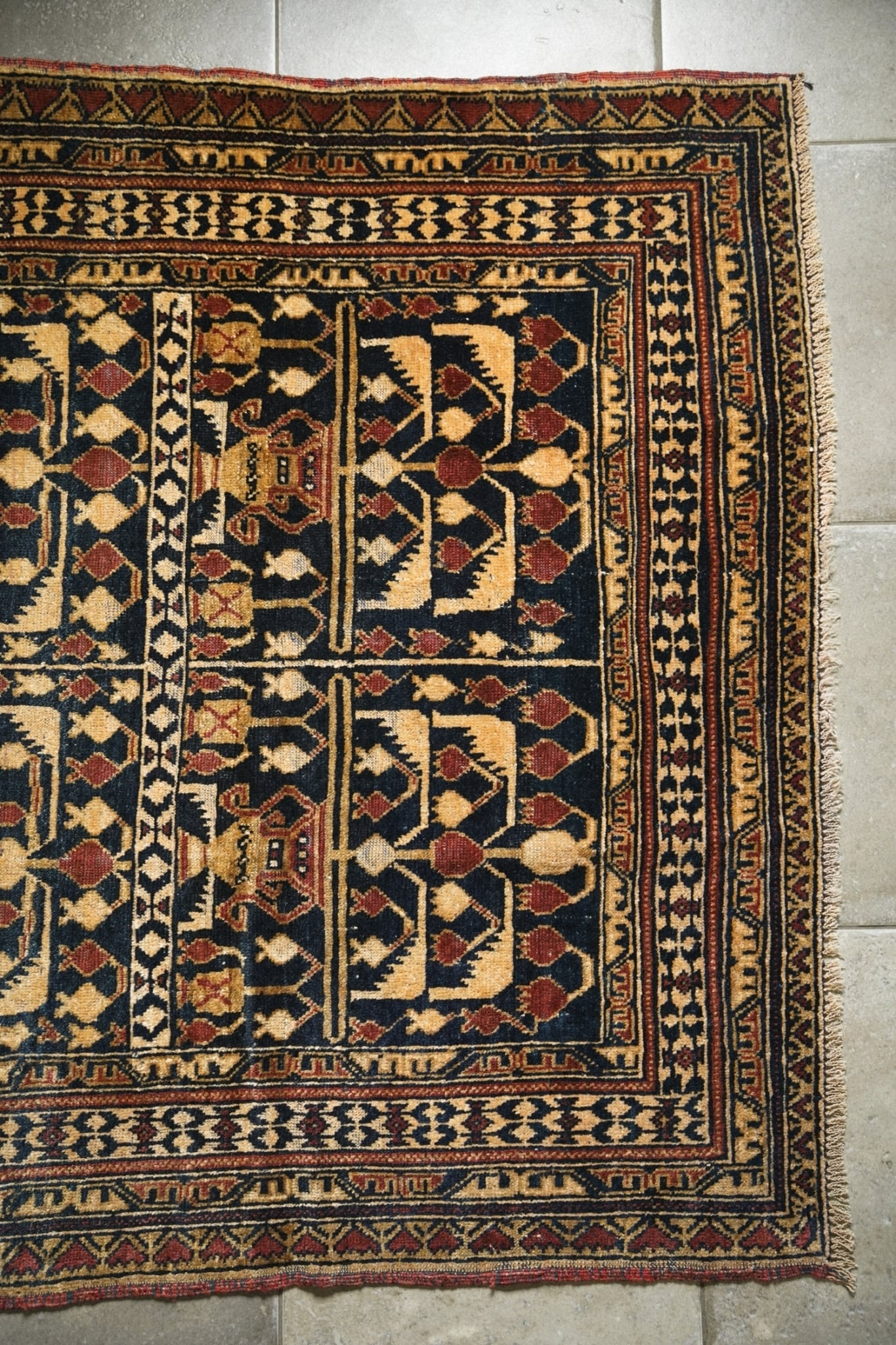 たくさんの実をつけるザクロは子孫繁栄を願うモチーフのため、家族の幸せを願って織られたラグだと思われます。