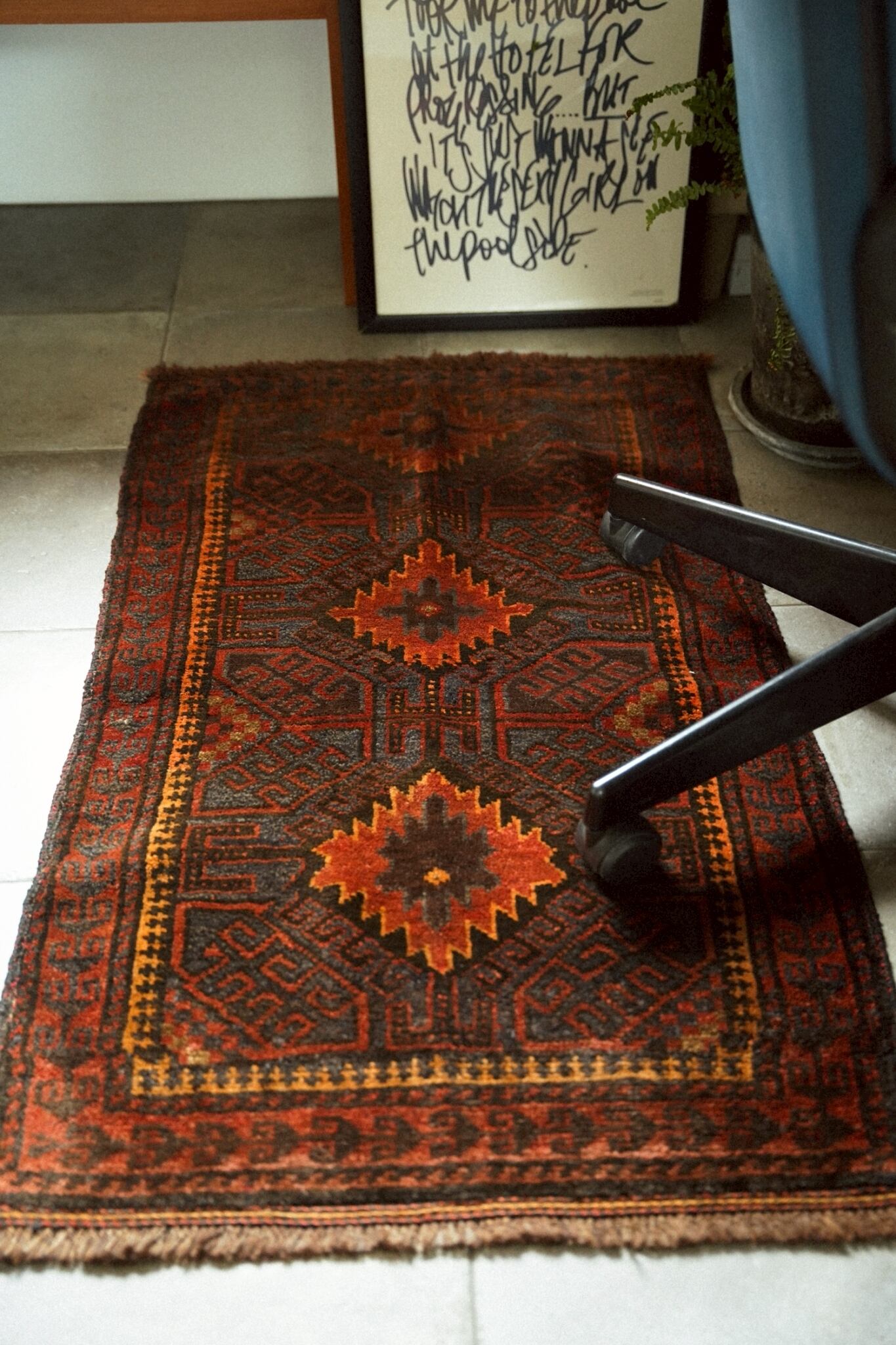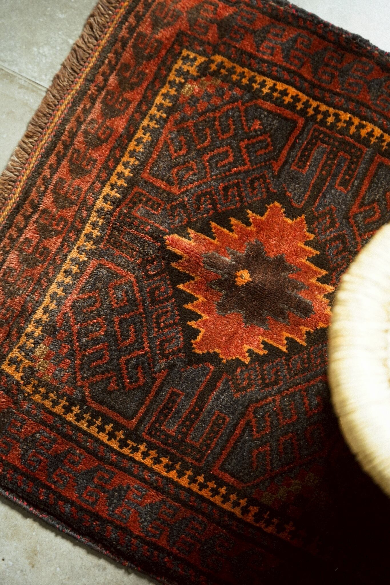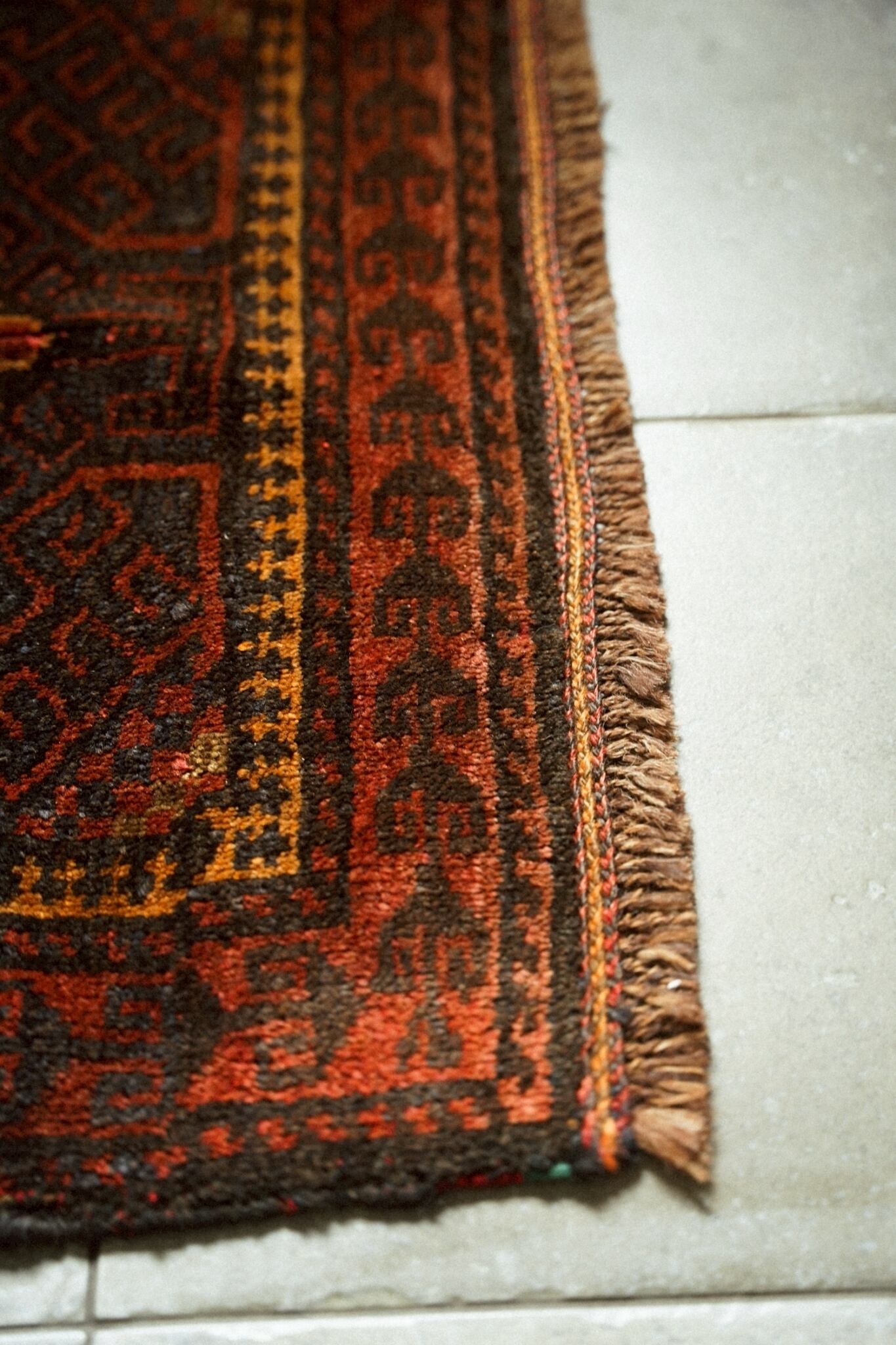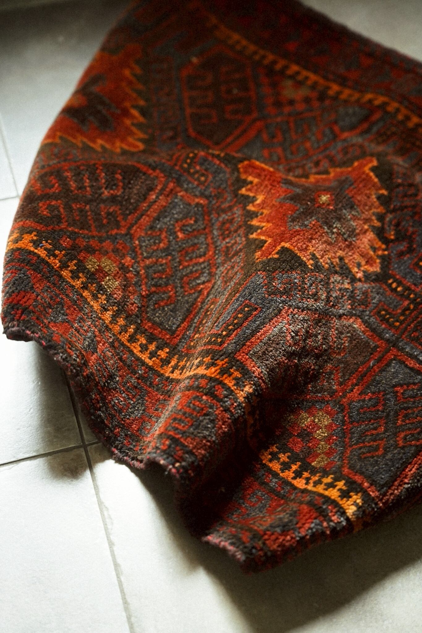 1980年代に織られたアフガニスタン産のマシュワニバルーチラグ。渋めの赤、ネイビー、テラコッタなどで描かれたギザギザとしたモチーフが力強いデザイン。目立ったダメージはなくグッドコンディション。手織りラグならではの歪みは多少ありますが使用に問題はございません。コンパクトなサイズで色んな場所に敷いて楽しめる一枚です。