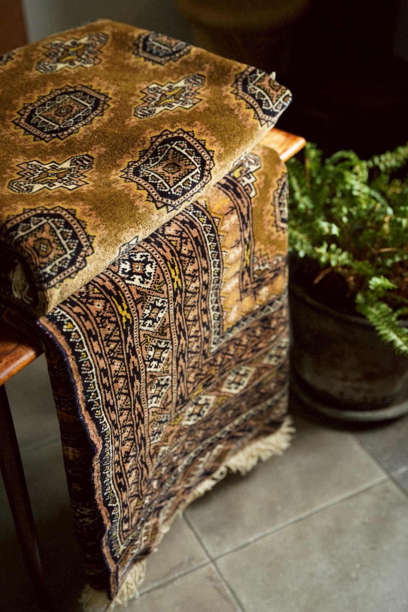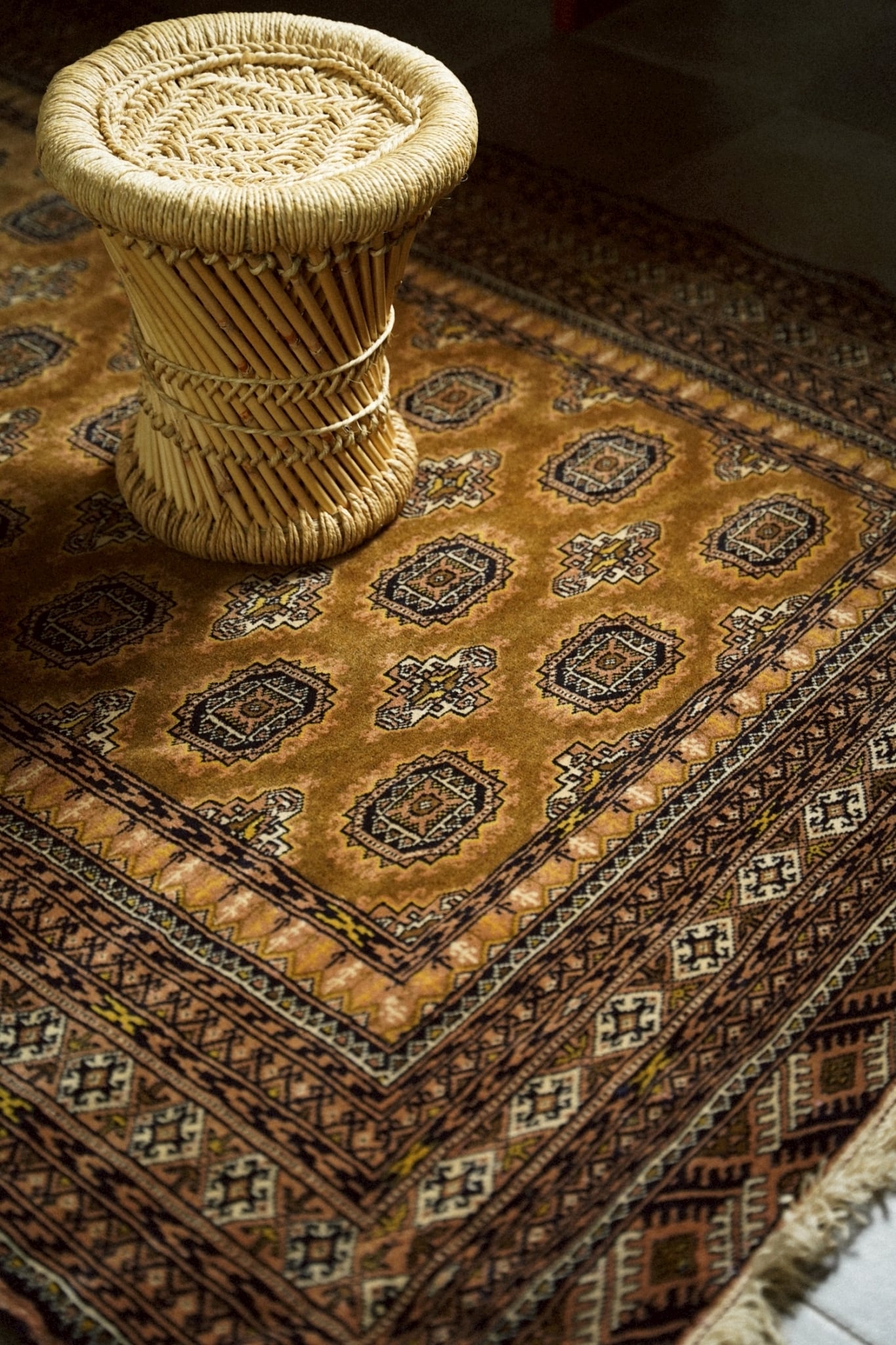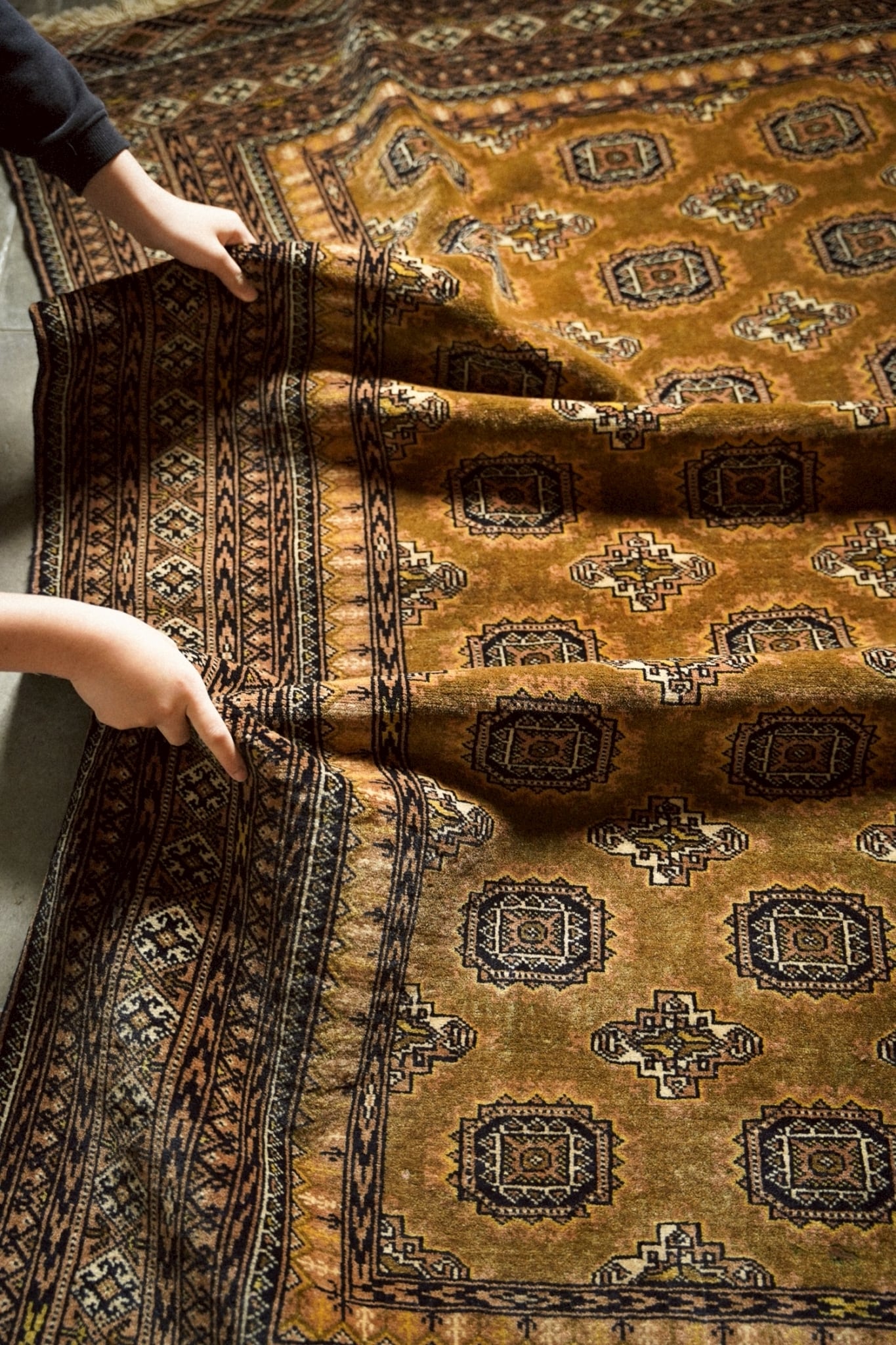トルクメンラグらしい密度の詰まった織りで、肌触りは滑らか。