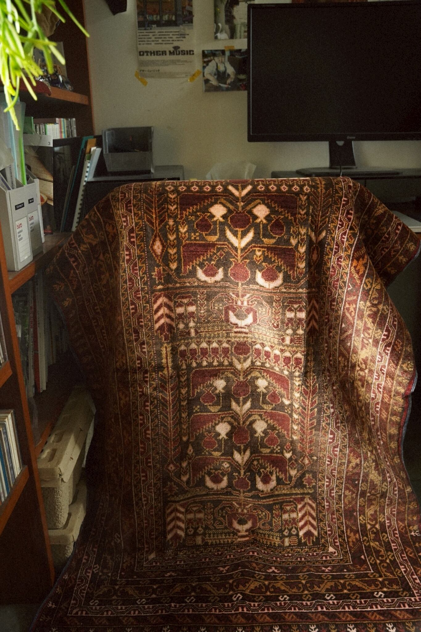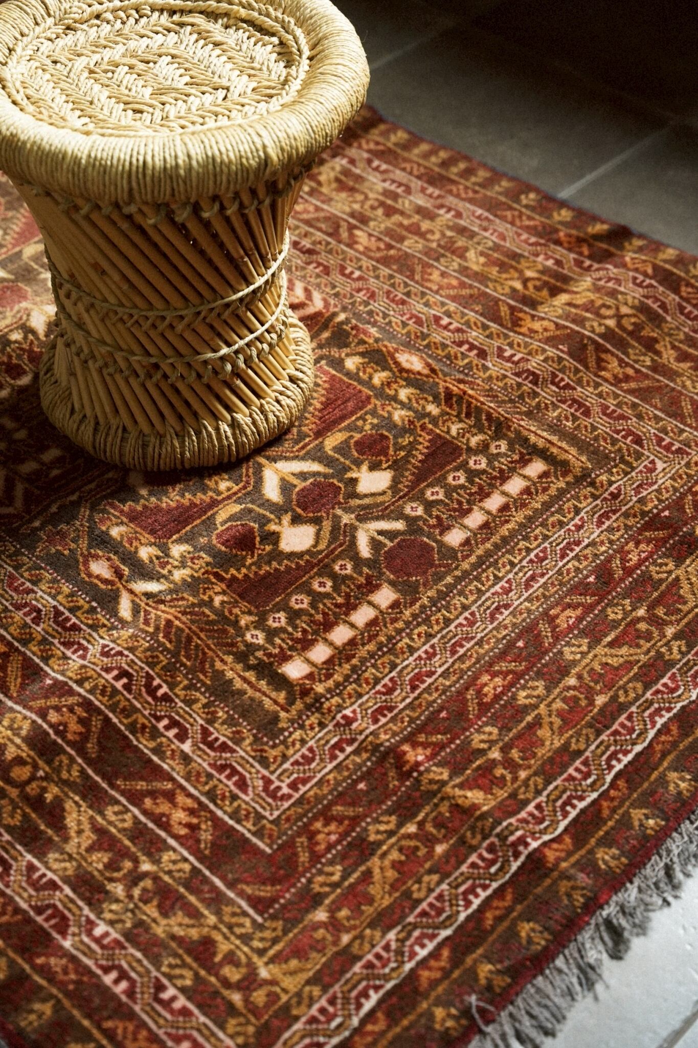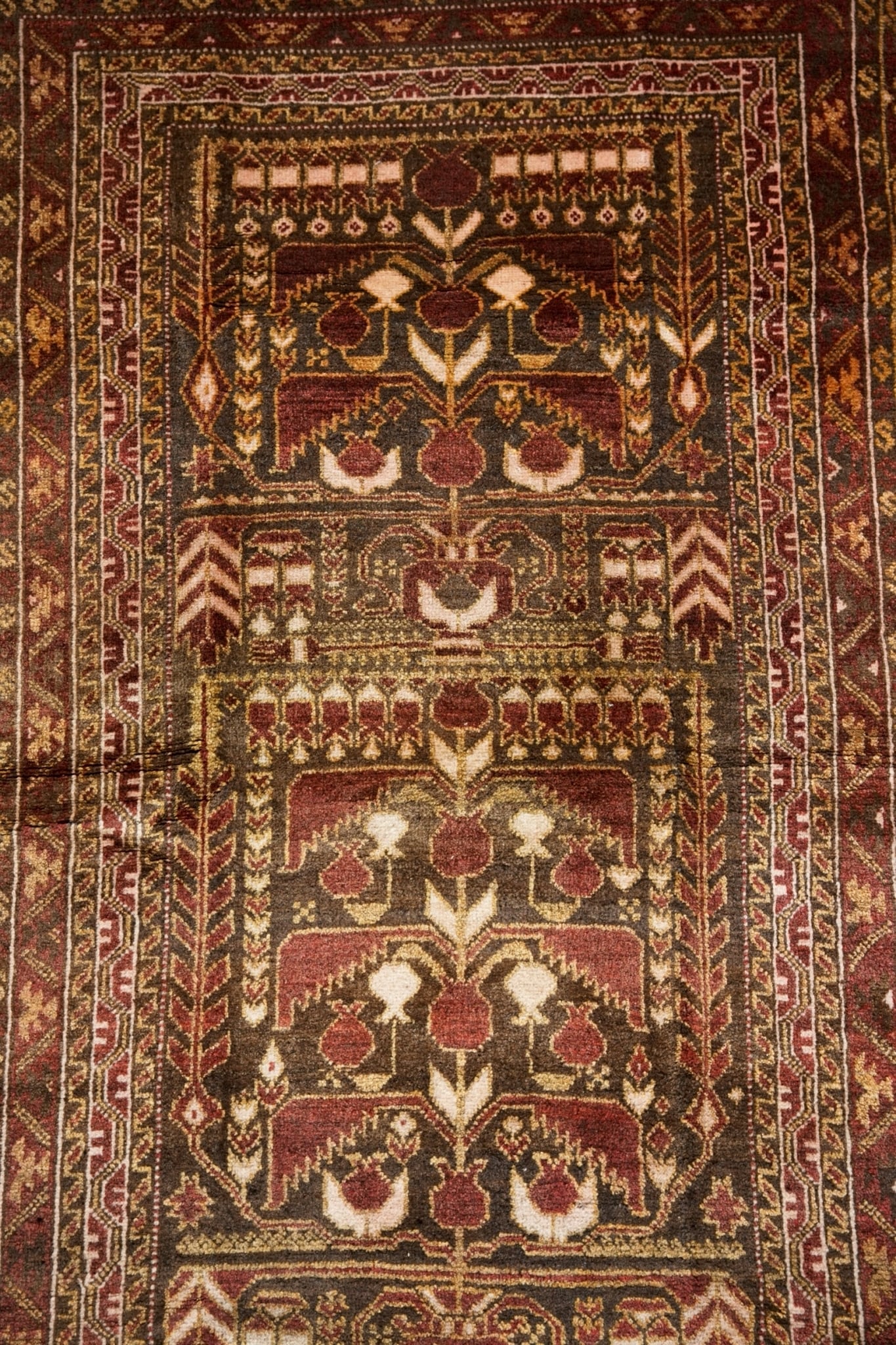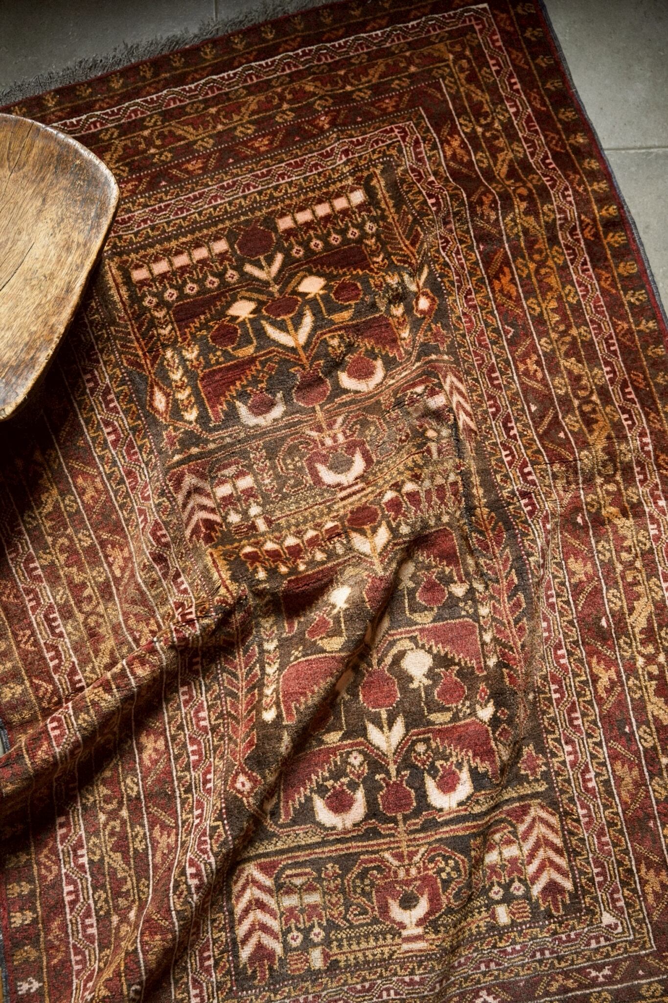 たくさんの実をつけるザクロは子孫繁栄を願うモチーフのため、家族の幸せを願って織られたラグだと思われます。