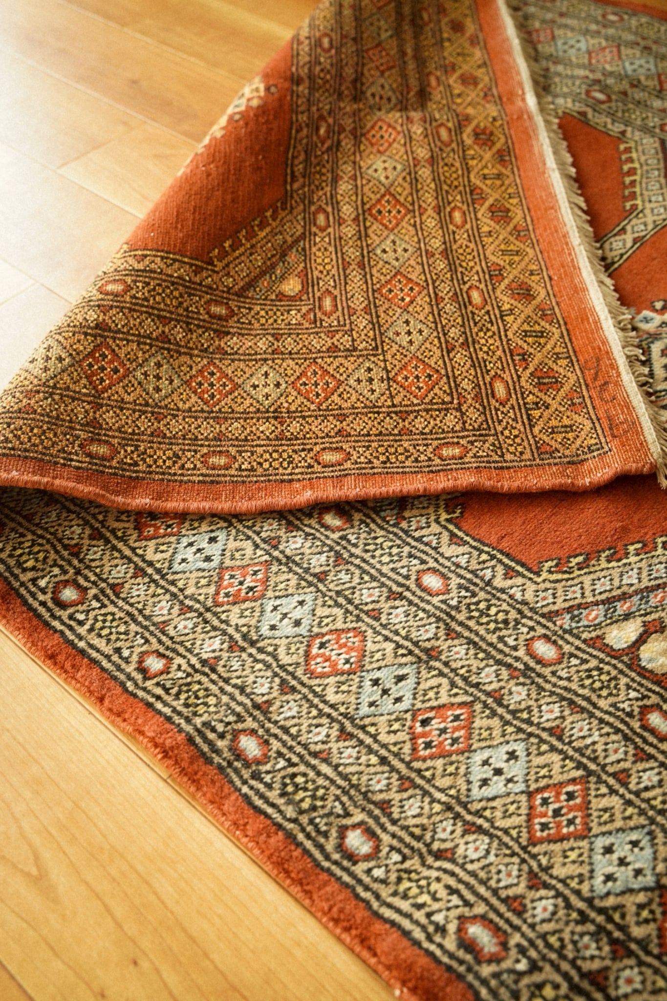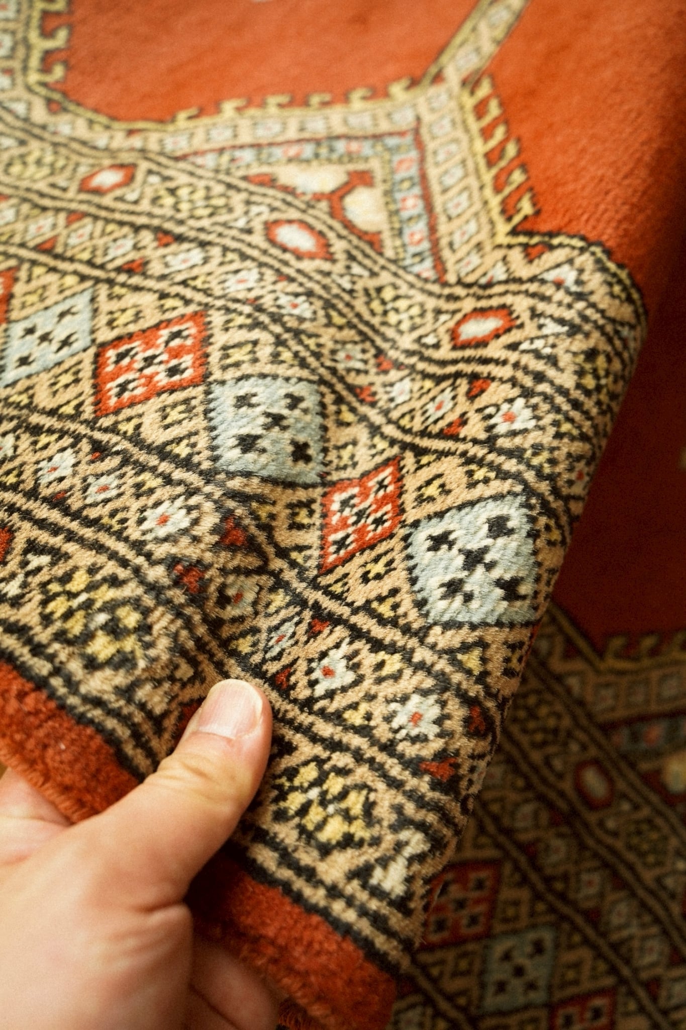 真ん中に5つ並んだシャンデリアのような菱形メダリオンを筆頭にボーダーも色彩豊かに描かれた細かな連続紋様が織り込まれています。