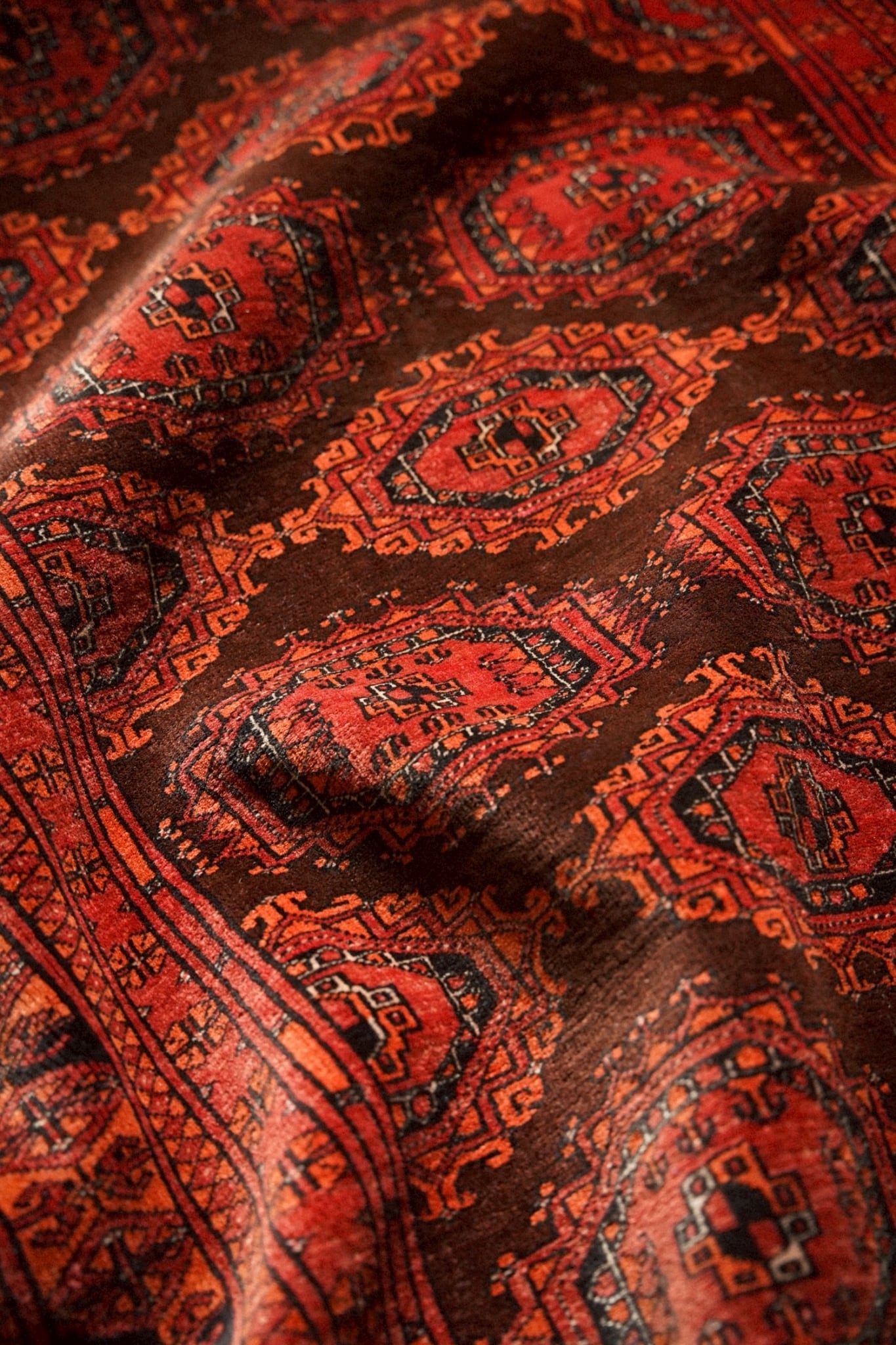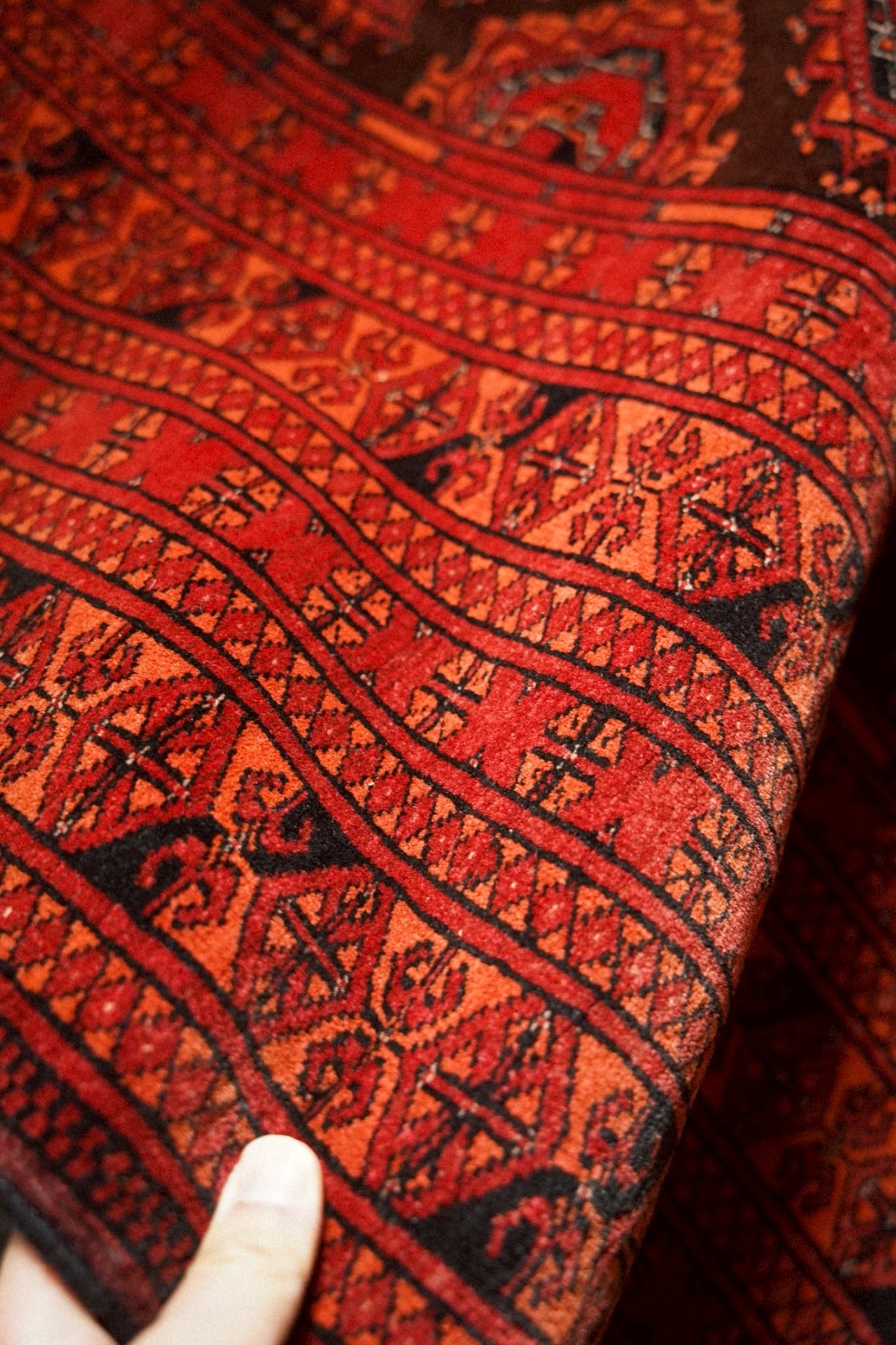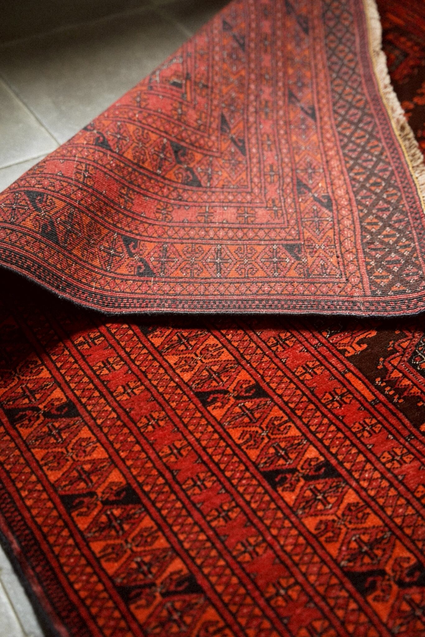 トルクメンラグらしい密度の詰まった織りで、肌触りは滑らか。