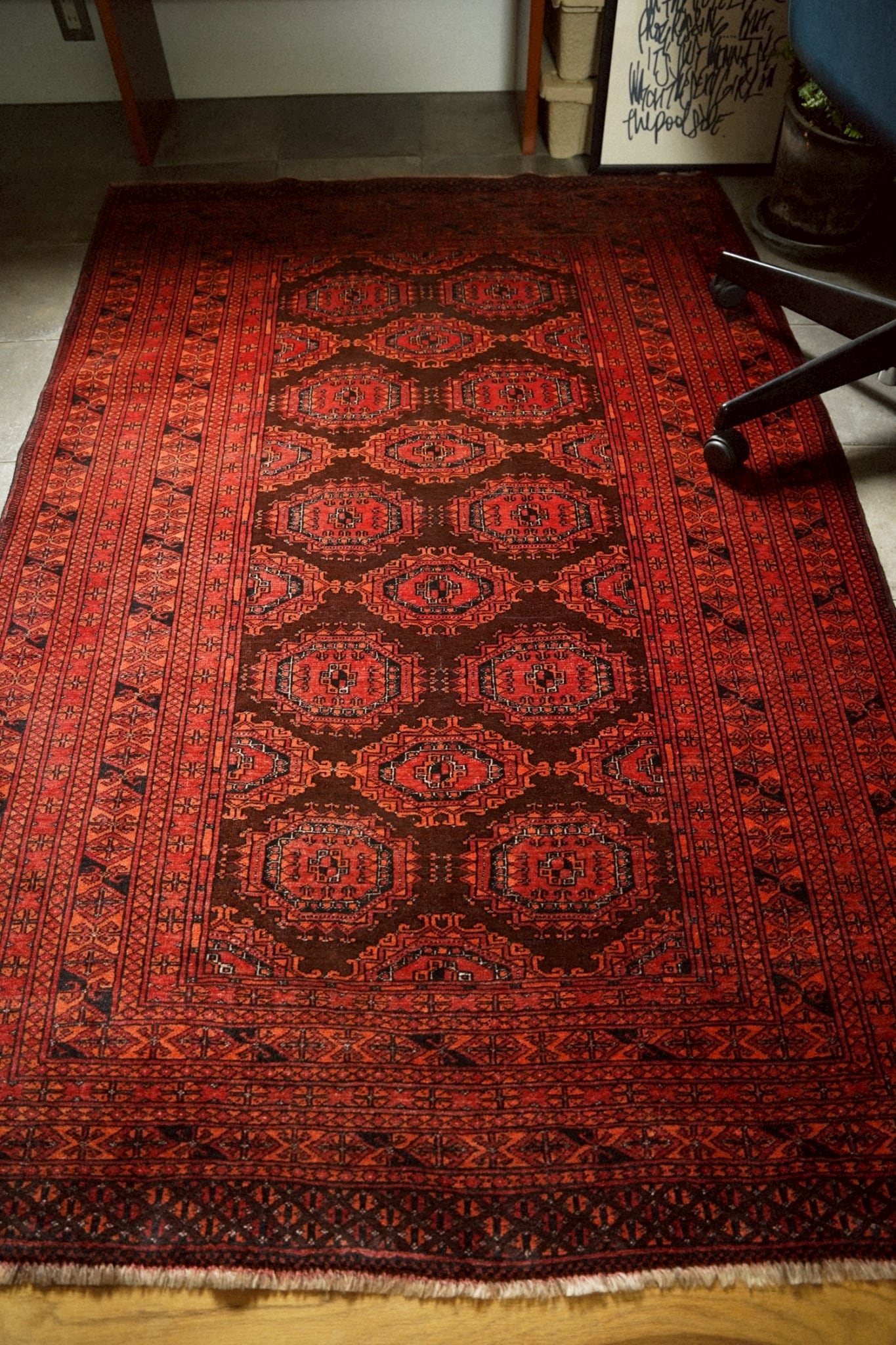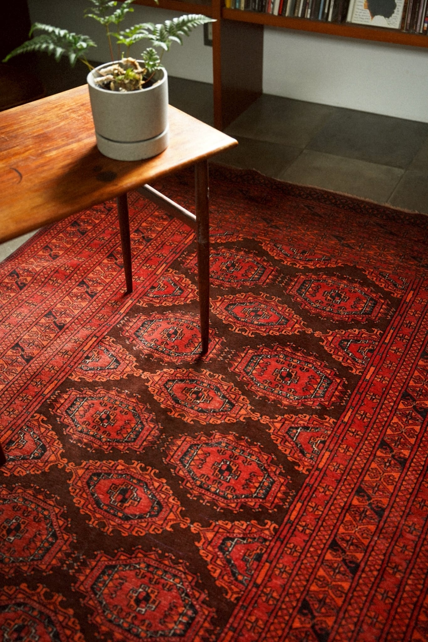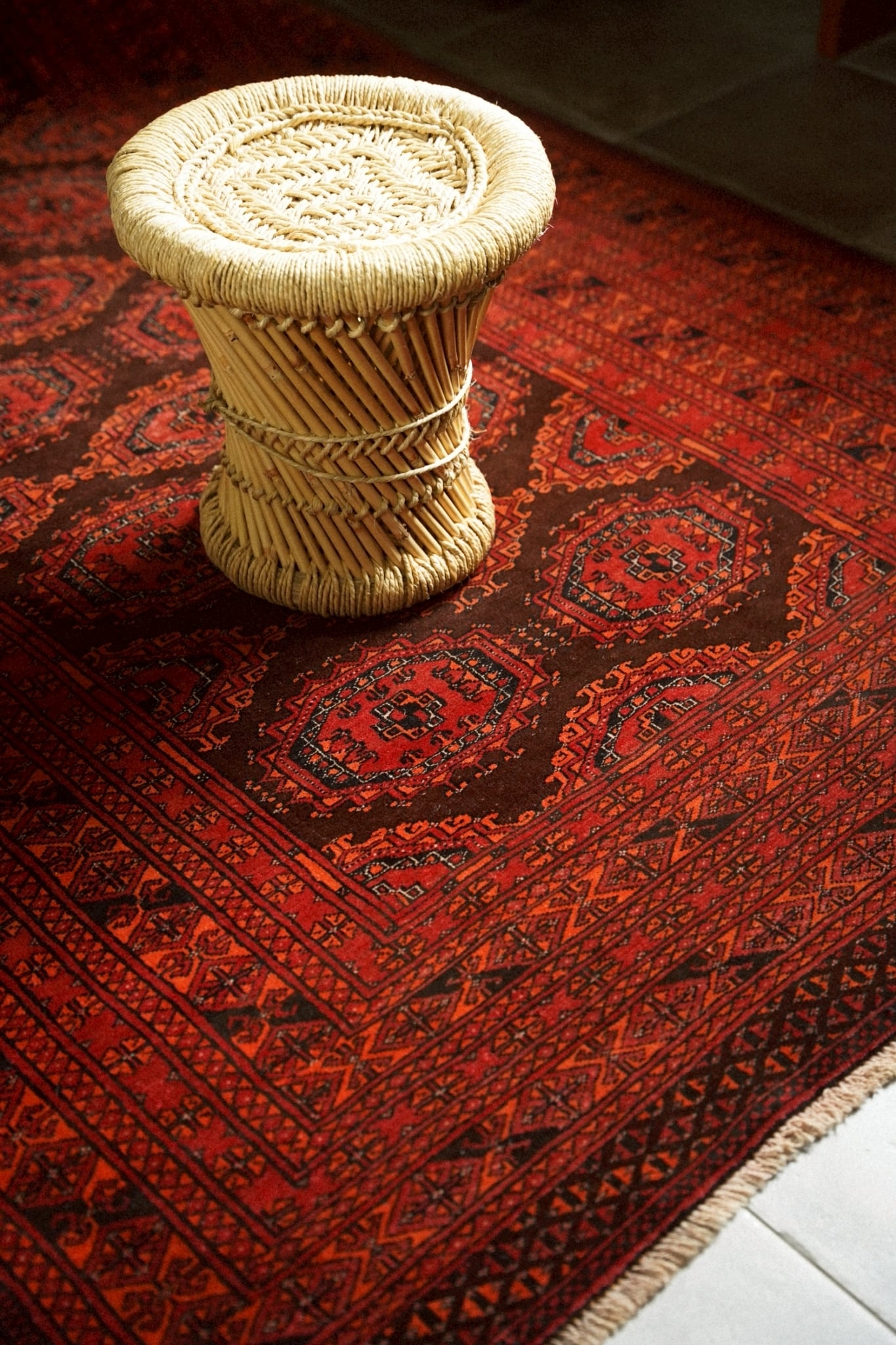 トルクメンラグらしい密度の詰まった織りで、肌触りは滑らか。