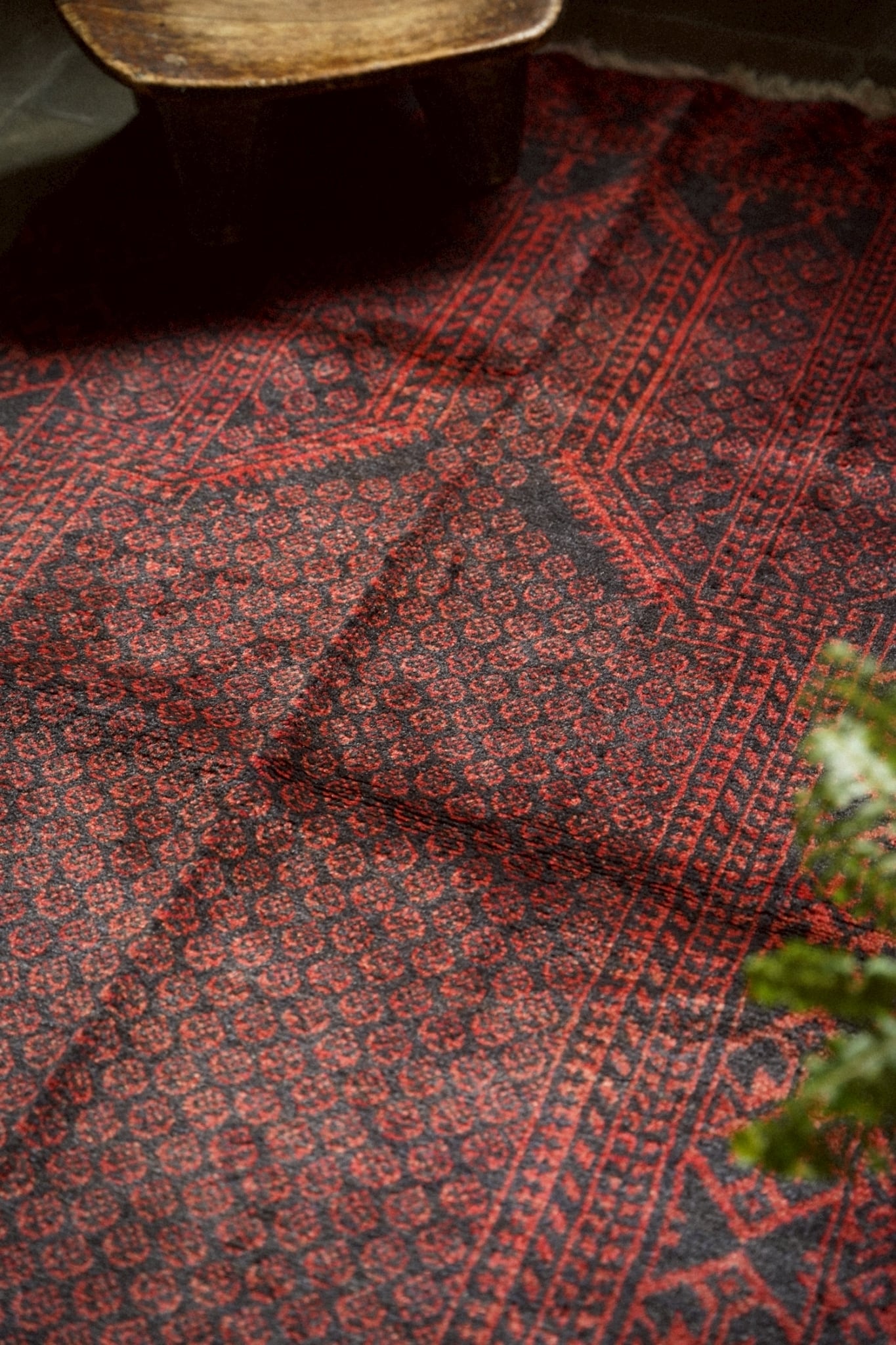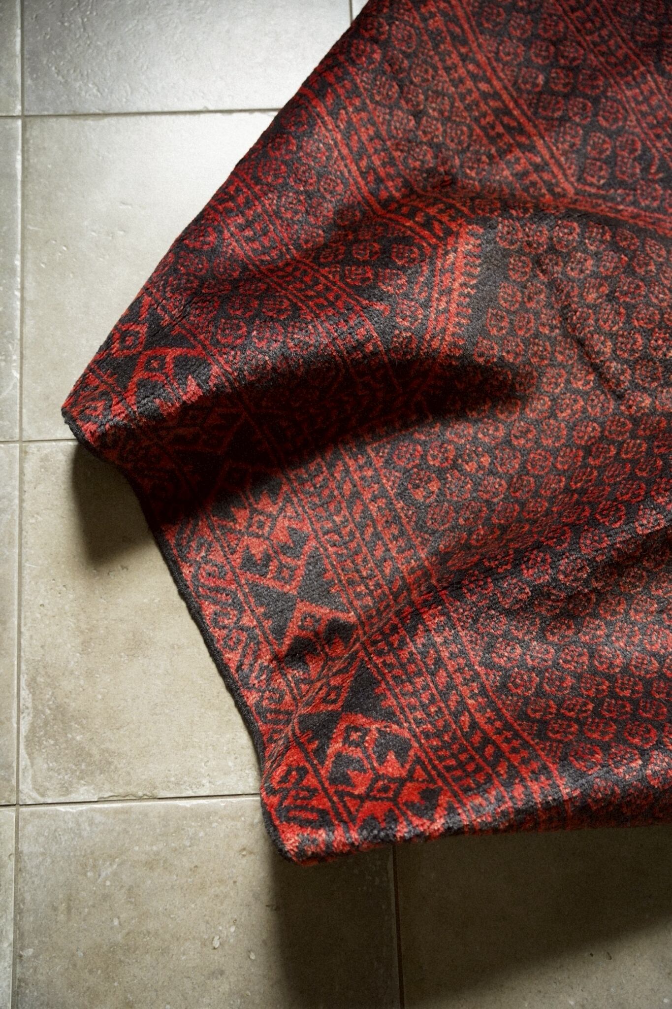 深い色味のレッドベース×ネイビーのシンプルな配色で描かれた細かなモチーフが美しい一枚。