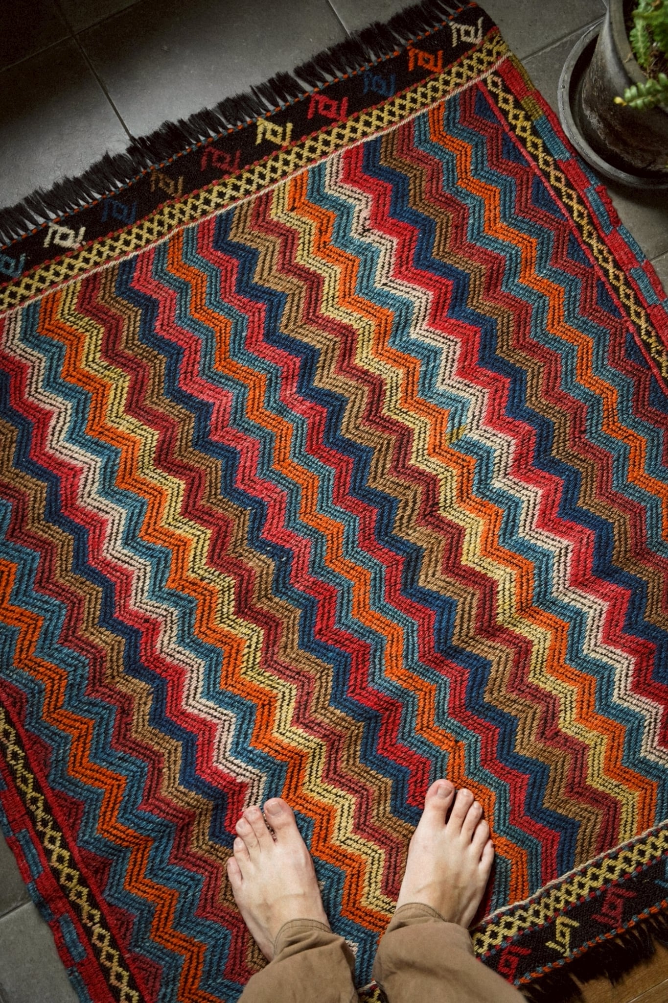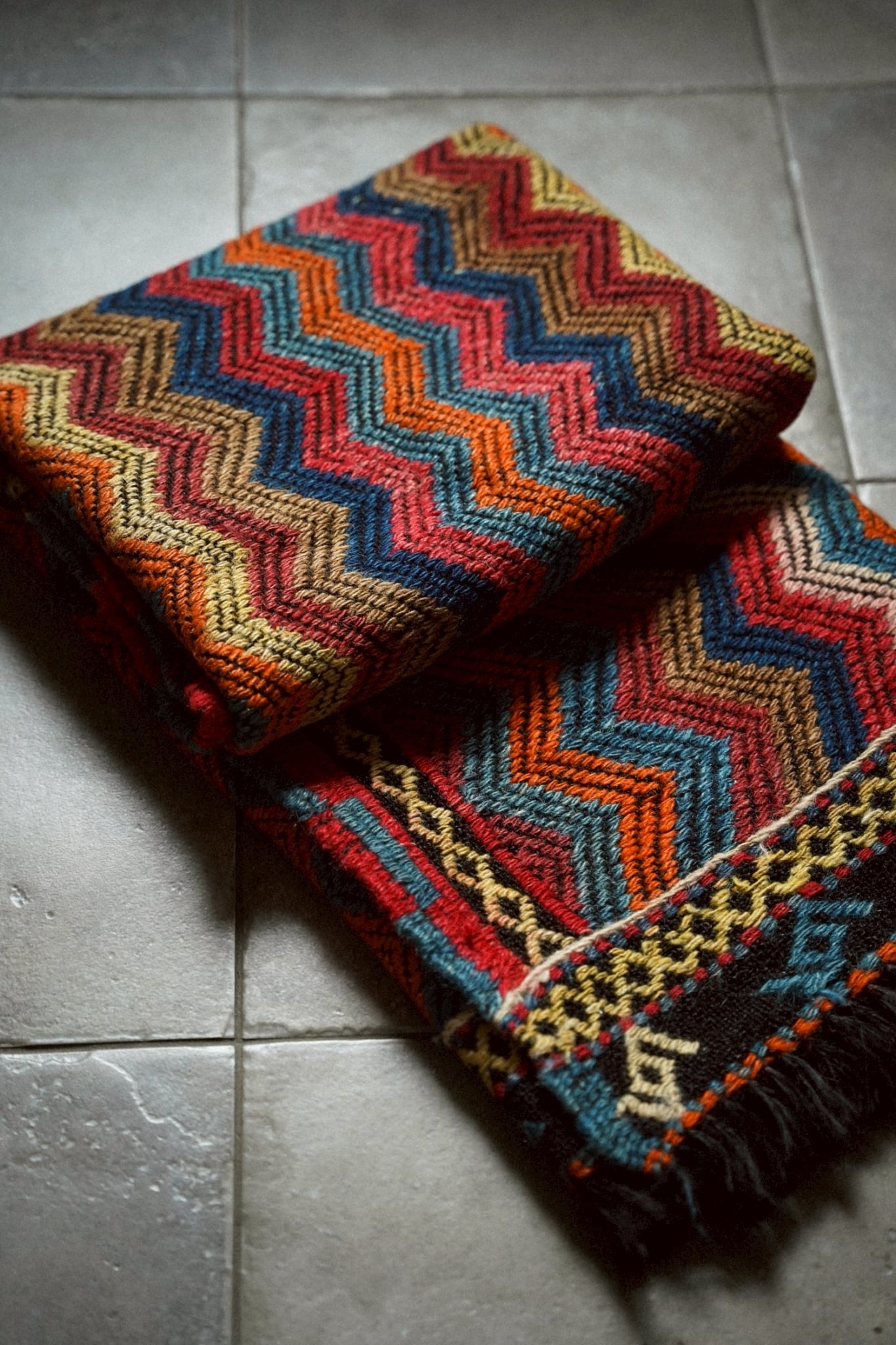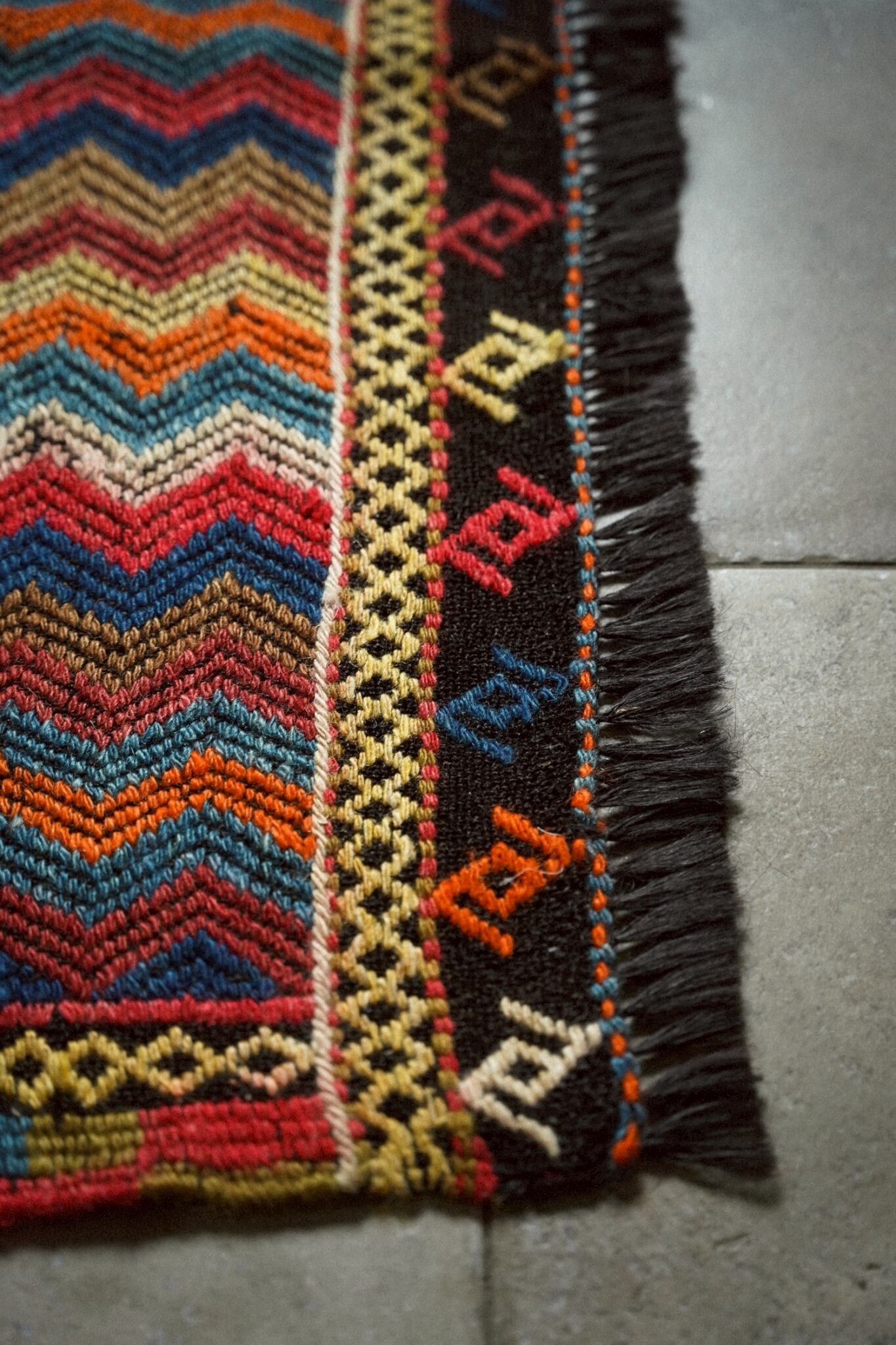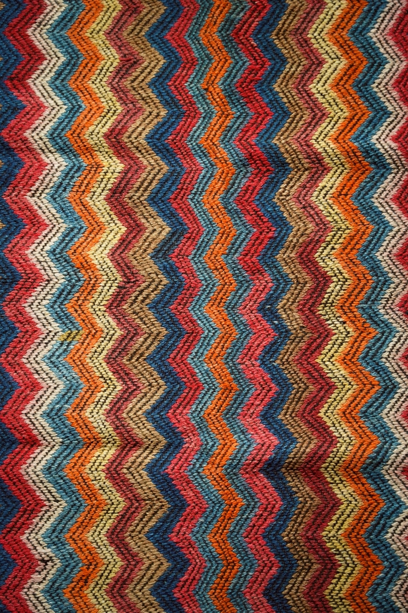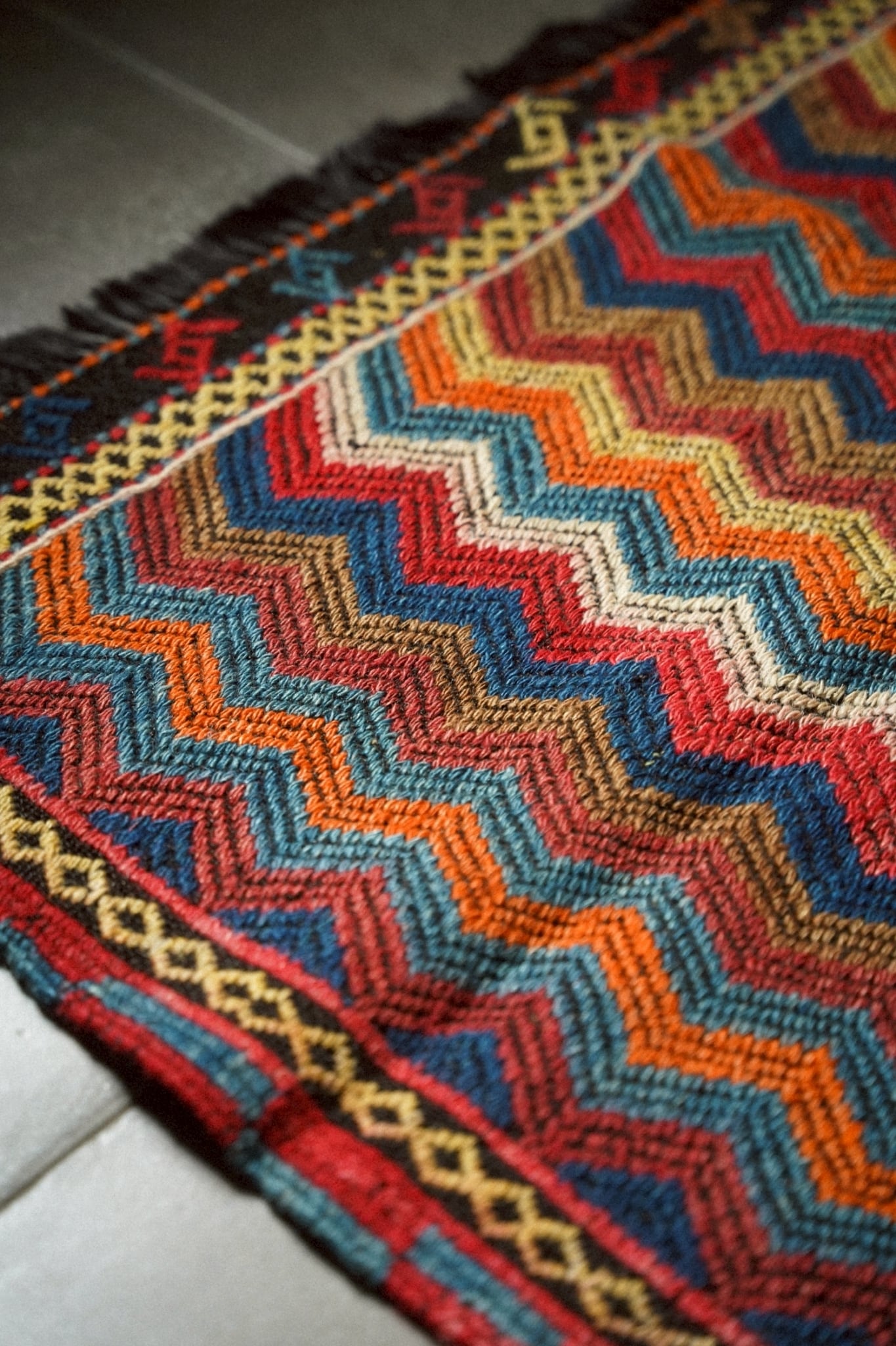 鮮やかな色彩と力強いジグザグ模様が目を引く伝統的な手織りキリム。