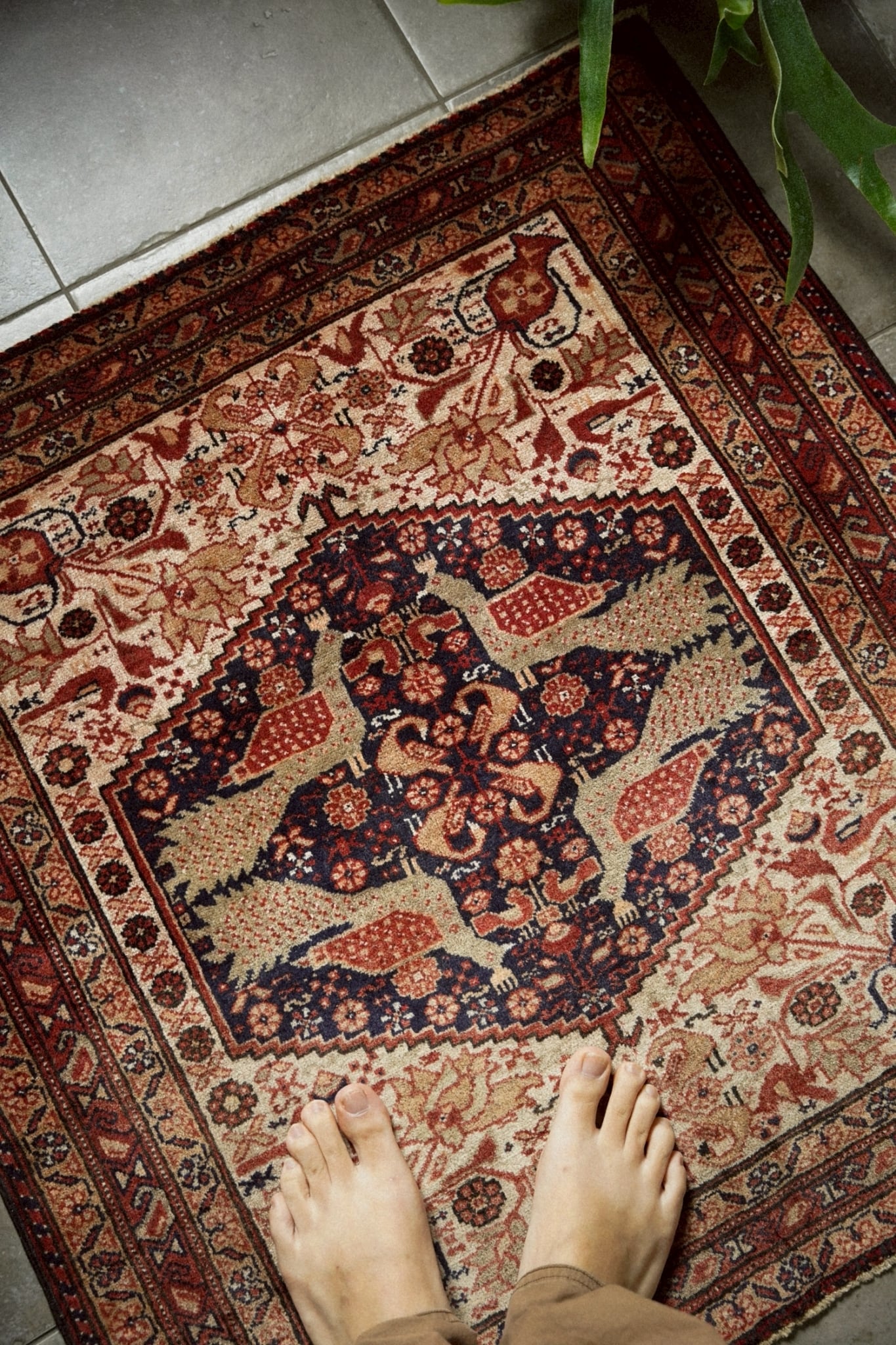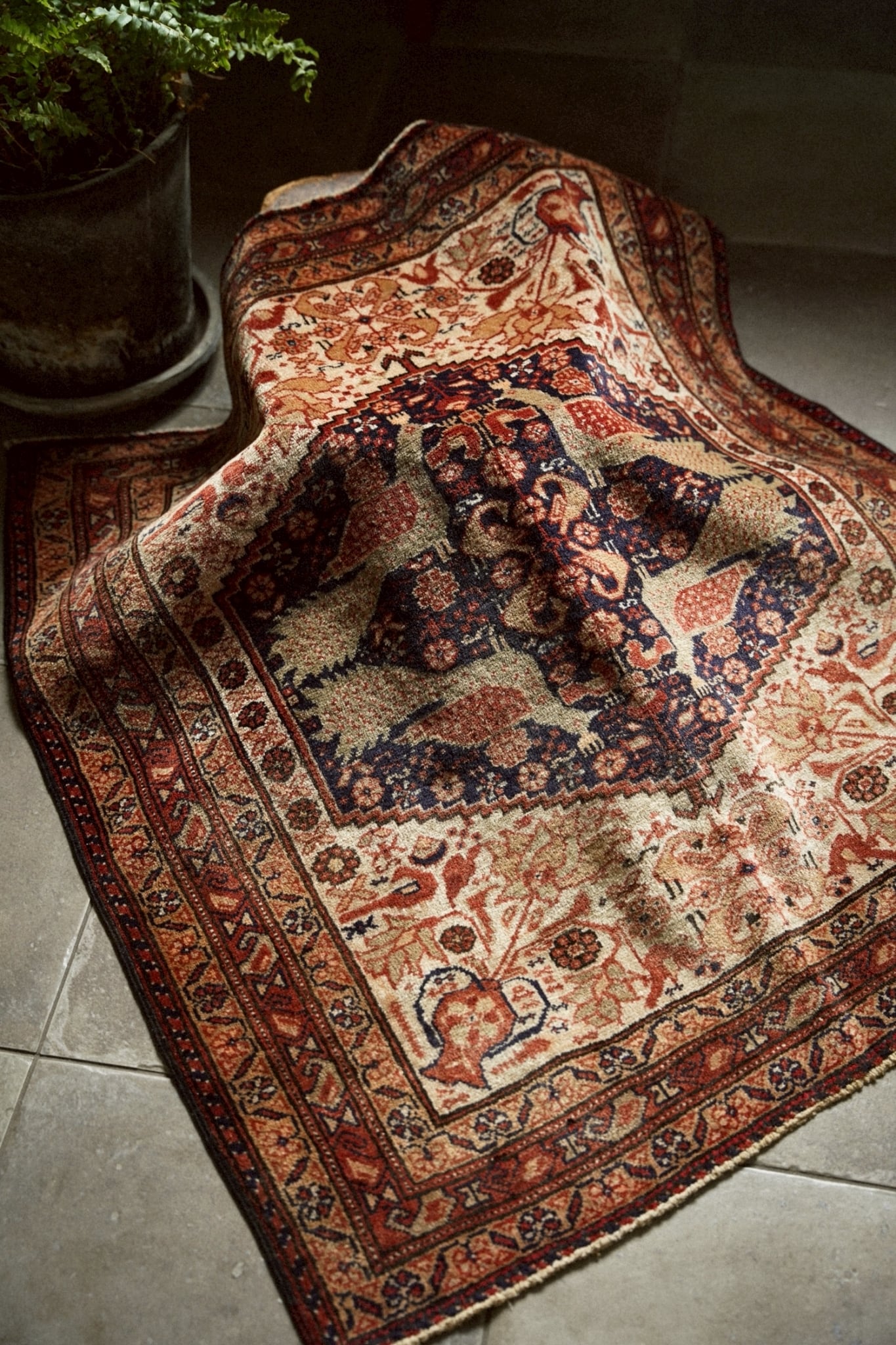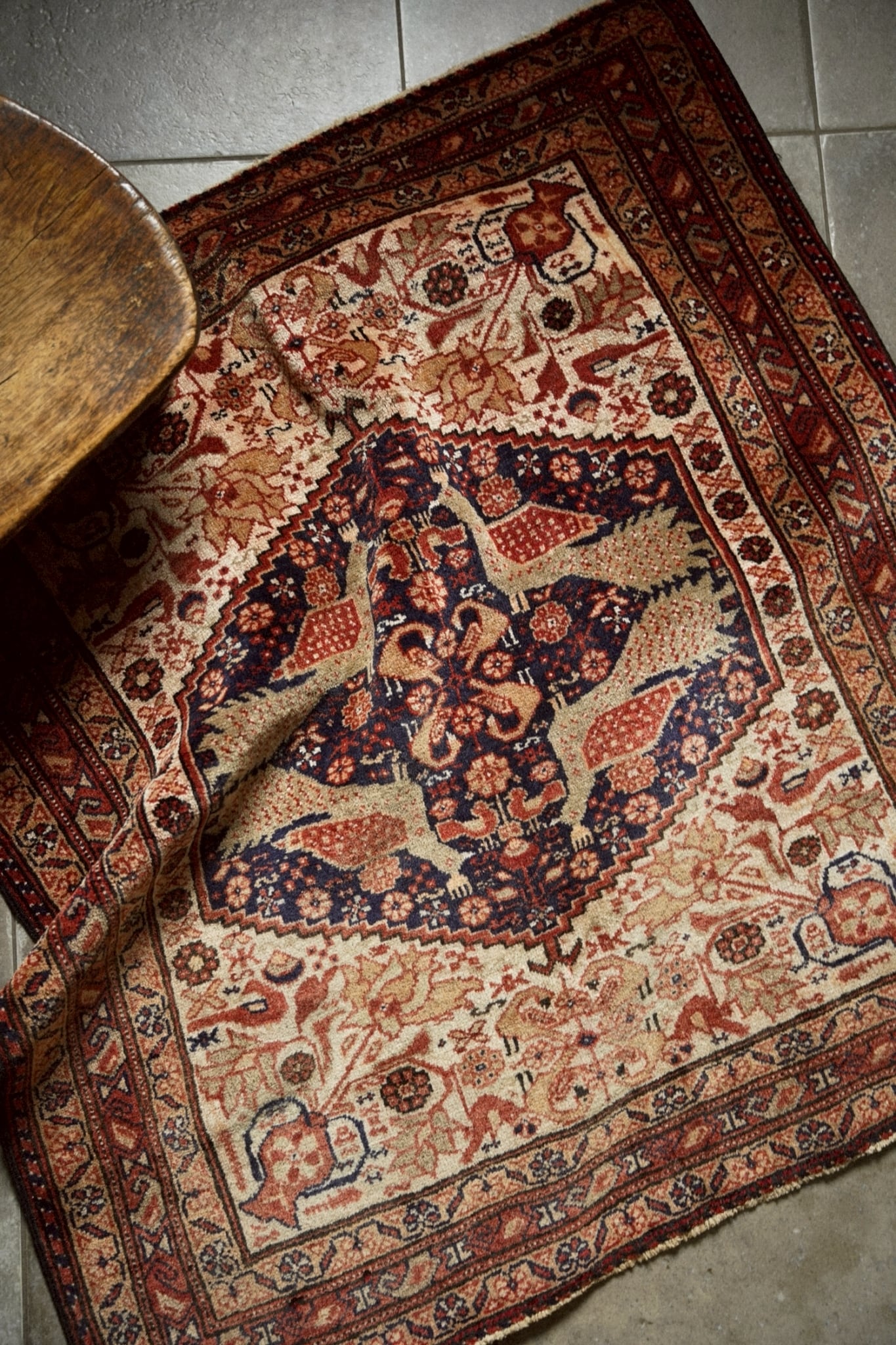 中央のメダリオンには4羽の向かい合う孔雀が織り込まれ、フィールドには小さな鳥、ボテやお花、花瓶など美しいモチーフがちりばめられています。