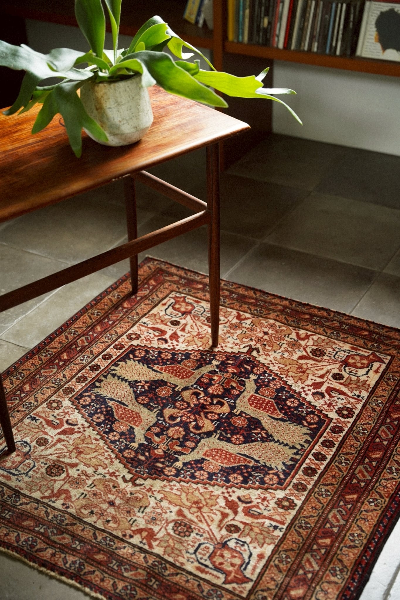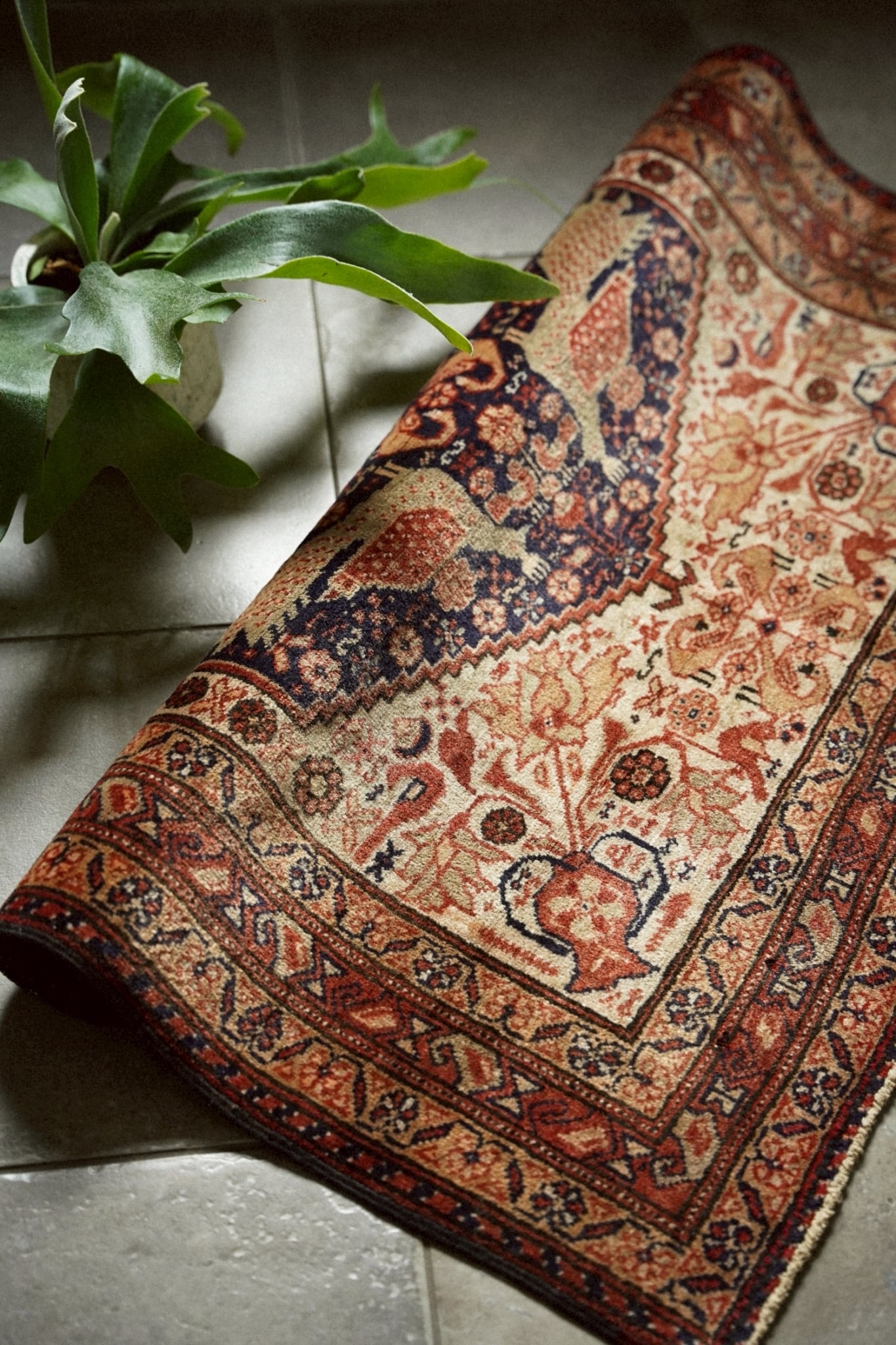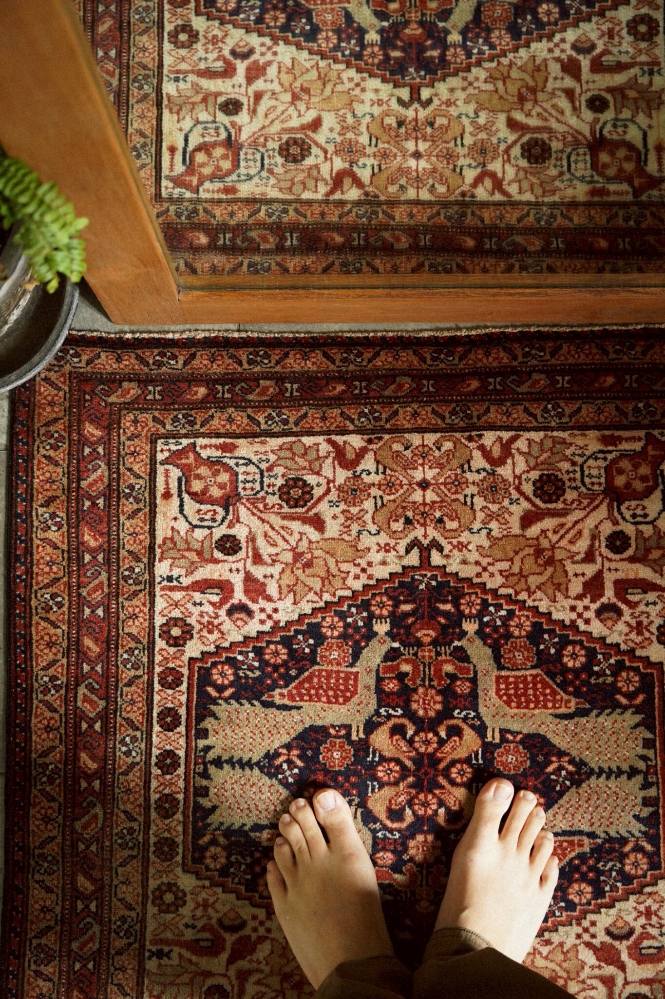 中央のメダリオンには4羽の向かい合う孔雀が織り込まれ、フィールドには小さな鳥、ボテやお花、花瓶など美しいモチーフがちりばめられています。