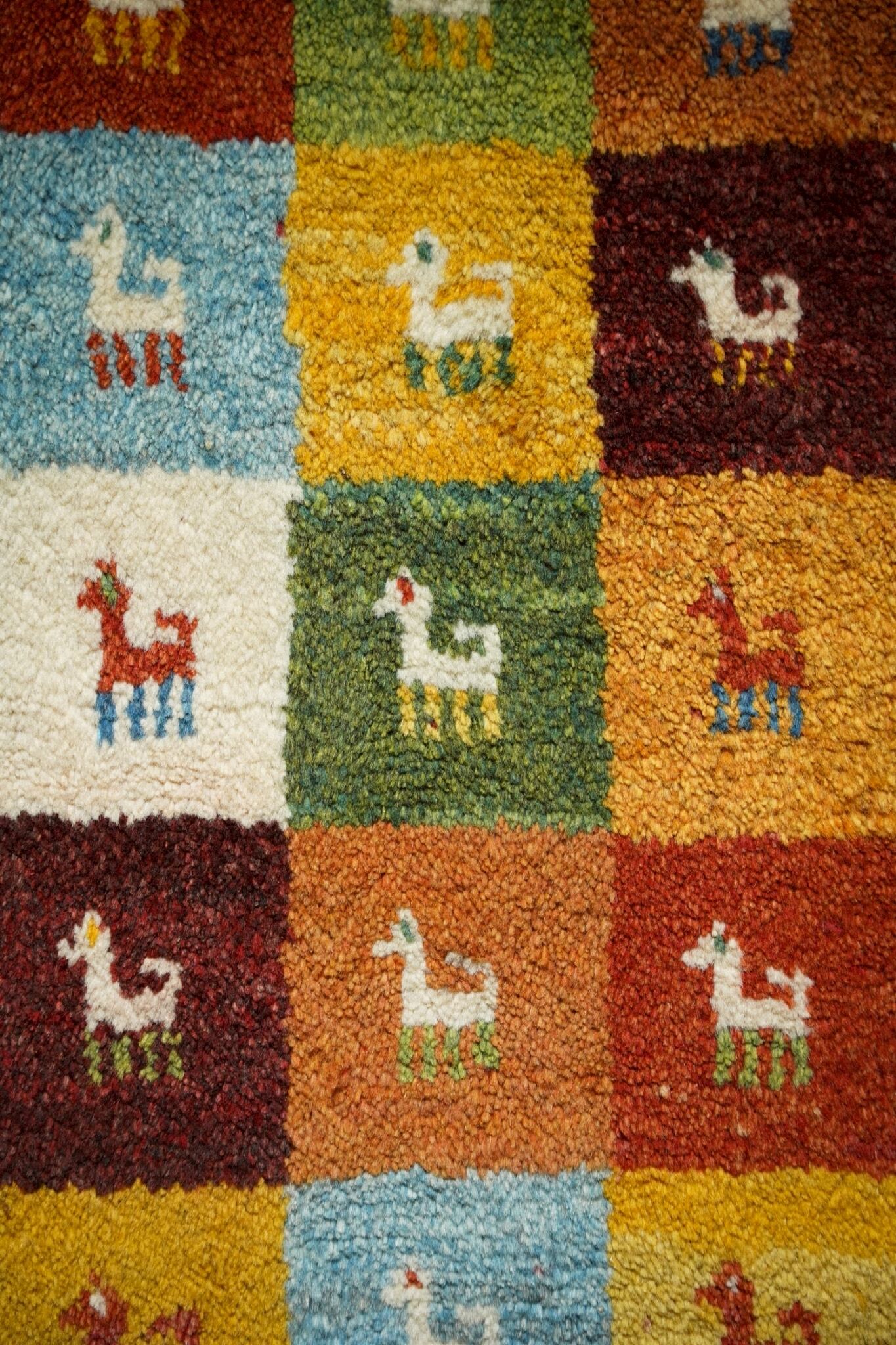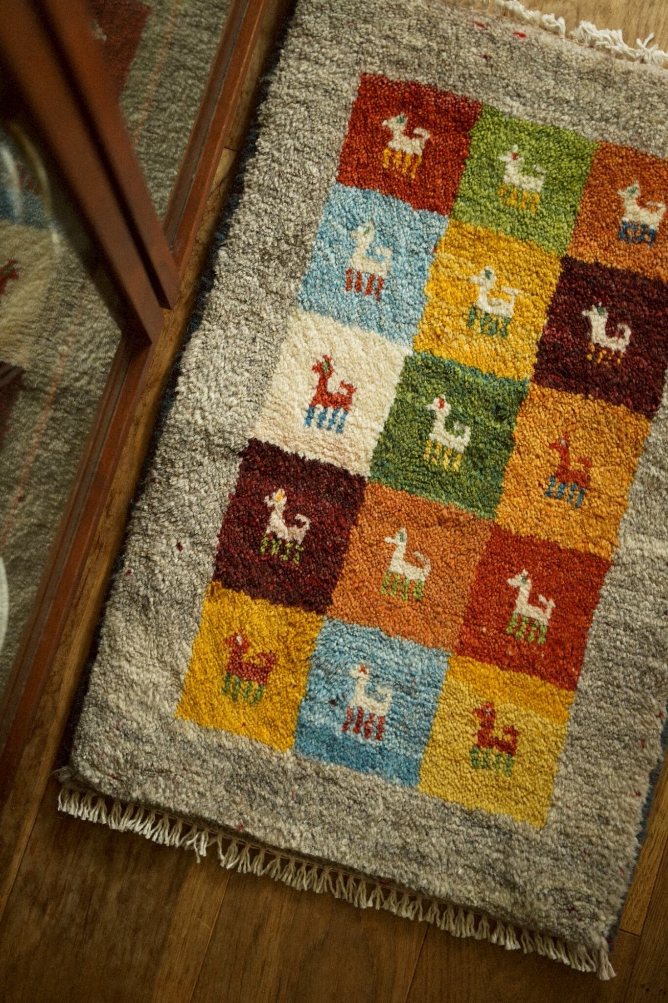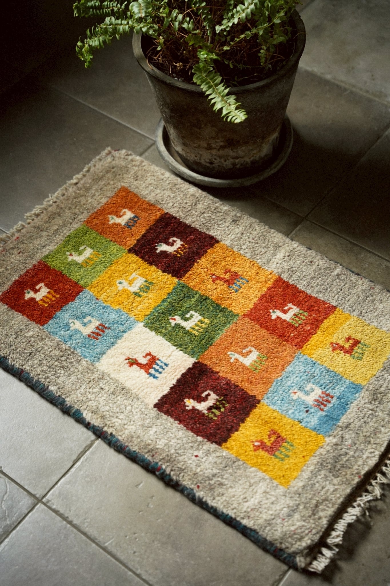 目立ったダメージもなくグッドコンディション。ギャッベの特徴でもあるしっかりとした毛足で踏み心地も柔らかく、リビングや玄関マットとしてもぴったり♪