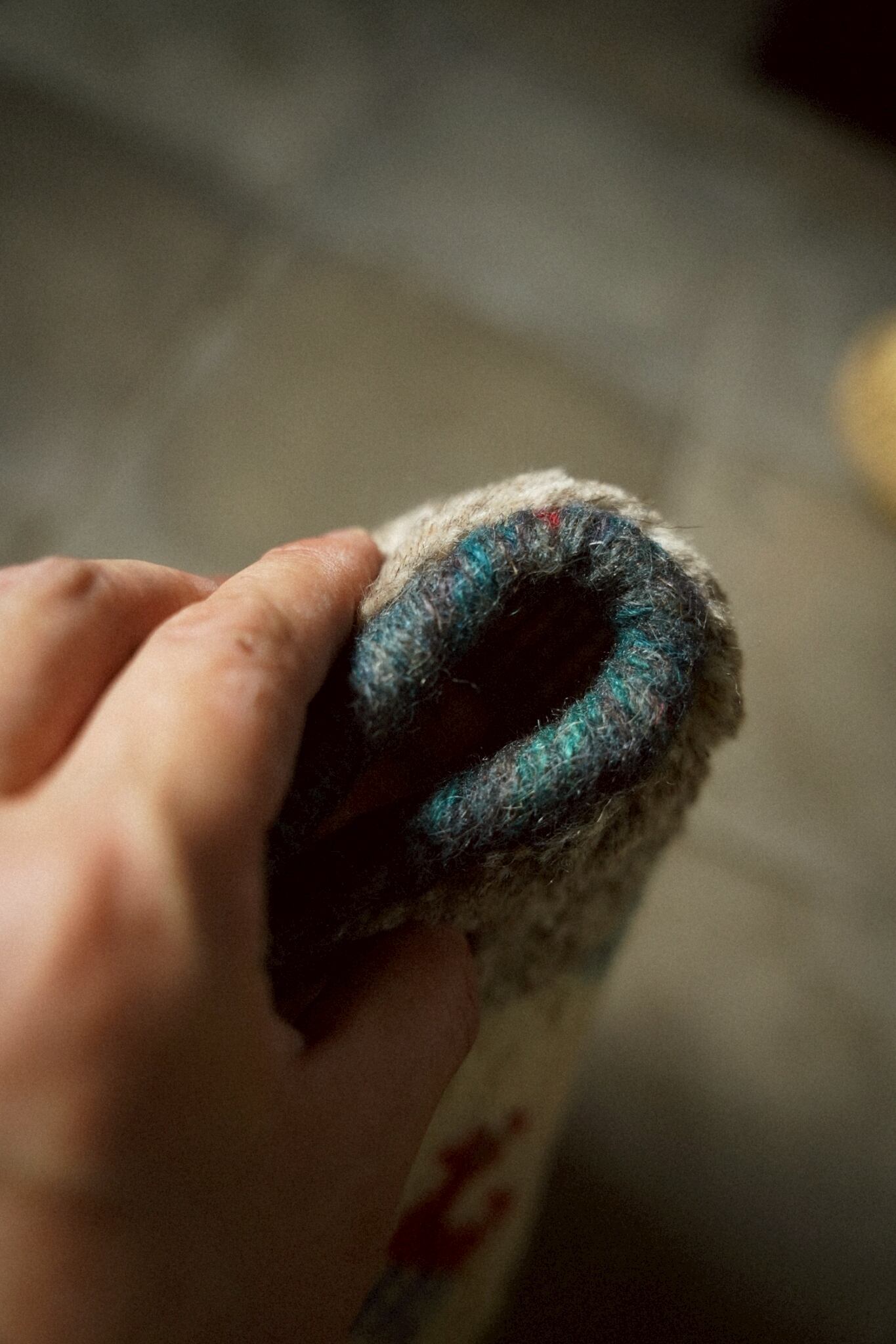 周りは染められていない原毛色のグレーがベースになっているのでデザインや配色のバランスもよくインテリアのアクセントとして取り入れやすいかと思います。