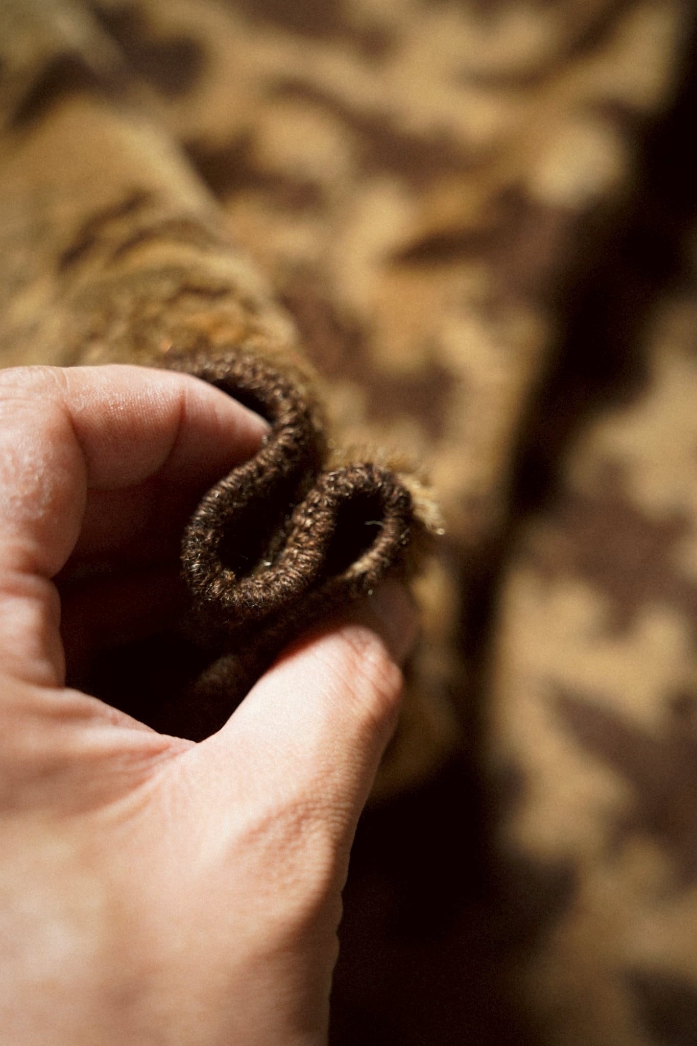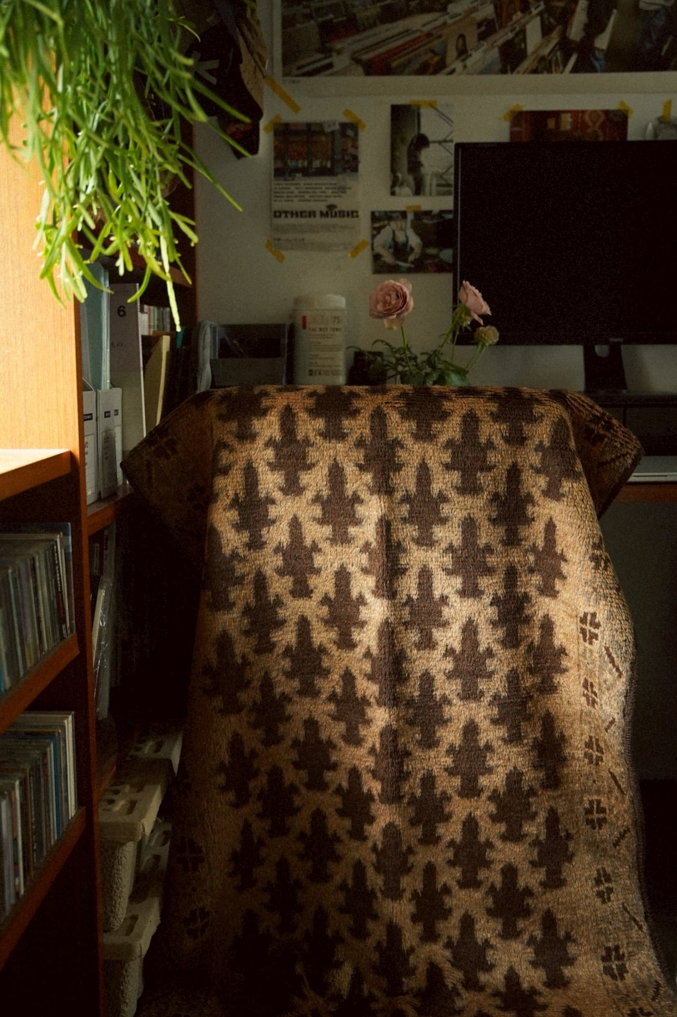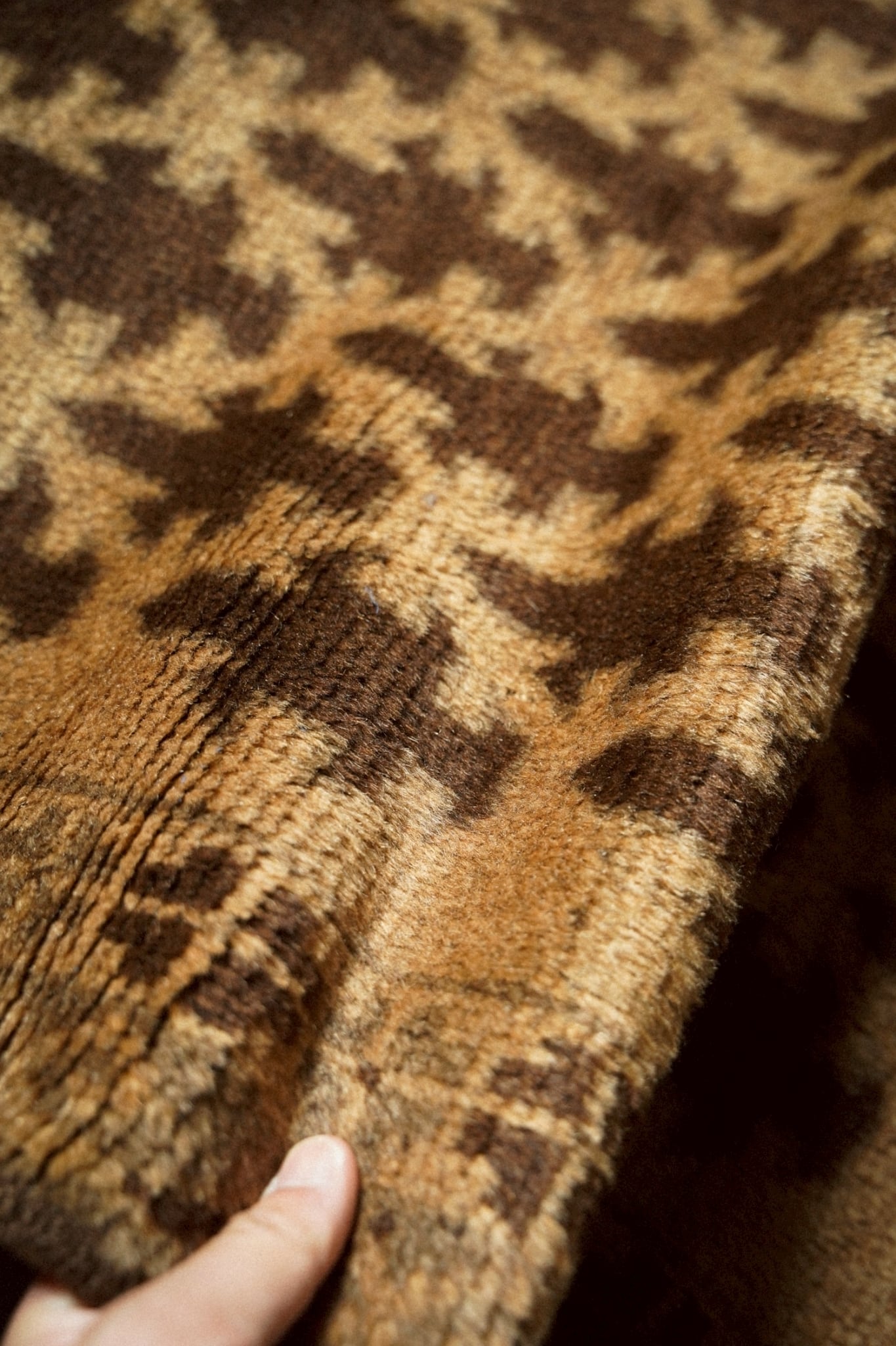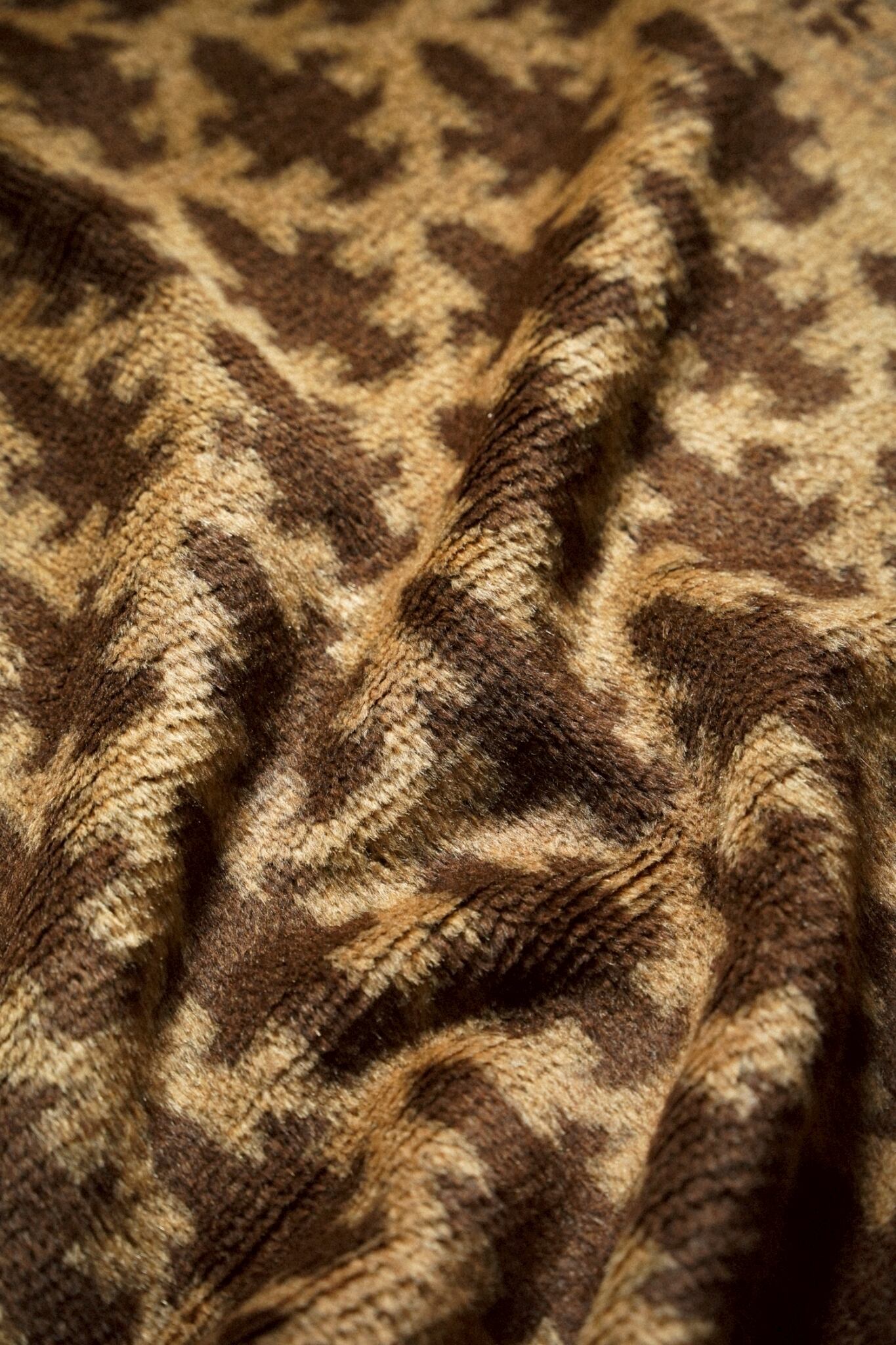 ブラウンとベージュのナチュラルなサンドカラーベースに幾何学紋様がリズミカルに並ぶ、素朴さと温かみを感じる一枚。