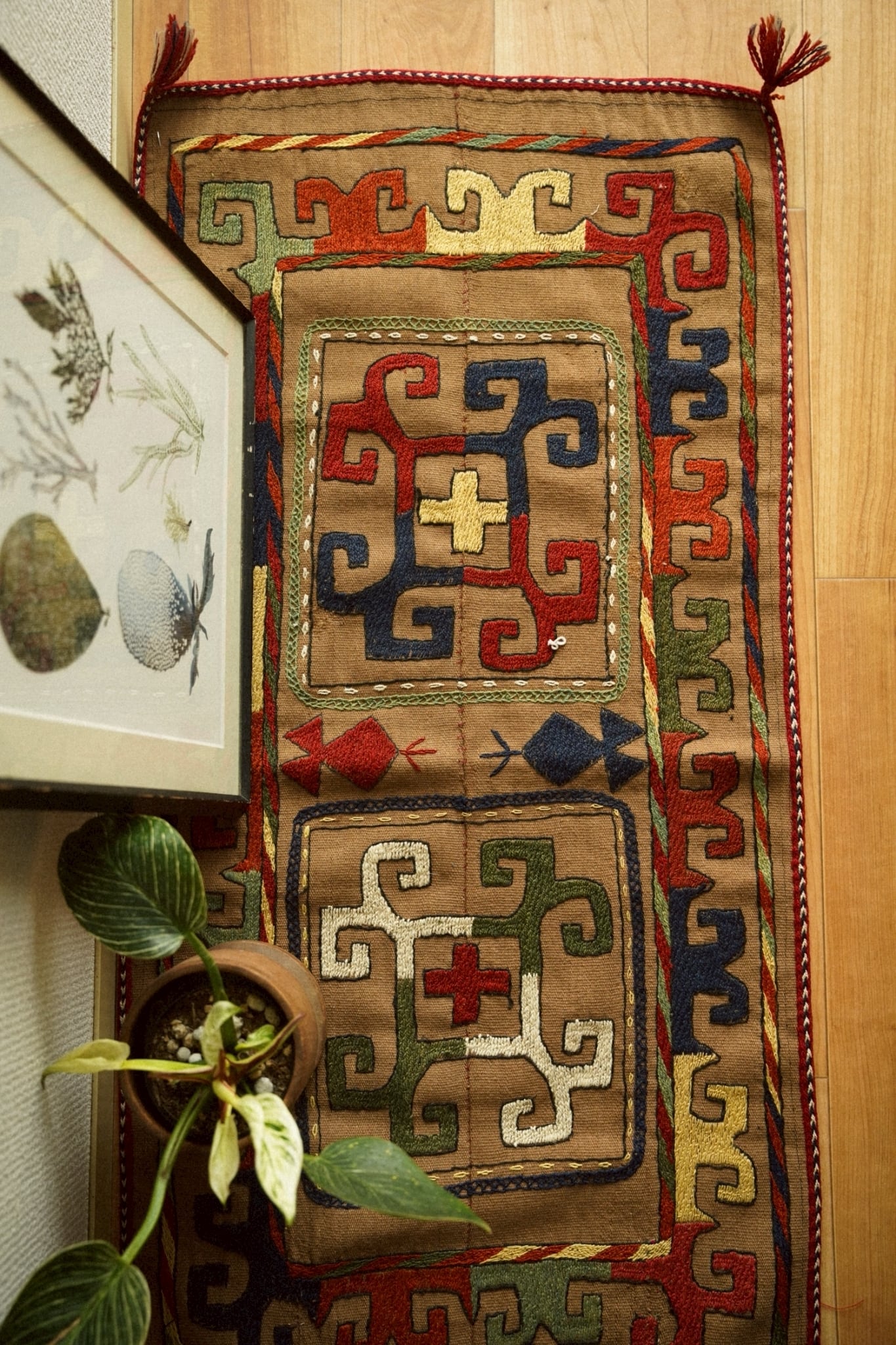 シックなブラウンベージュをベースにレッド、ブルー、グリーン、ホワイト、イエローなどカラフルな色使いのモチーフが美しい一枚。