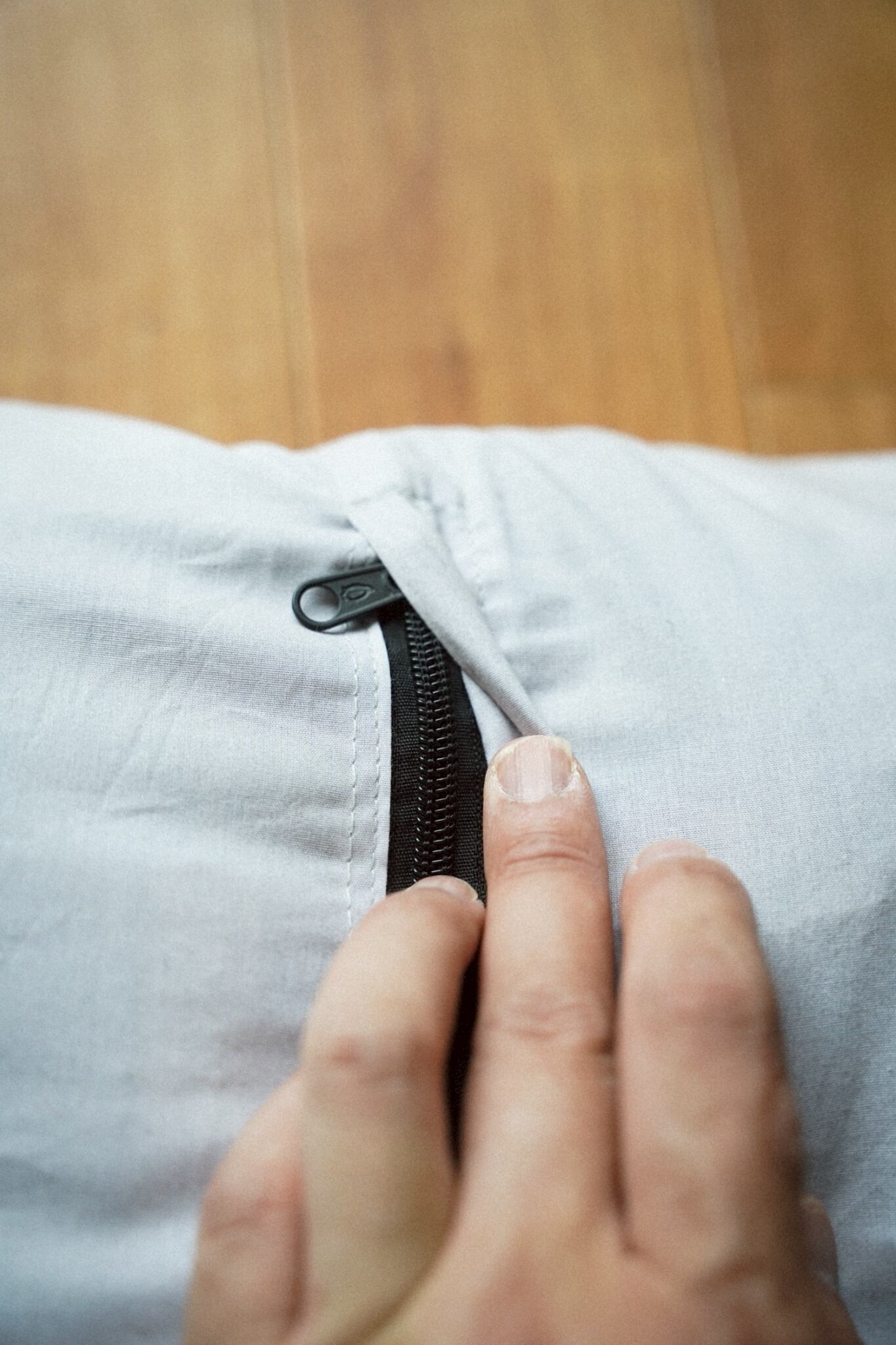 裏地は白の無地の布となっておりチャックで中材を出し入れ可能です。