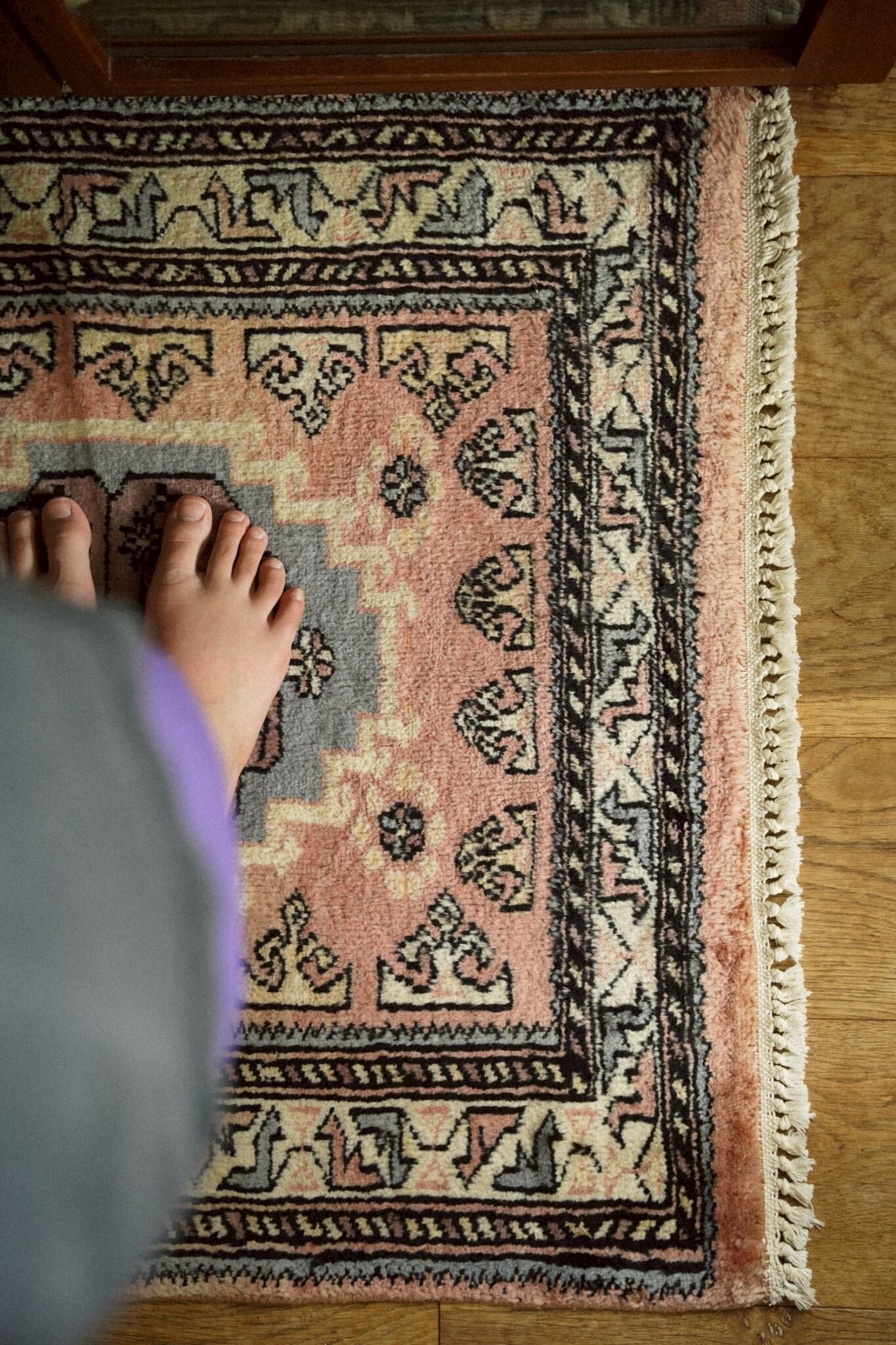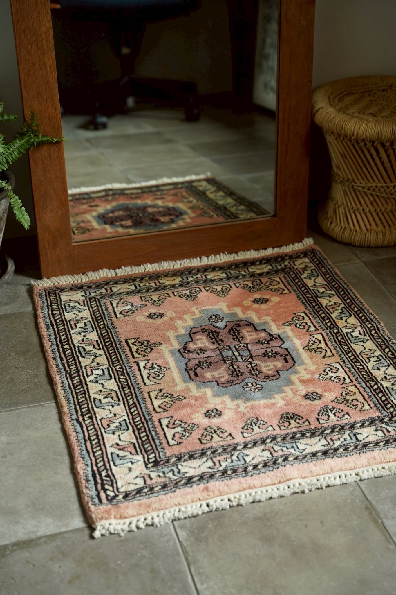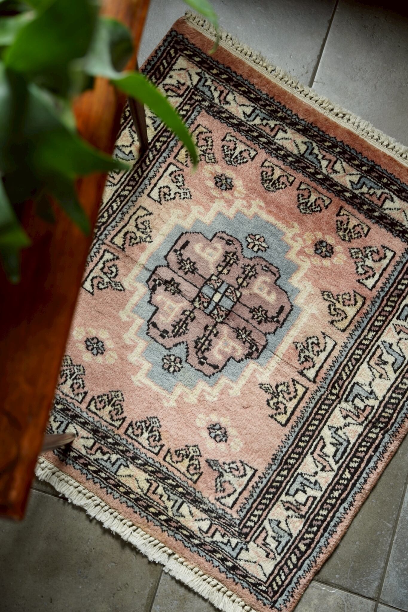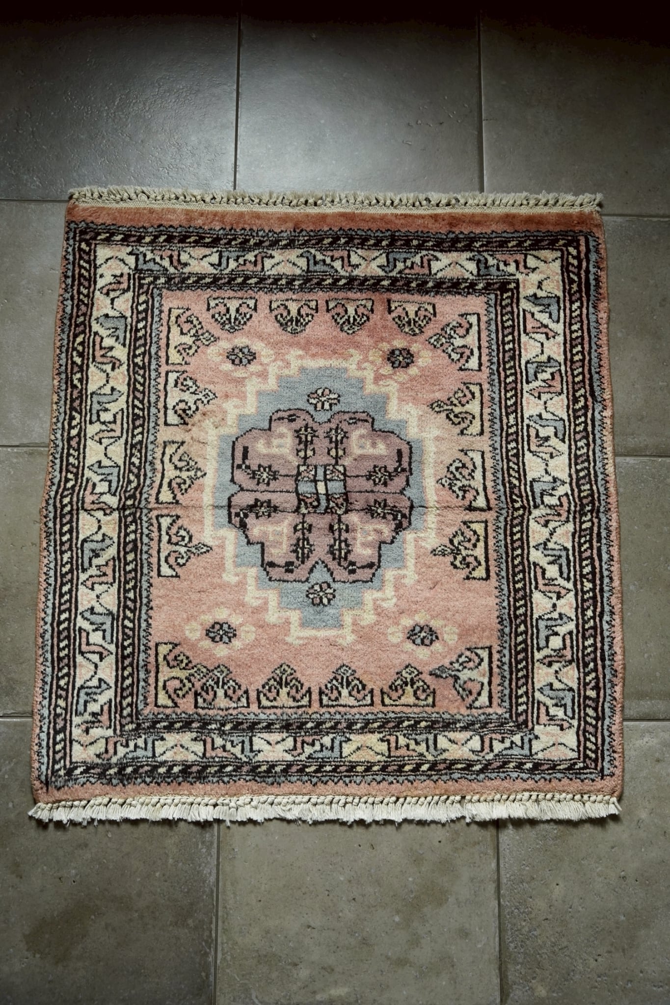 優しいニュアンスカラーのパキスタンミニラグ。