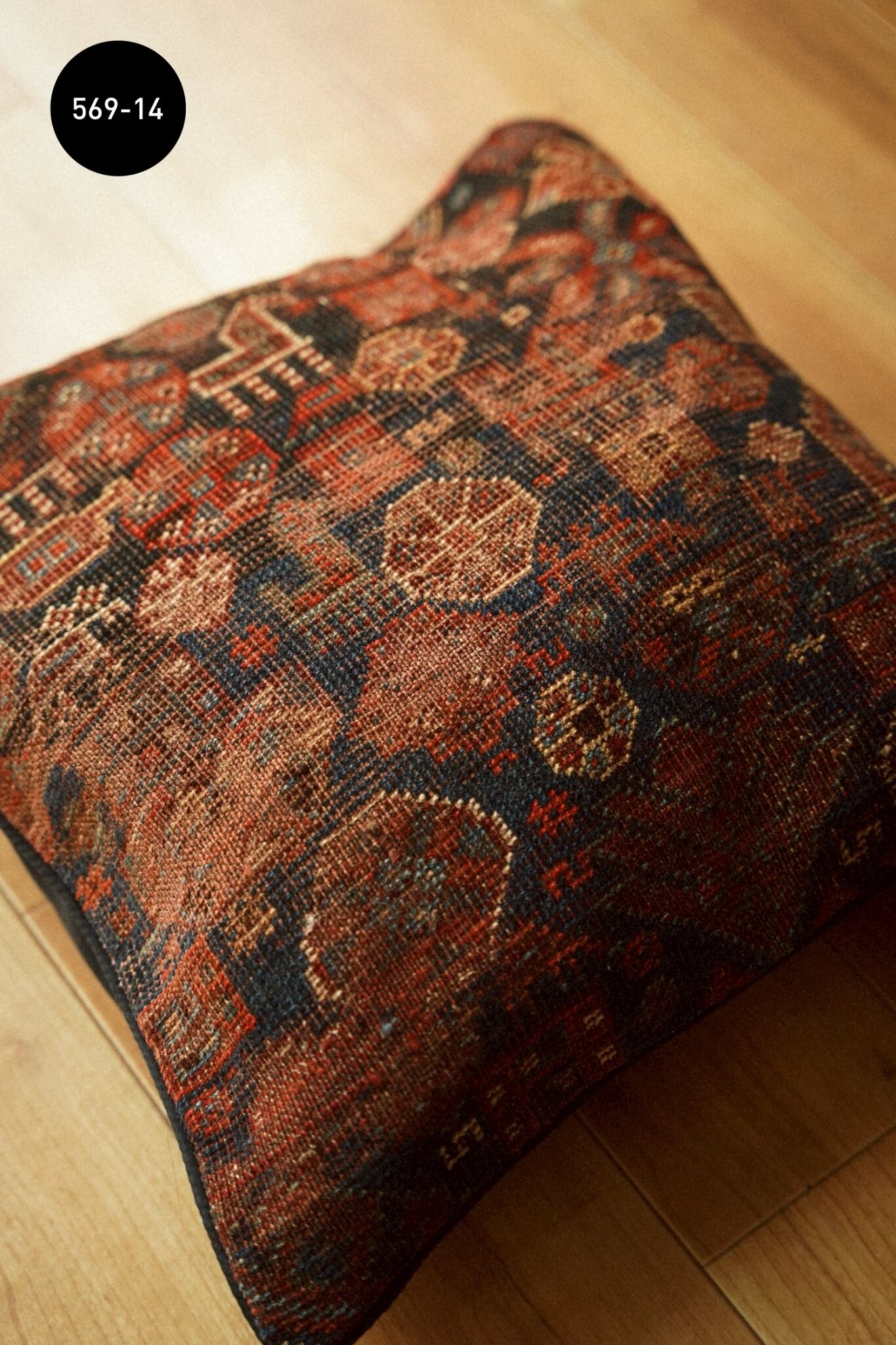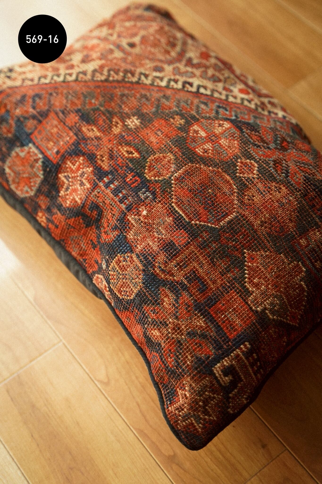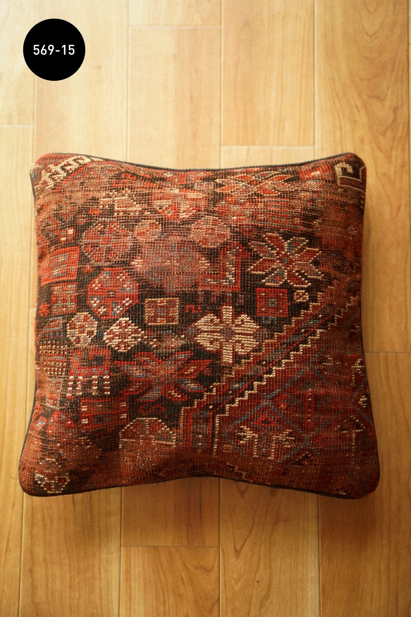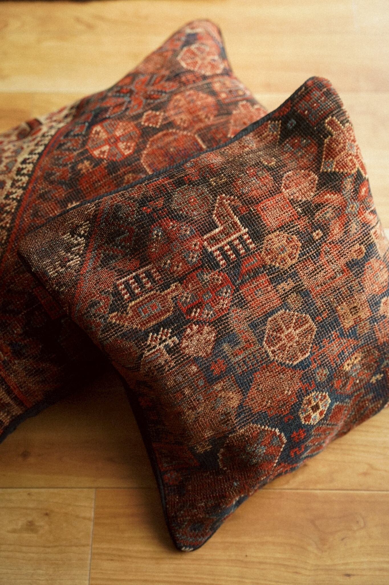 ハムセ連合の140年前のアンティークのラグを再利用して作られたクッションカバー。