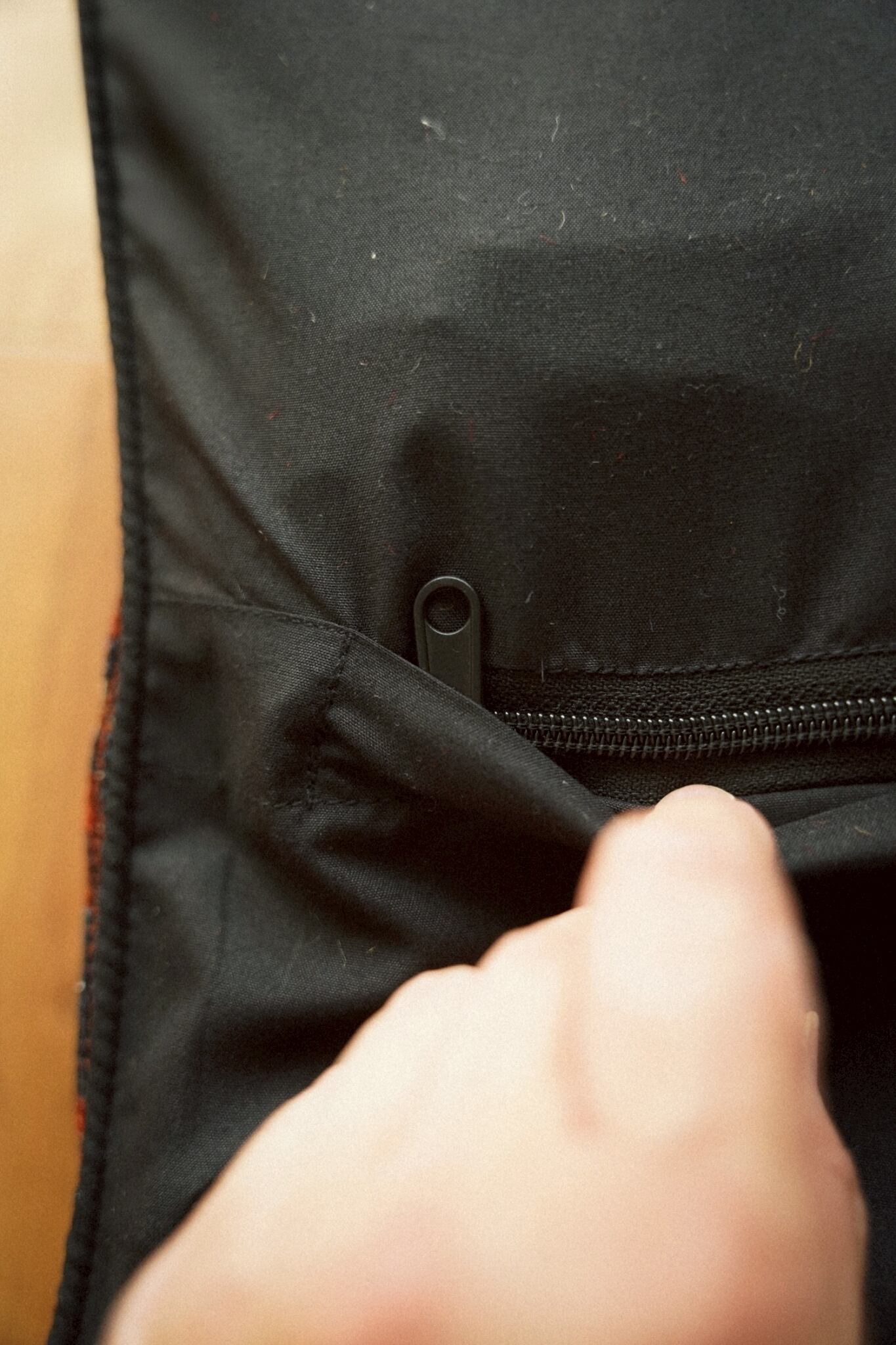 裏地は黒の無地の布となっておりチャックで中材を出し入れ可能です。