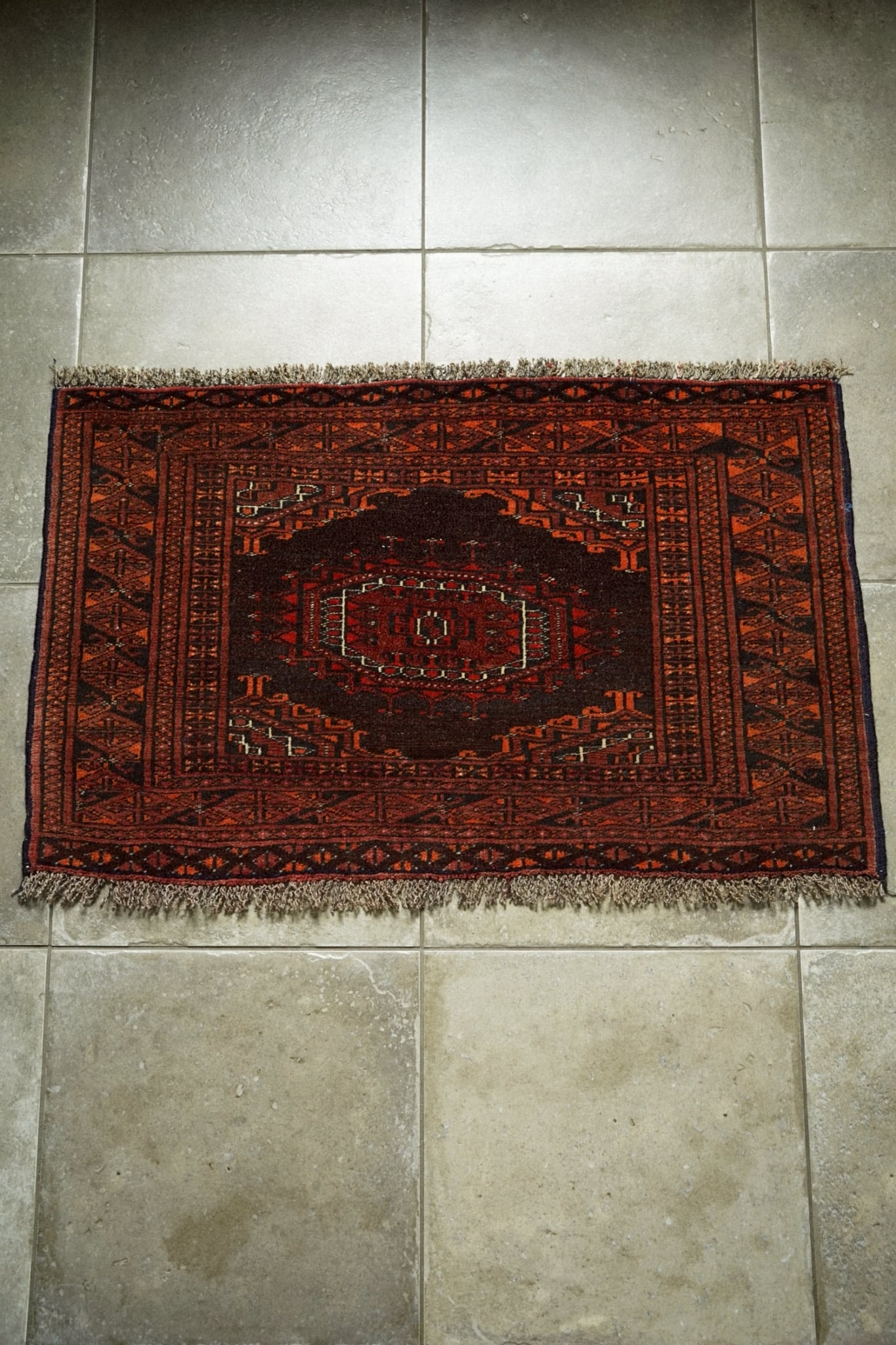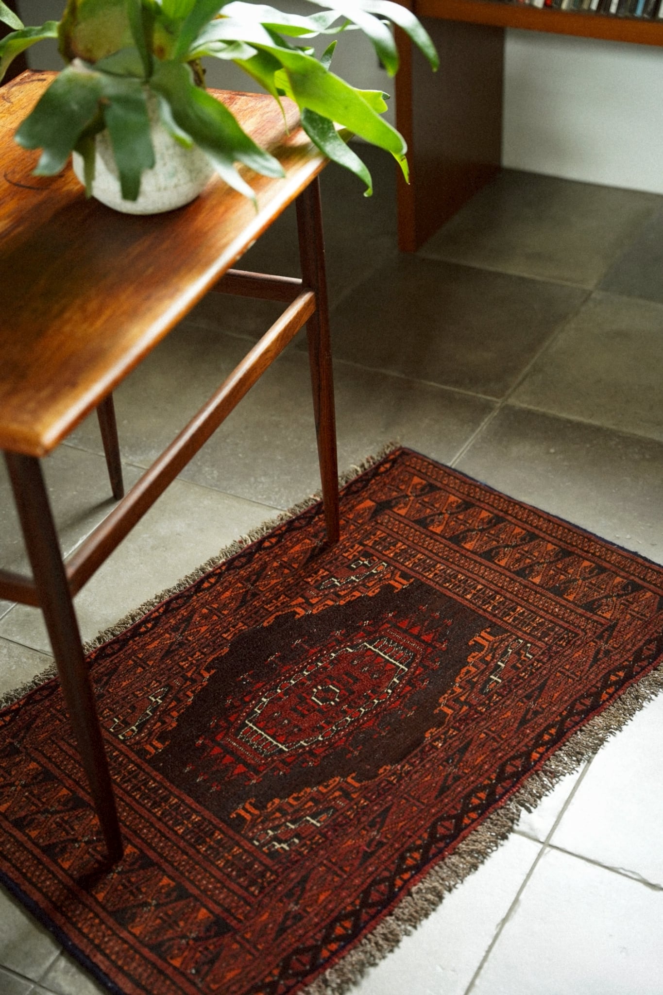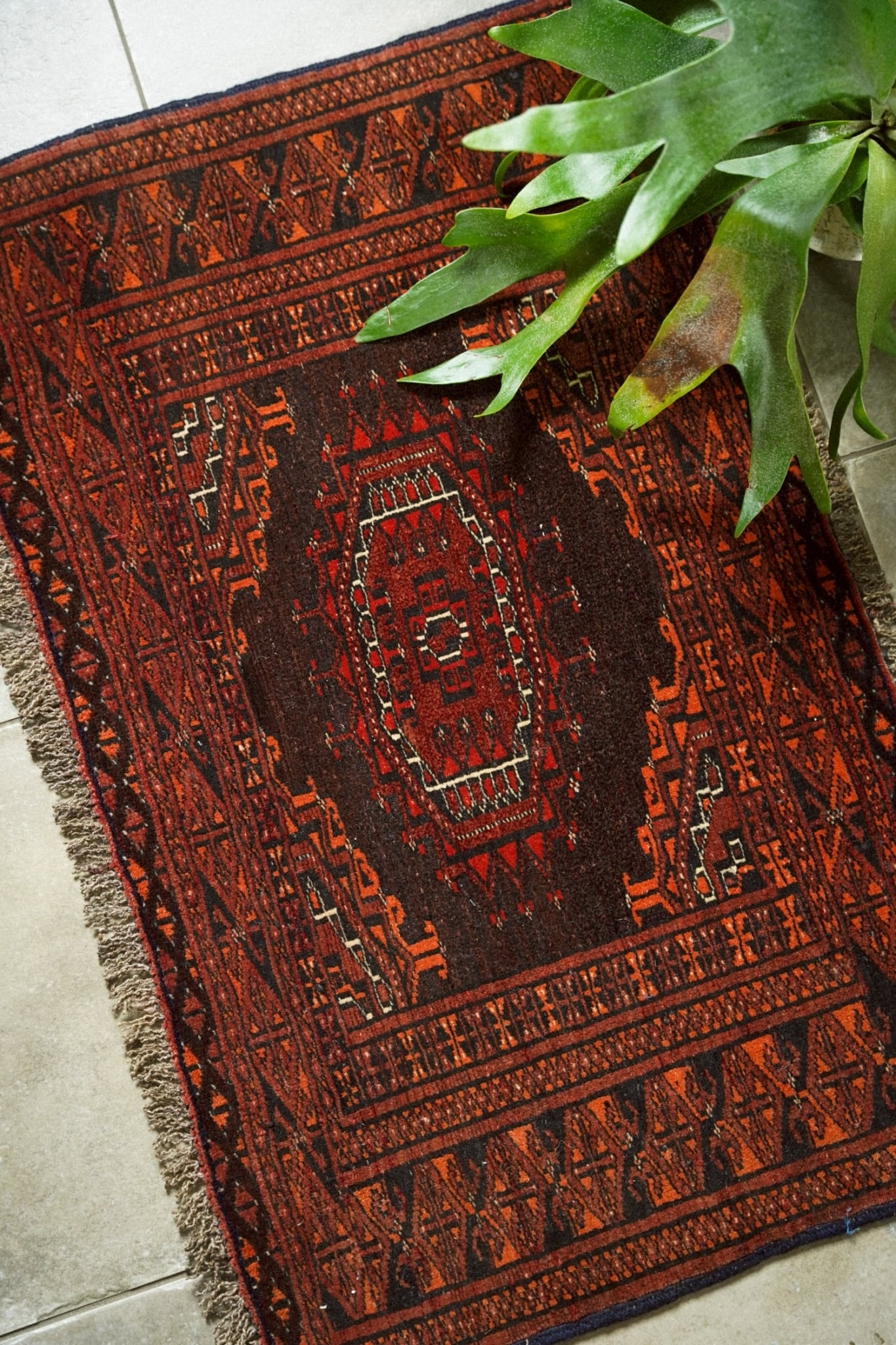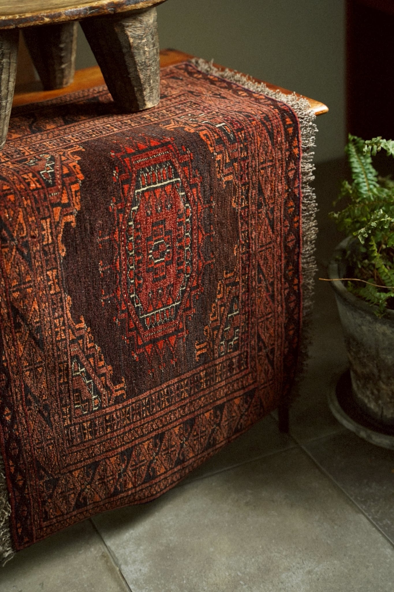 レッド、ブラウン、オレンジを基調とした落ち着いた色味にサルークギュルを囲むように細かい紋様が描かれており、ミニサイズながらも気品を感じる存在感のある一枚。