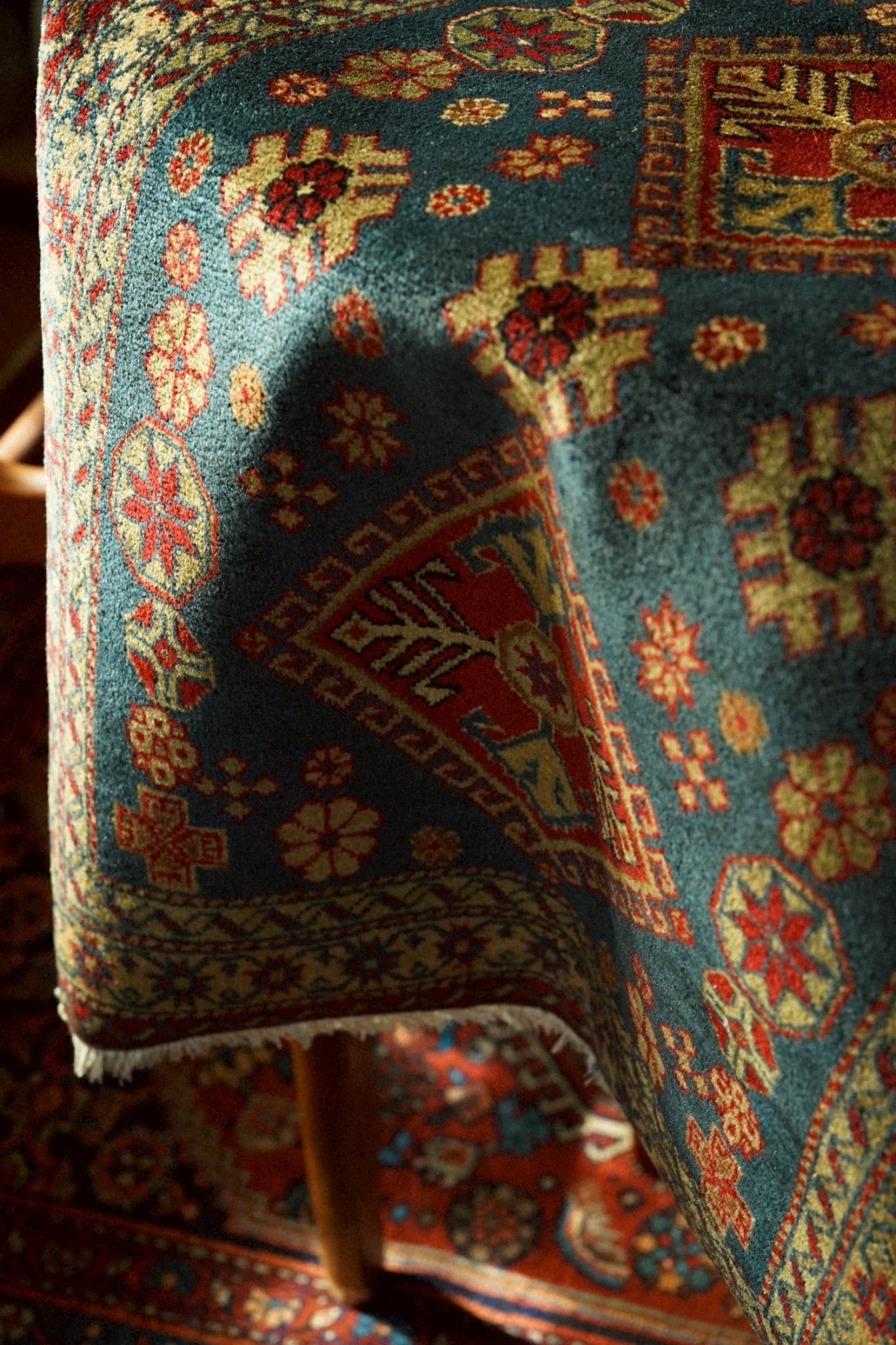 フィールドやボーダーには可愛らしい花紋様がたくさん織り込まれた華やかなデザイン。