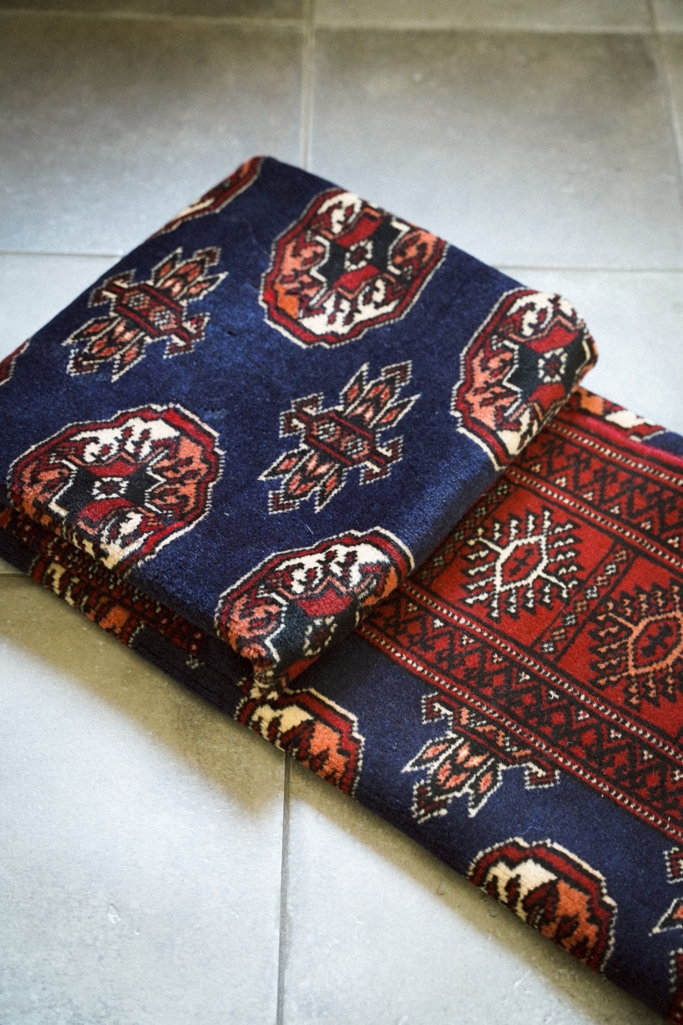 トルクメンレッドと深みのあるネイビーのコントラストが美しい一枚。