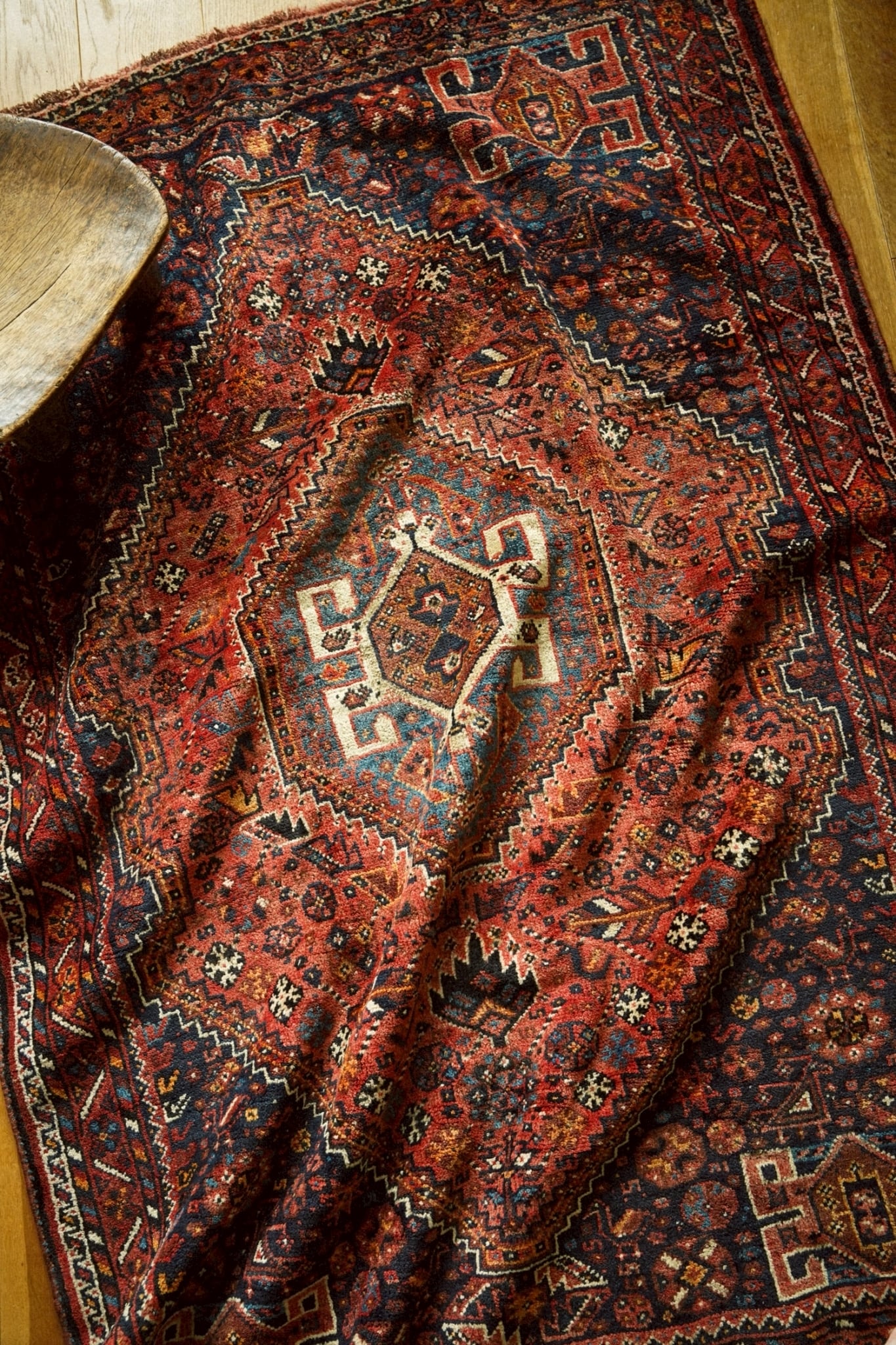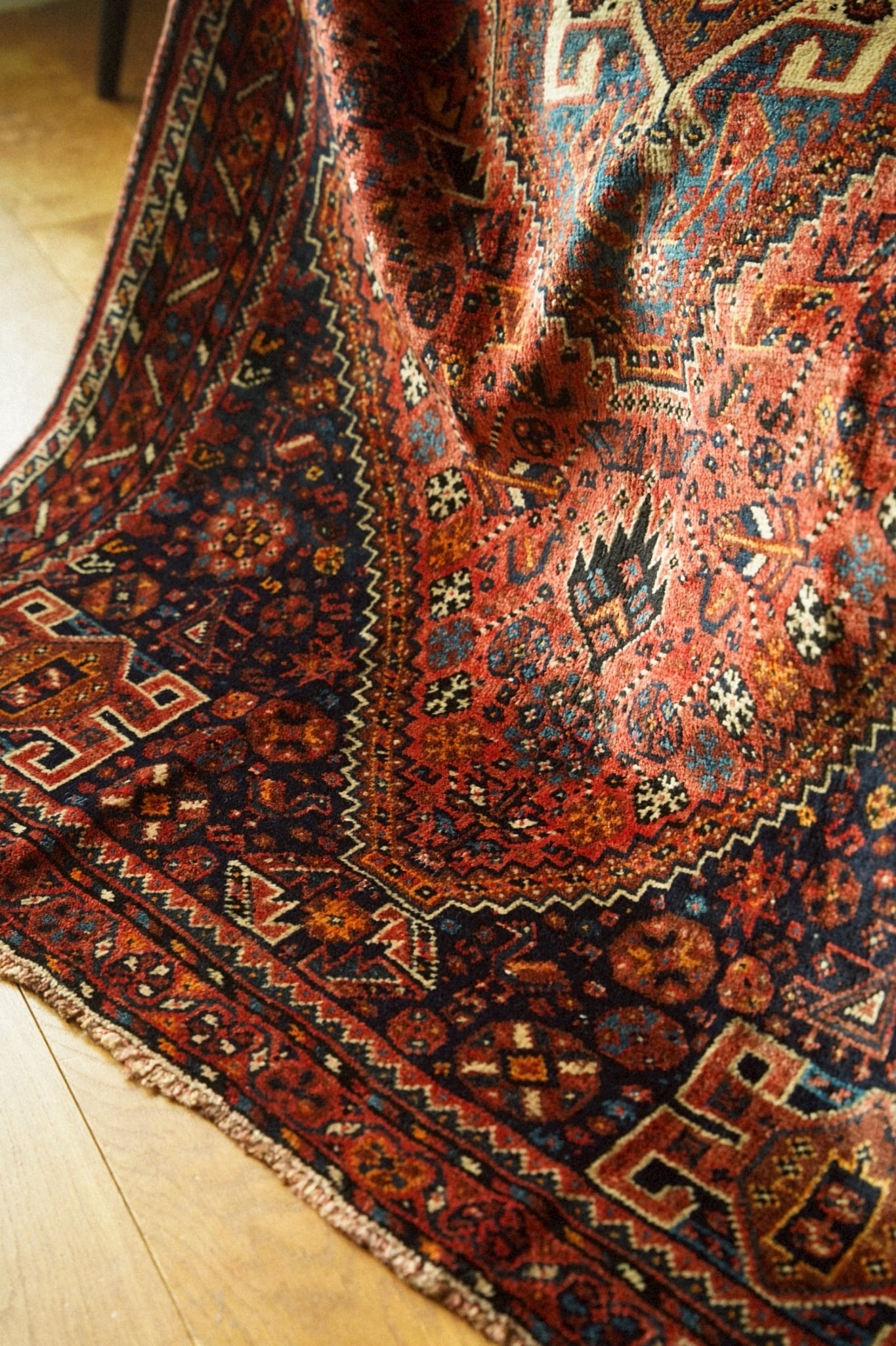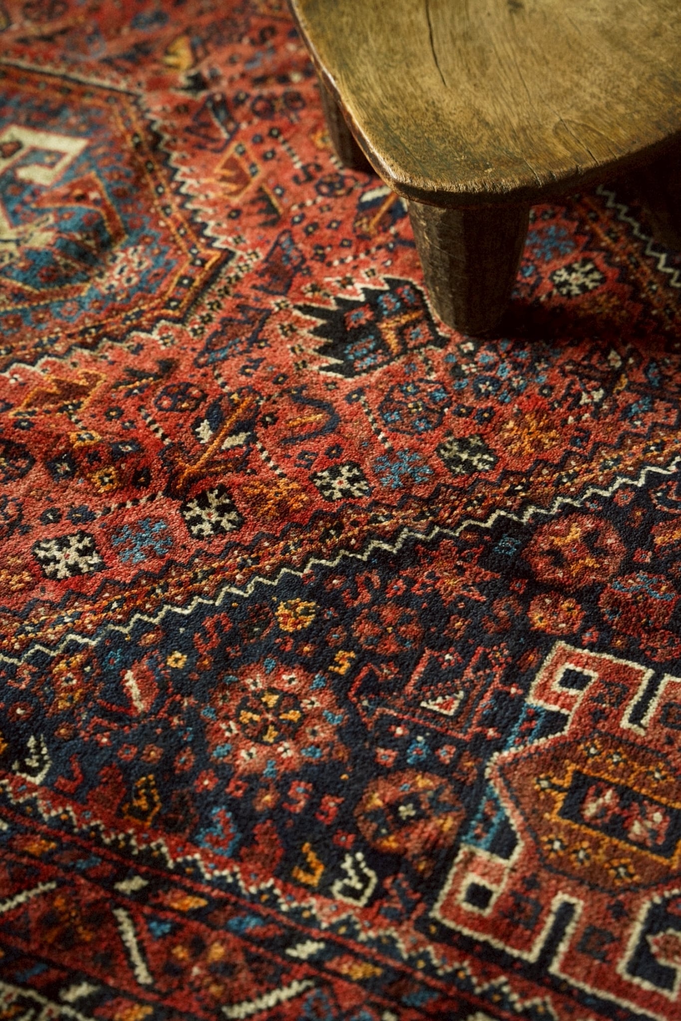 比較的ざっくりとした織りが多いカシュガイ族の絨毯ですが、こちらは織り目も細かく密度が詰まっており素足で乗っても弾力がある乗り心地で床の冷たさを通しません。