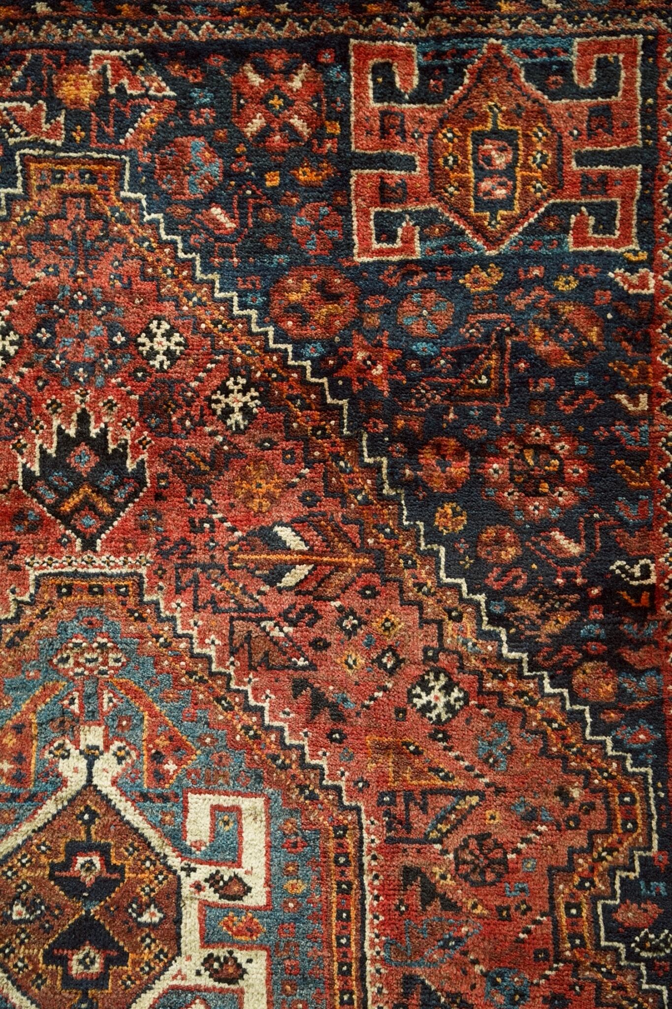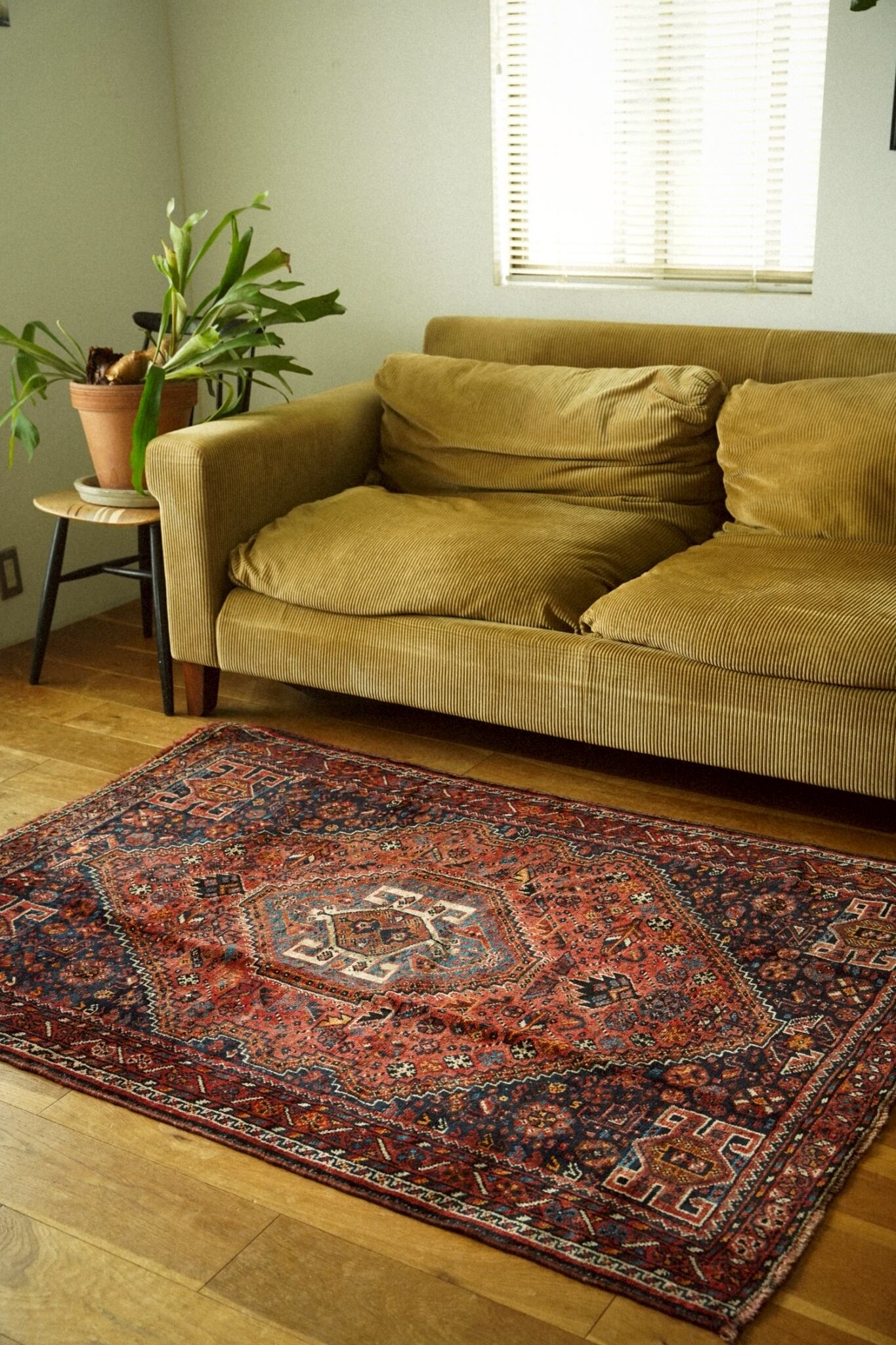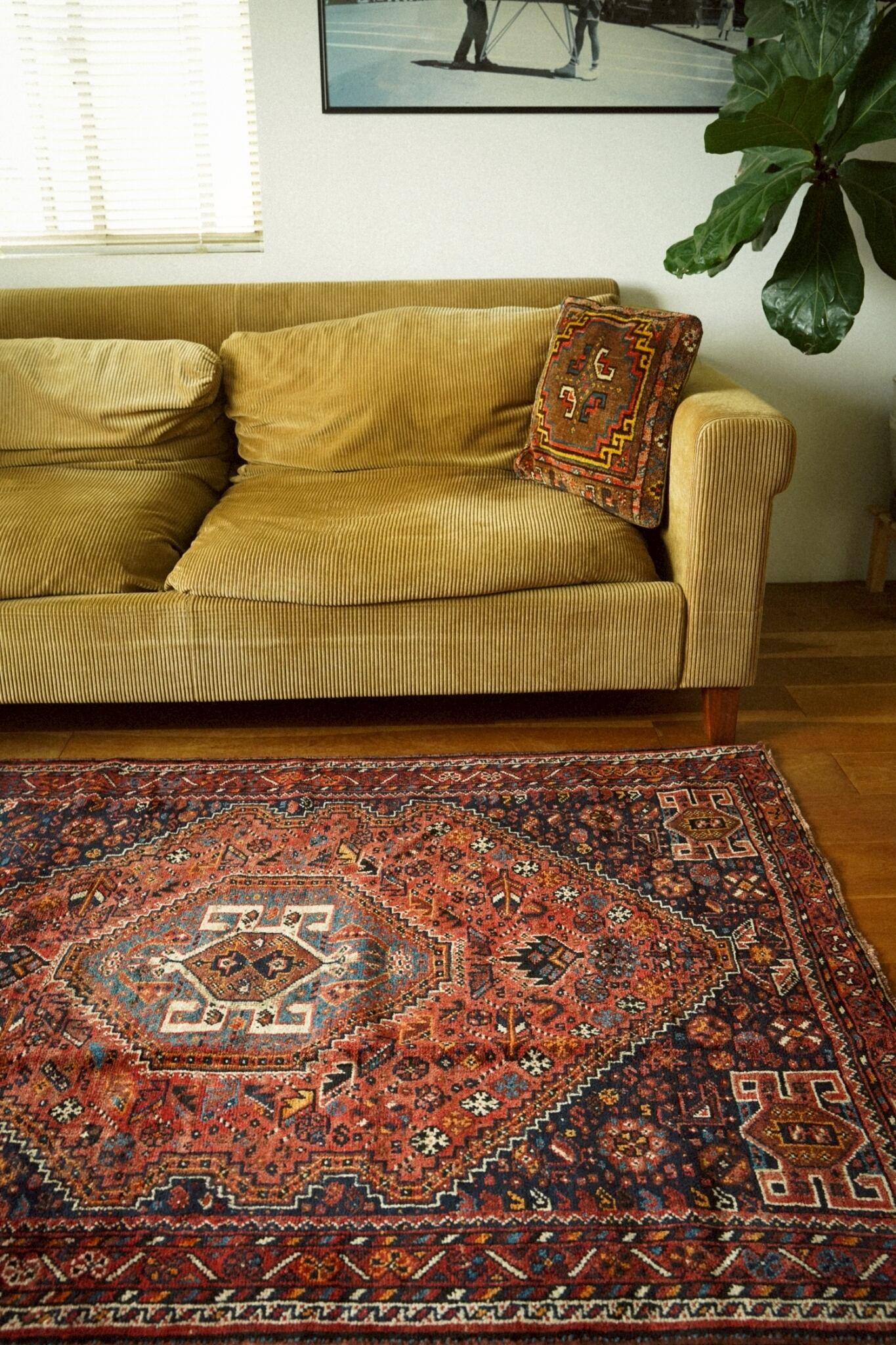 比較的ざっくりとした織りが多いカシュガイ族の絨毯ですが、こちらは織り目も細かく密度が詰まっており素足で乗っても弾力がある乗り心地で床の冷たさを通しません。
