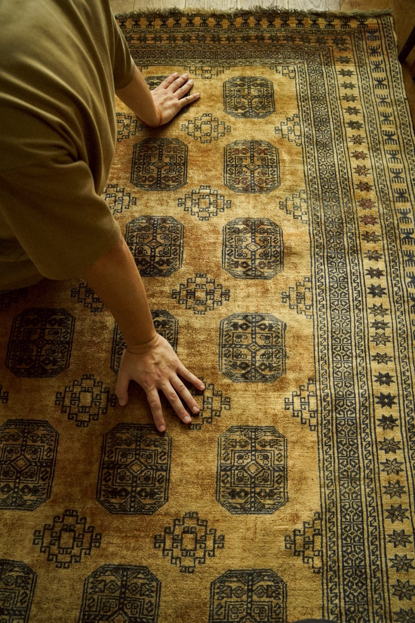 艶があり美しく輝くキャメルカラーのフィールドに力強いギュルが描かれた魅力的な一枚。