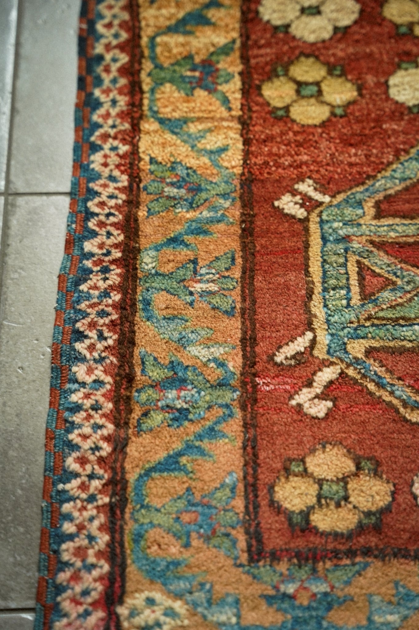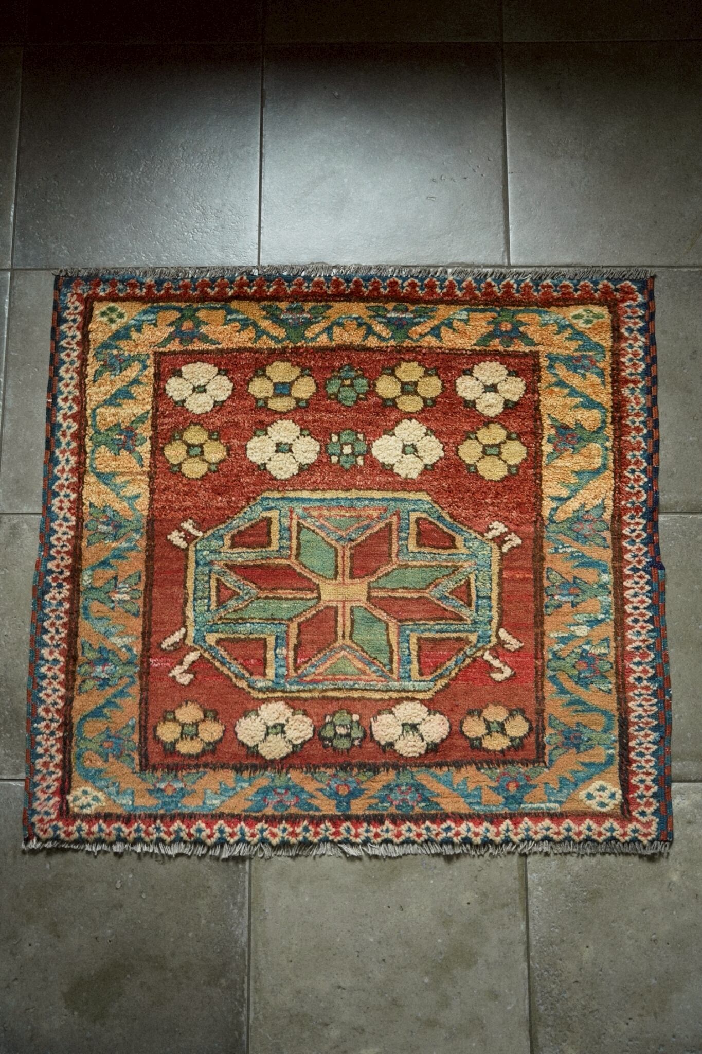 1990年代に織られたアフガニスタン産のトルクメンラグ。落ち着いた朱赤ベースのフィールドに八芒星と可愛らしい花紋様が描かれたデザイン。