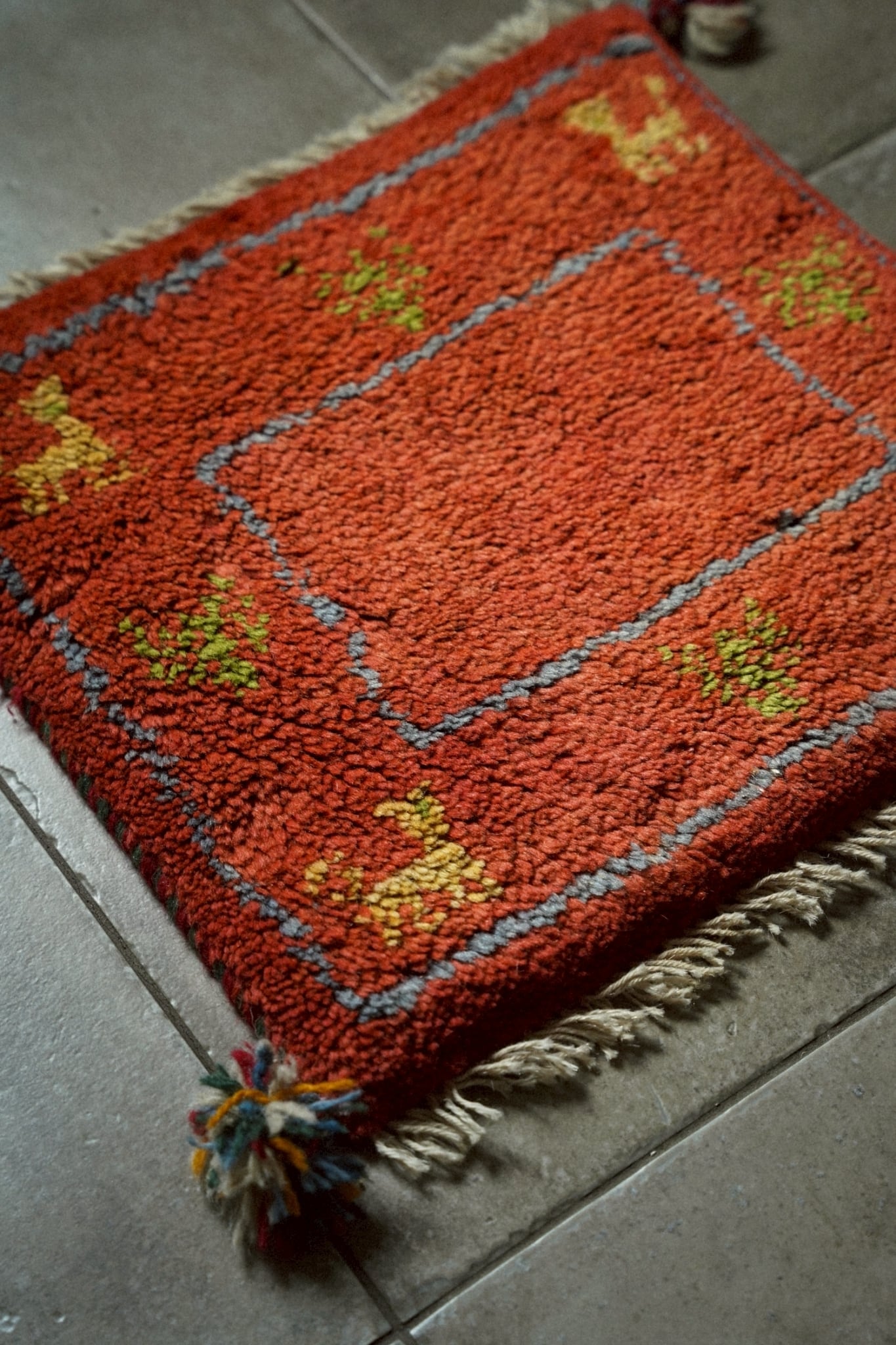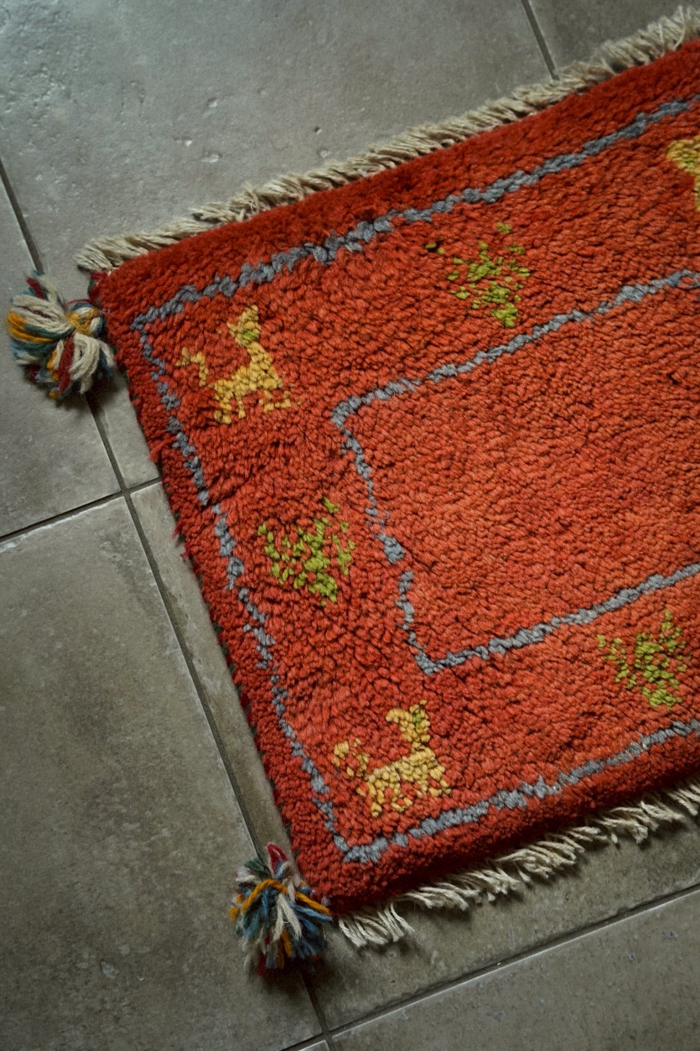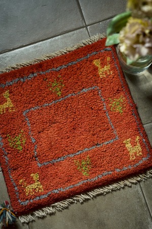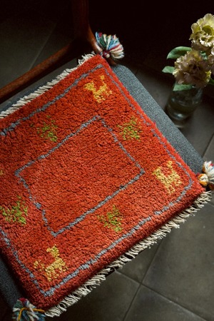 カシュガイ族によって織られた座布団サイズのミニギャッベ。朱赤ベースのフィールドに可愛らしい動物が描かれたデザイン。