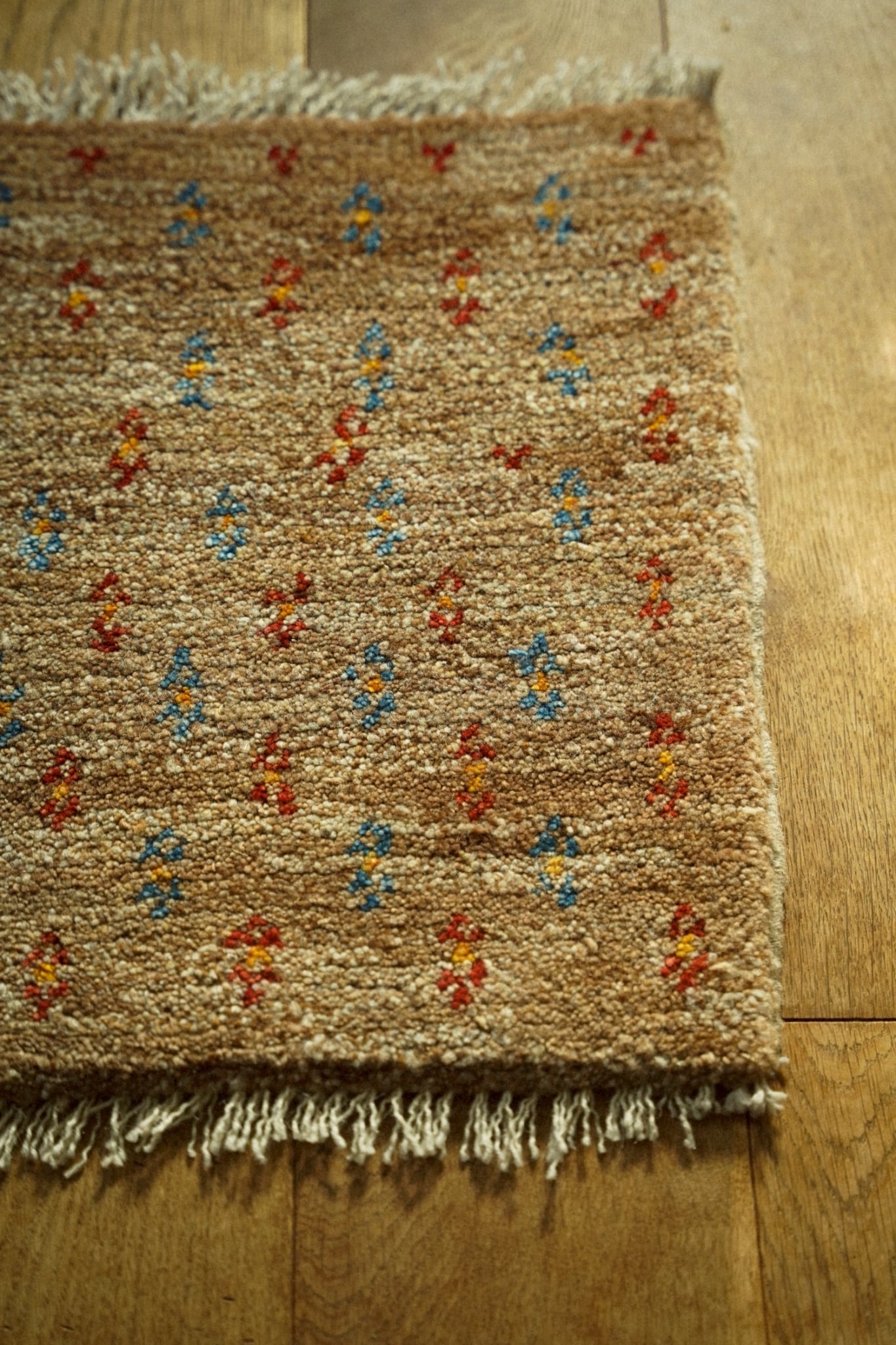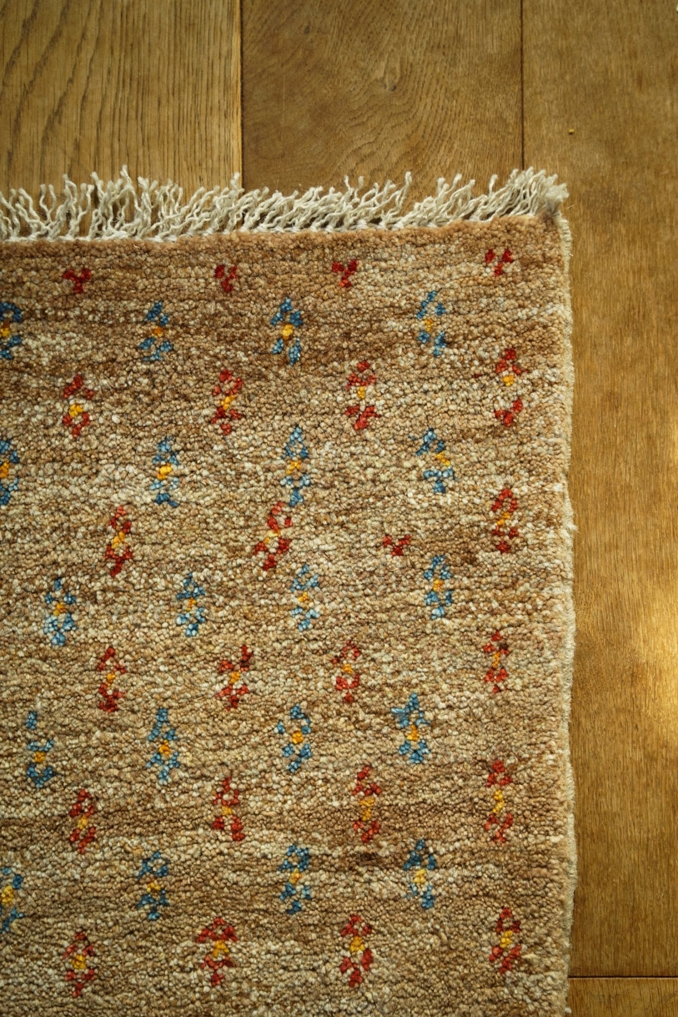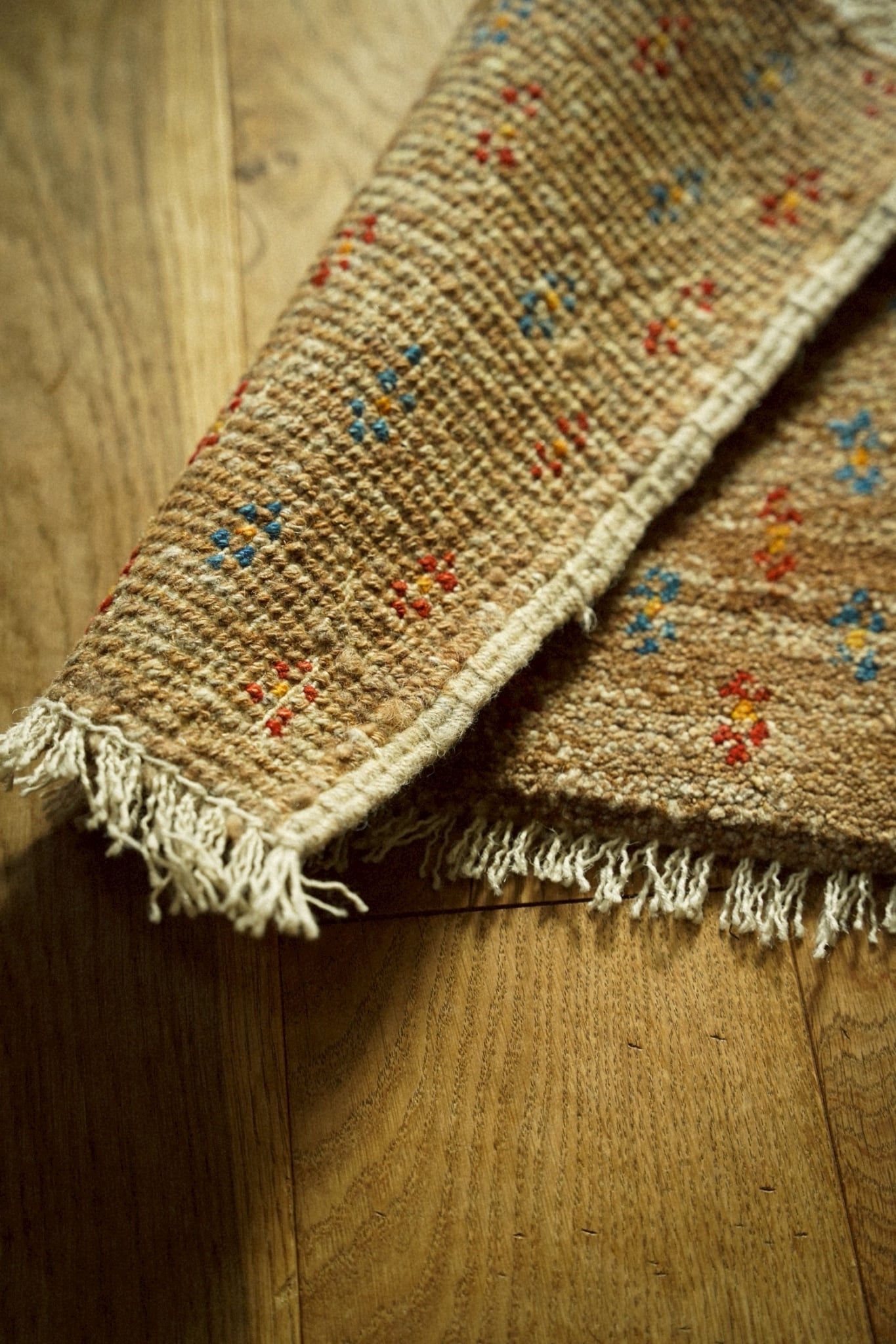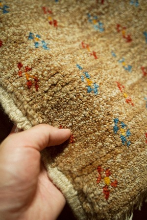 ギャッベの特徴でもあるしっかりとした毛足は厚みがあり、直接座ってもフカフカで気持ち良いです。
