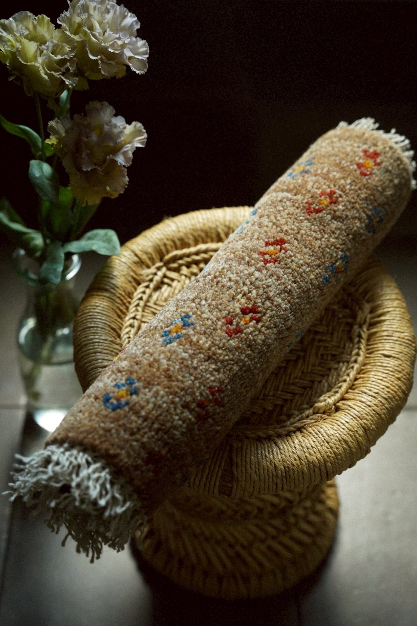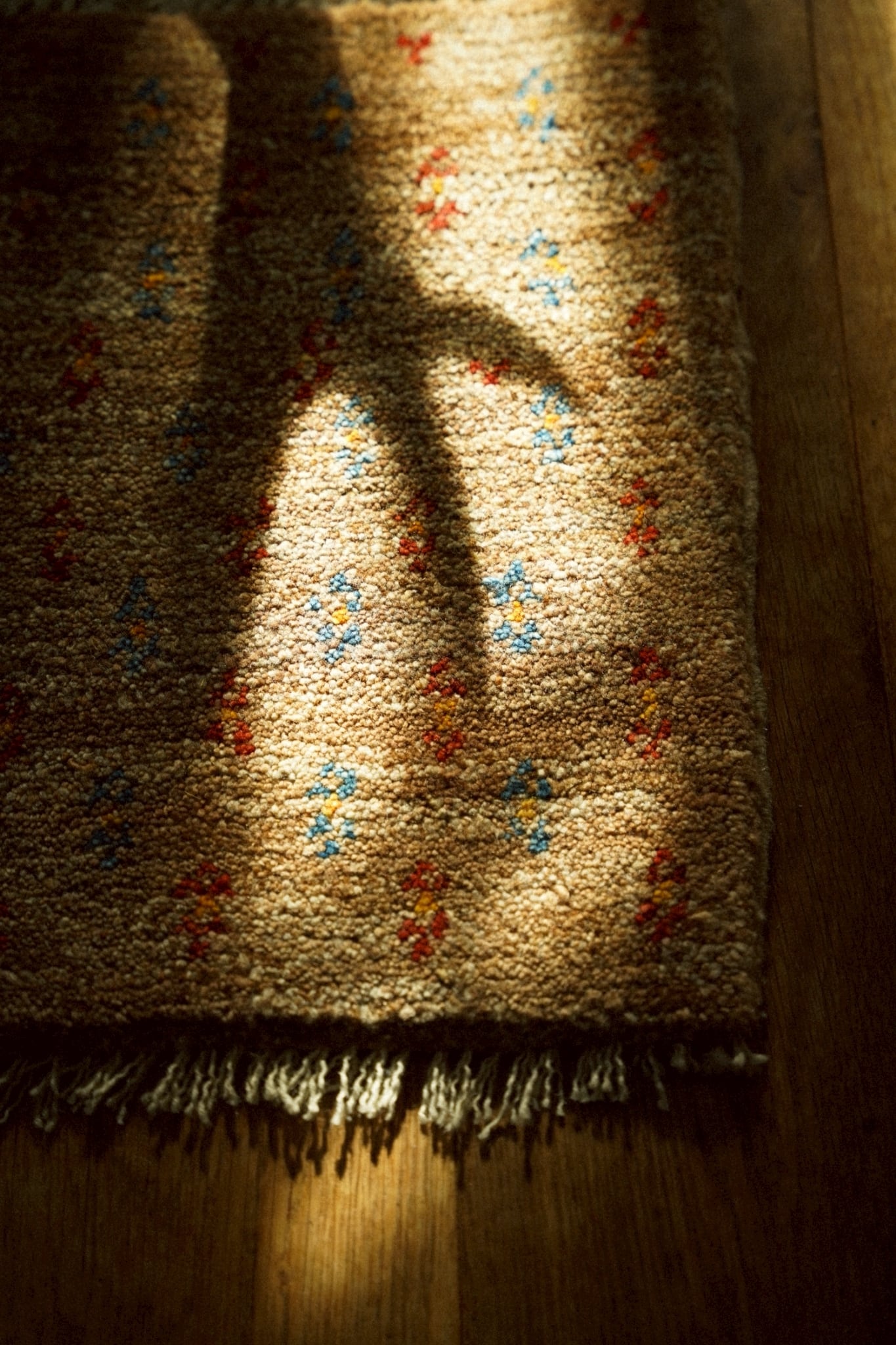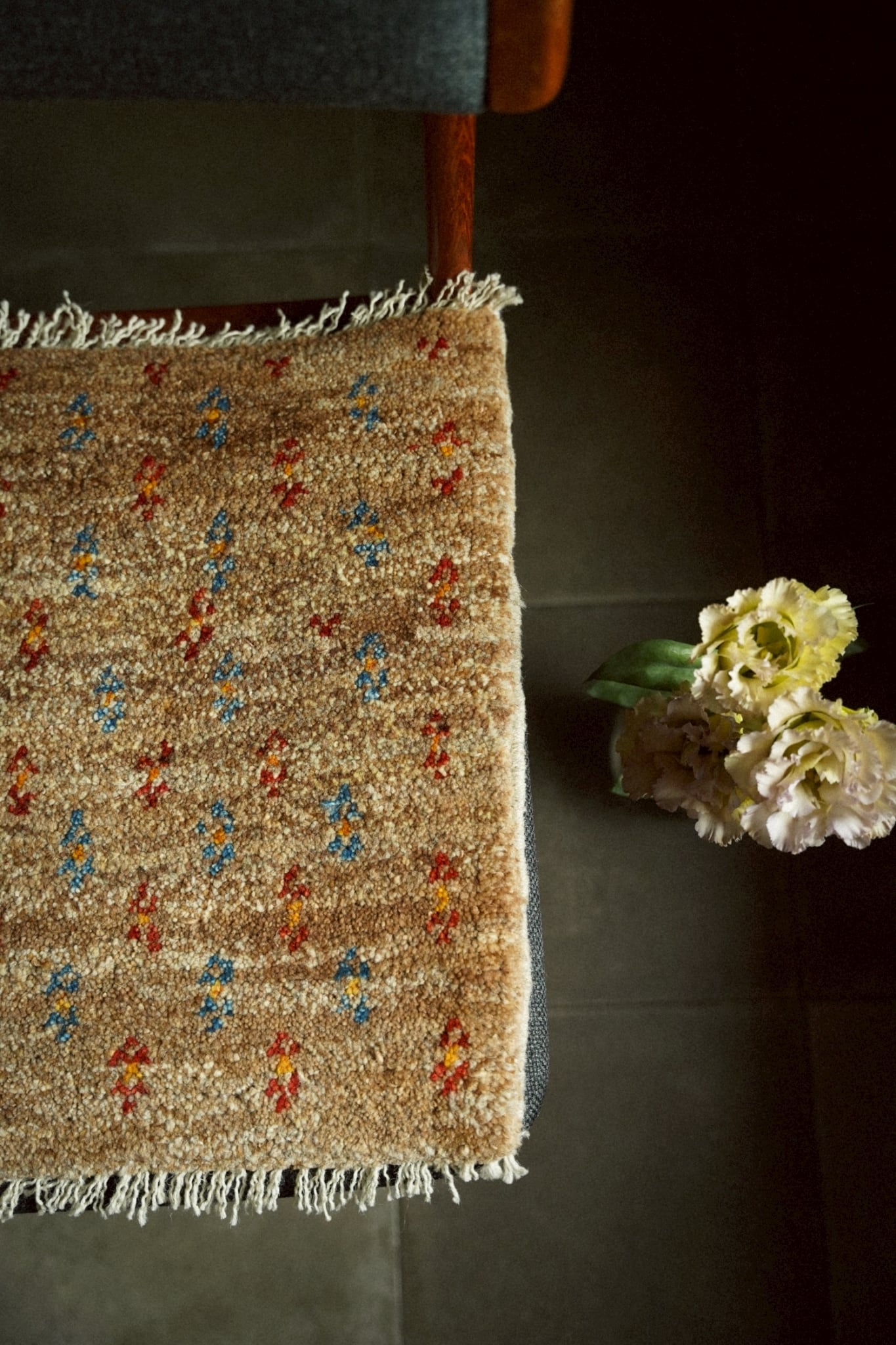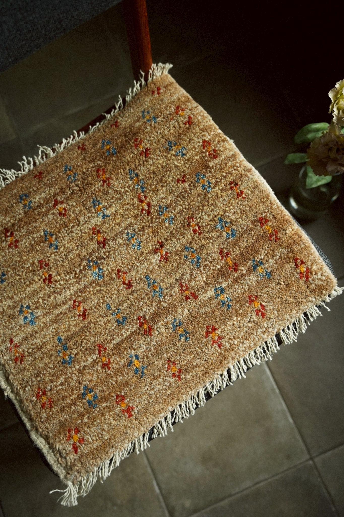 染色していない原毛色のブラウンとベースにブルーとレッドで描かれた小さな花紋様が可愛らしい一枚。