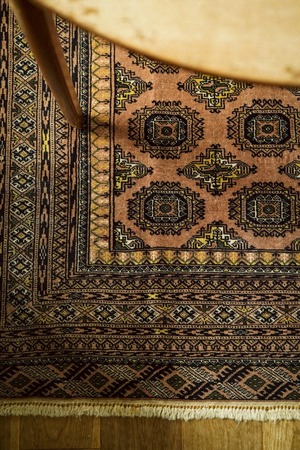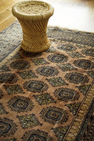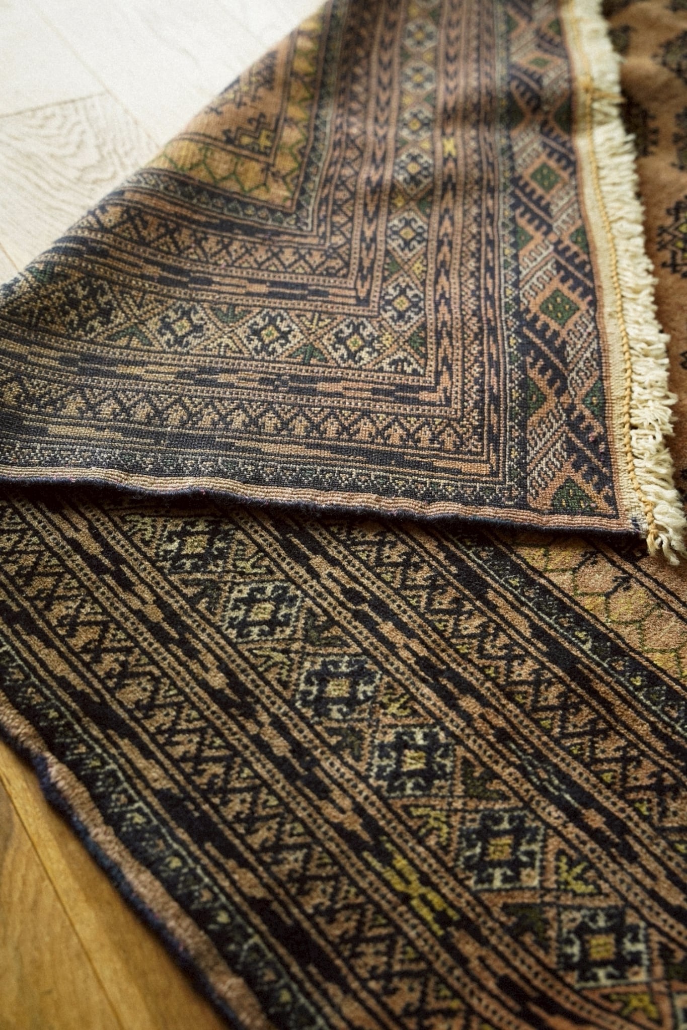 ボーダー部分には細かな連続紋様。経年30年程度の比較的新しいラグのため、状態はよく手触りも滑らかで、トルクメン族の織りの技術の素晴らしさを堪能できる一枚。