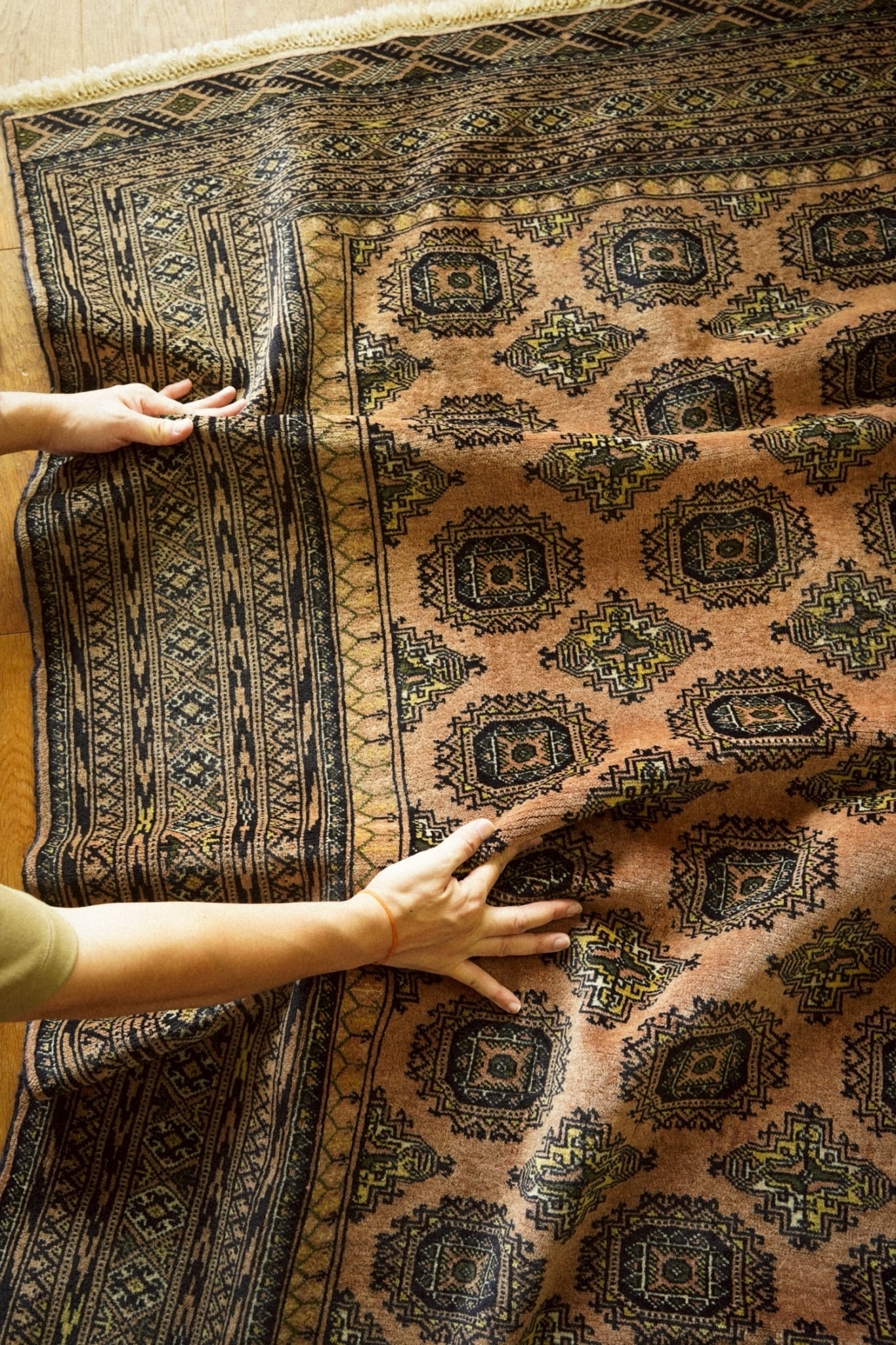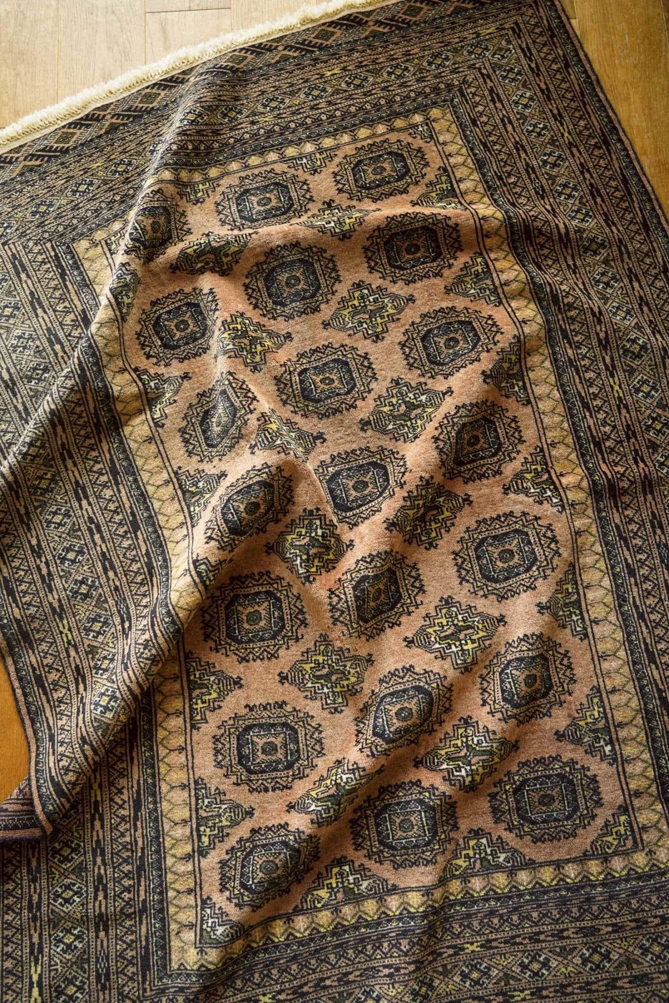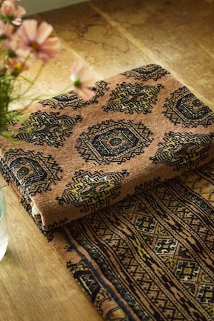 くすみ感のあるピンクベージュをベースに、フィールドには力強いギュル紋様が織り込まれたデザイン。