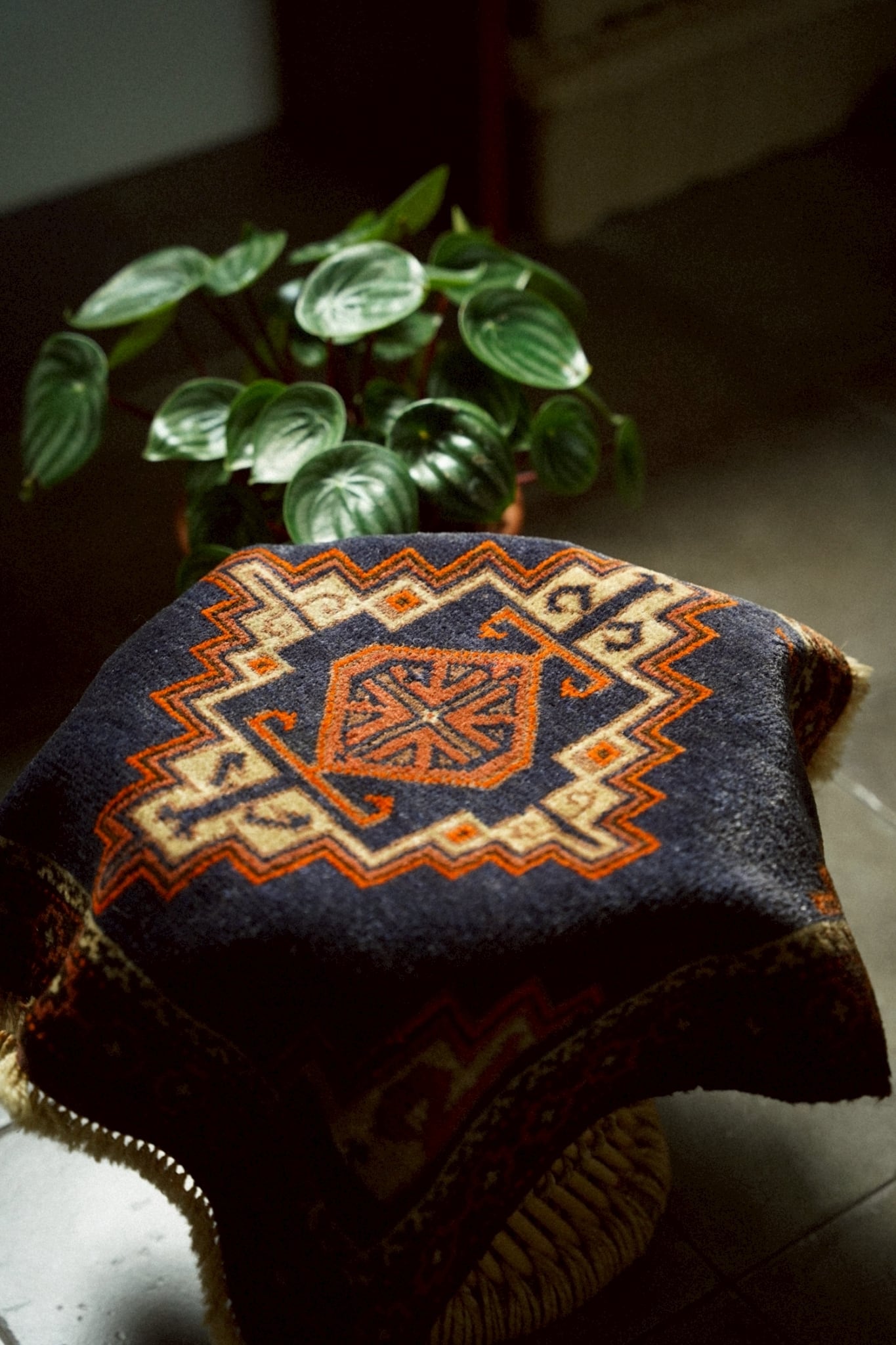 ネイビーベースのフィールドにフックドメダリオン、ボーダー部分にはクロスの連続紋様が描かれたデザイン。オレンジやアイボリー、ベージュ、ブラウンなどの温かみのある色味とネイビーのカラーリングが渋くてとても素敵な一枚。