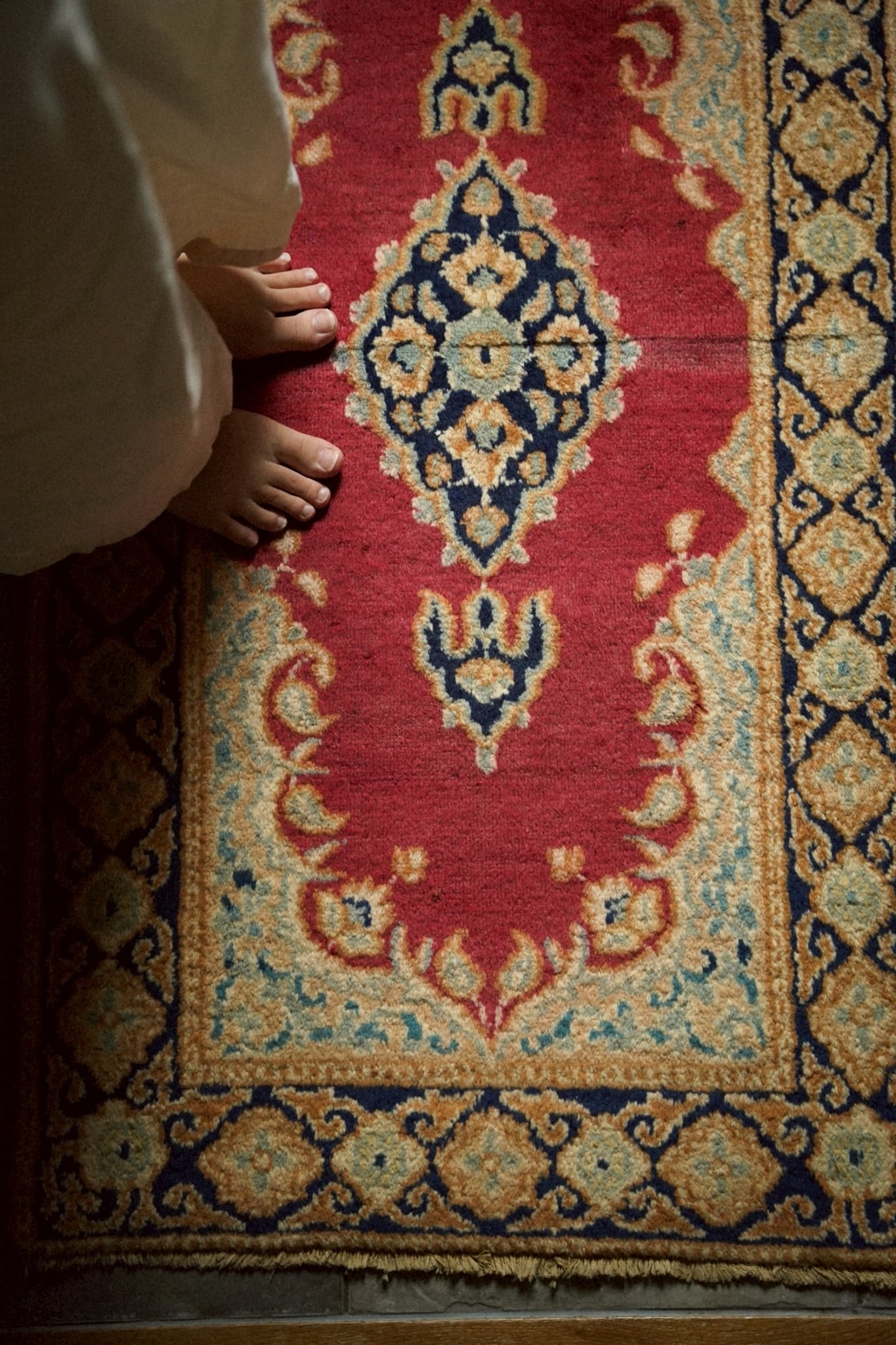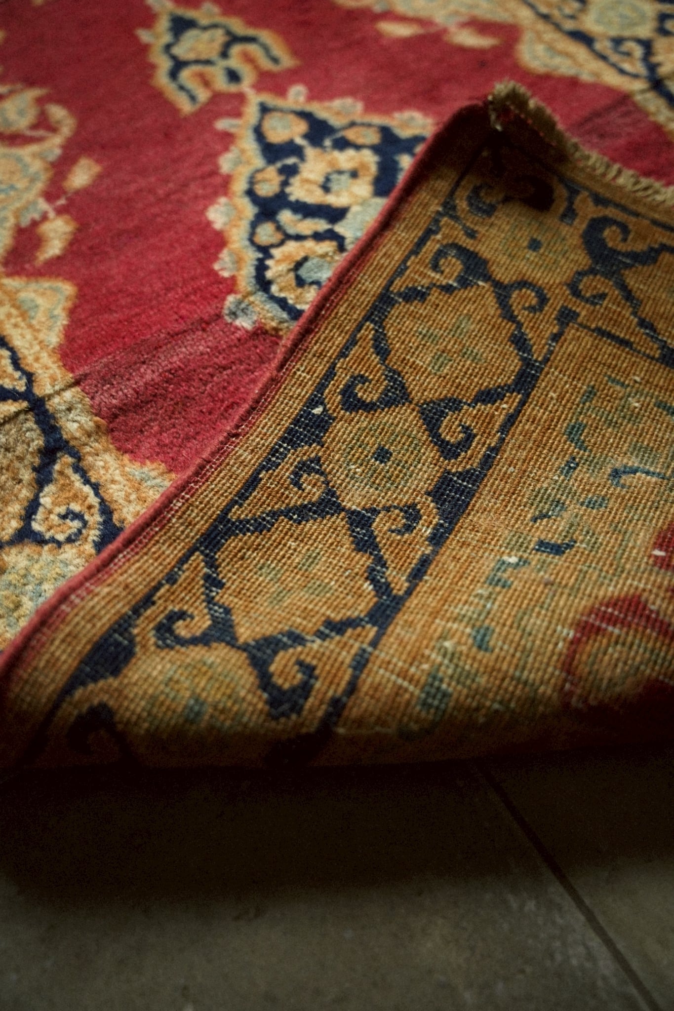 茜色のフィールドに浮かび上がる華やかなメダリオンを中心に、繊細に描かれたフローラルモチーフが織り込まれたクラシカルなデザイン。