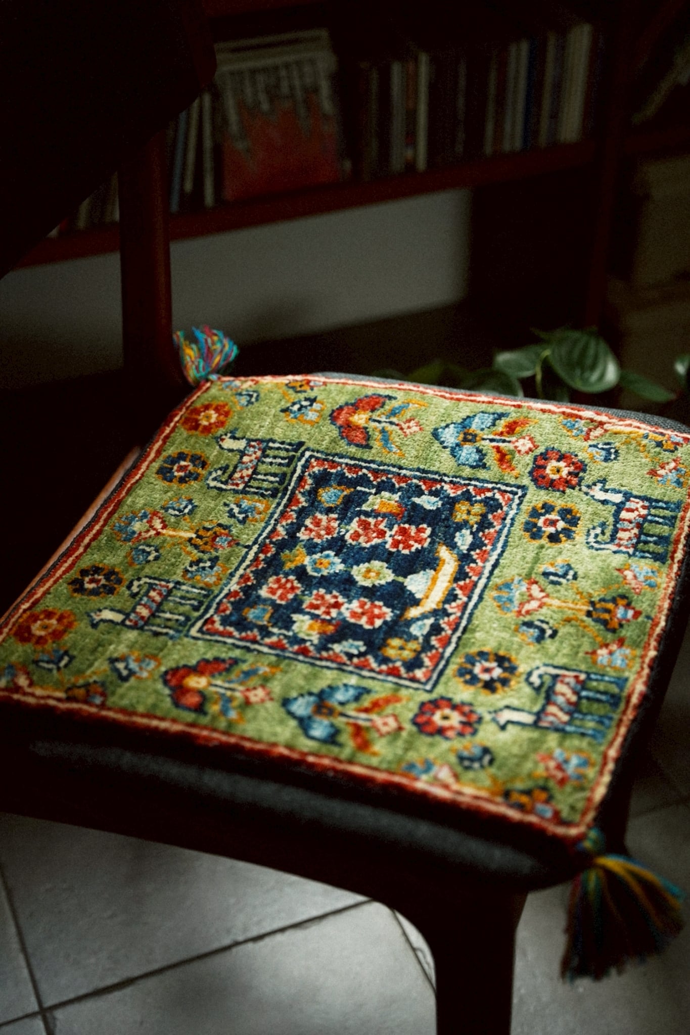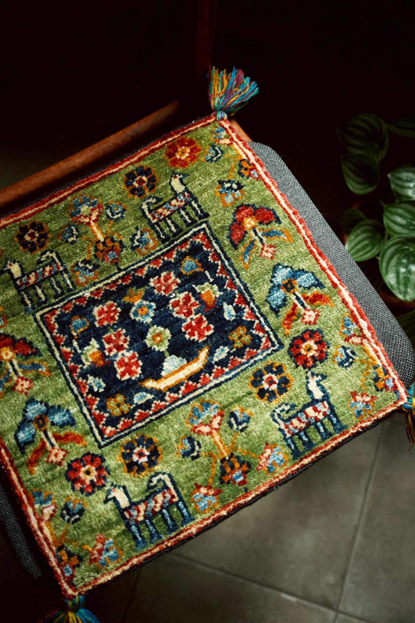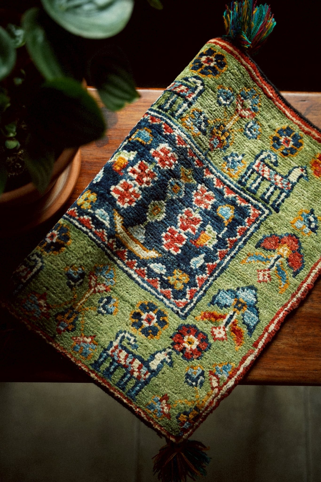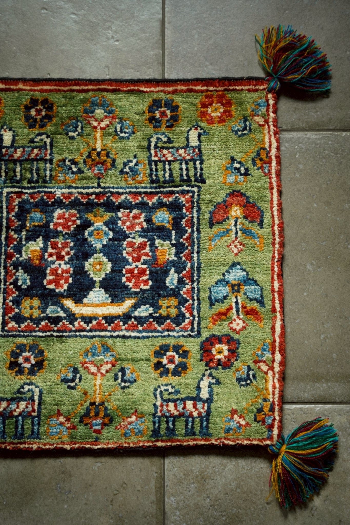 落ち着いた色味のグリーンをベースに油画のようにぽってりとしたタッチで描かれた動物や草花が織り込まれた一枚。四隅のカラフルなタッセルも可愛らしいですね♪