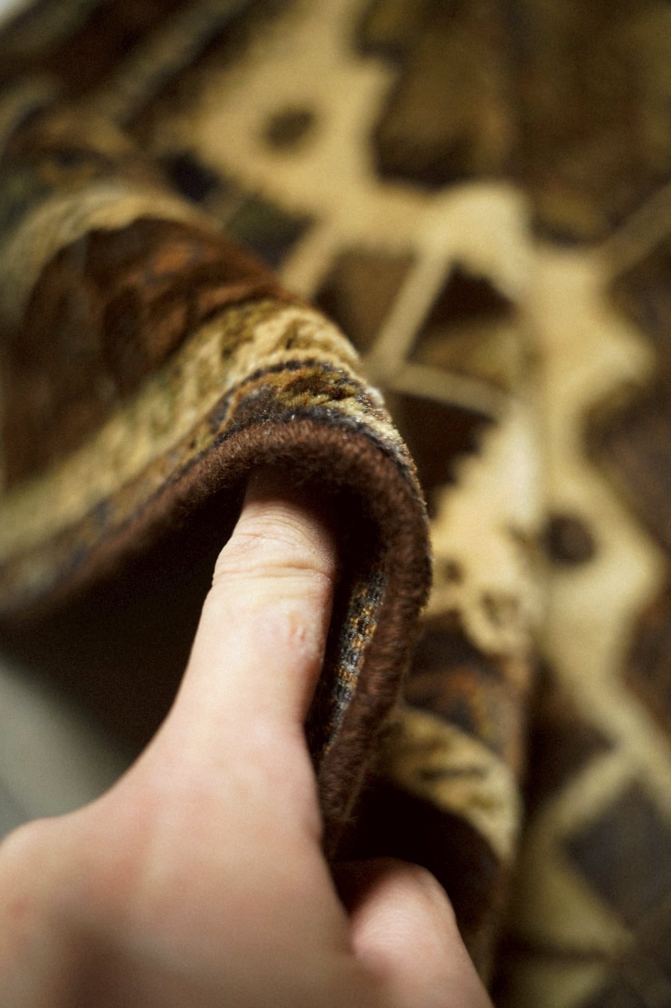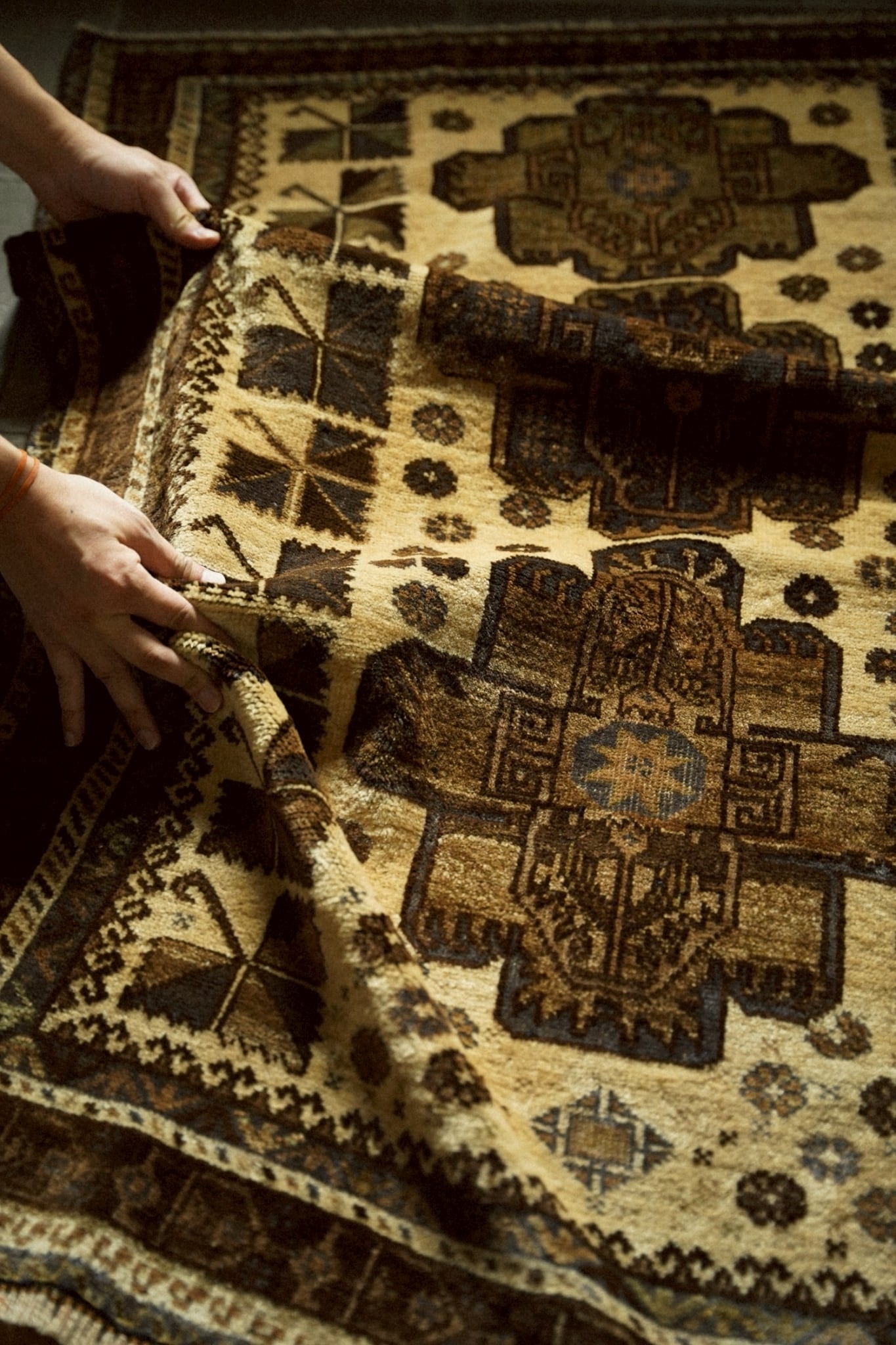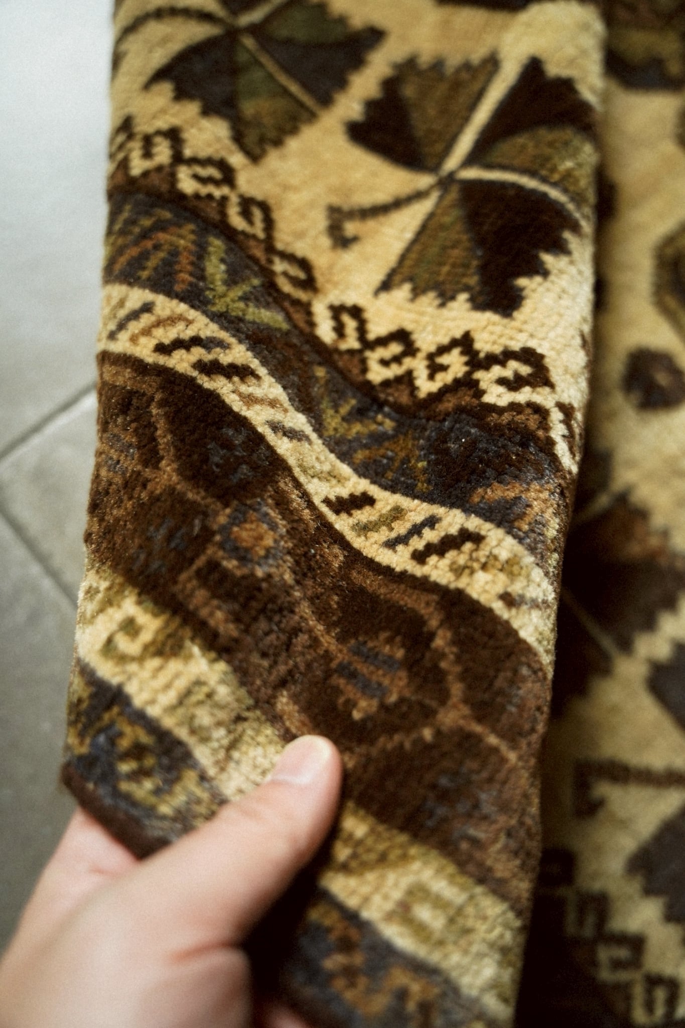 真ん中に八芒星が描かれたジオメトリックなメダリオンの周りには小さなお花とチナール紋様が織り込まれた可愛らしいデザイン。