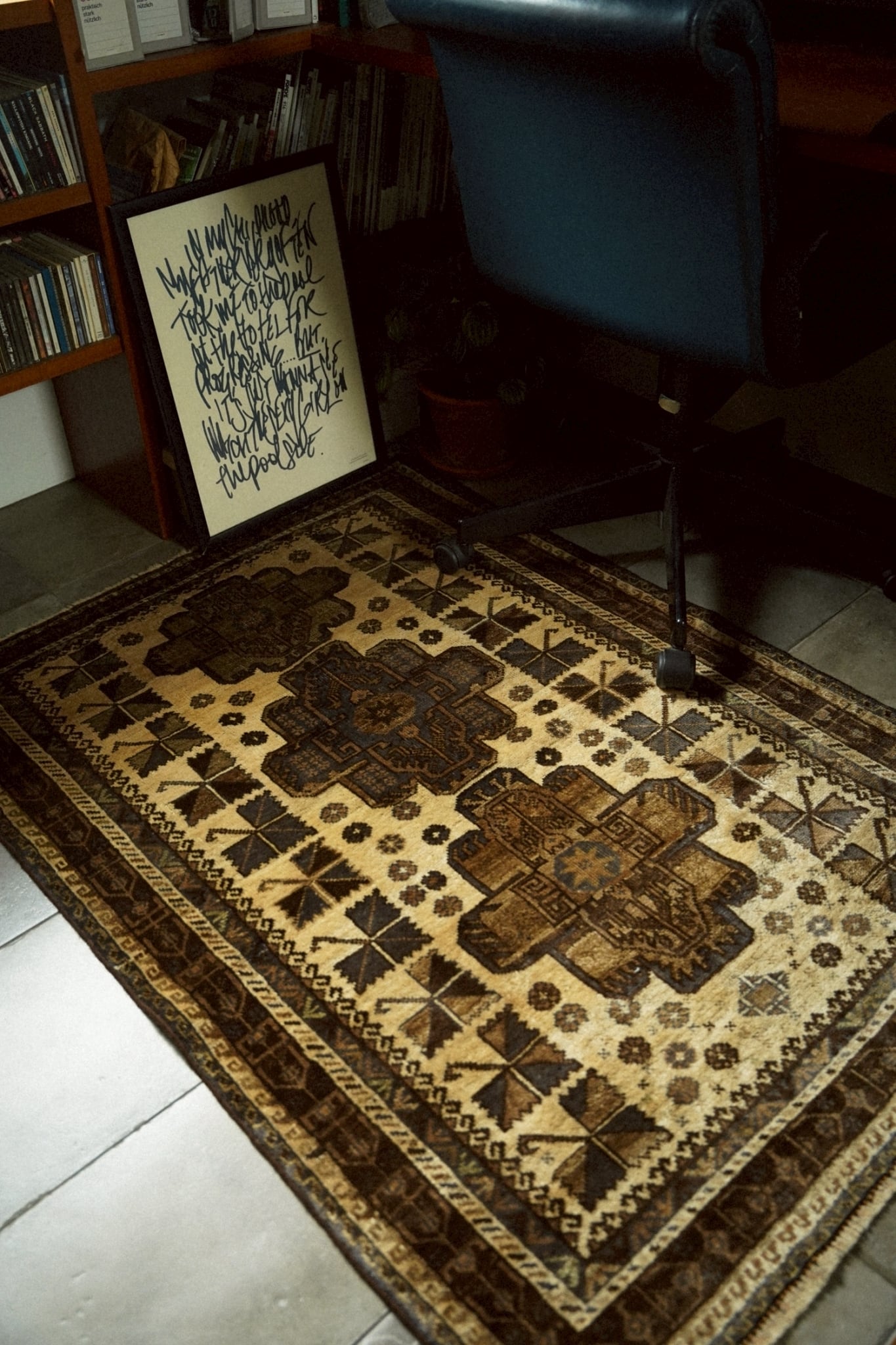 ブラウン、アイボリー、ネイビーを中心とした温かみのある落ち着いた色味がとても素敵な一枚。