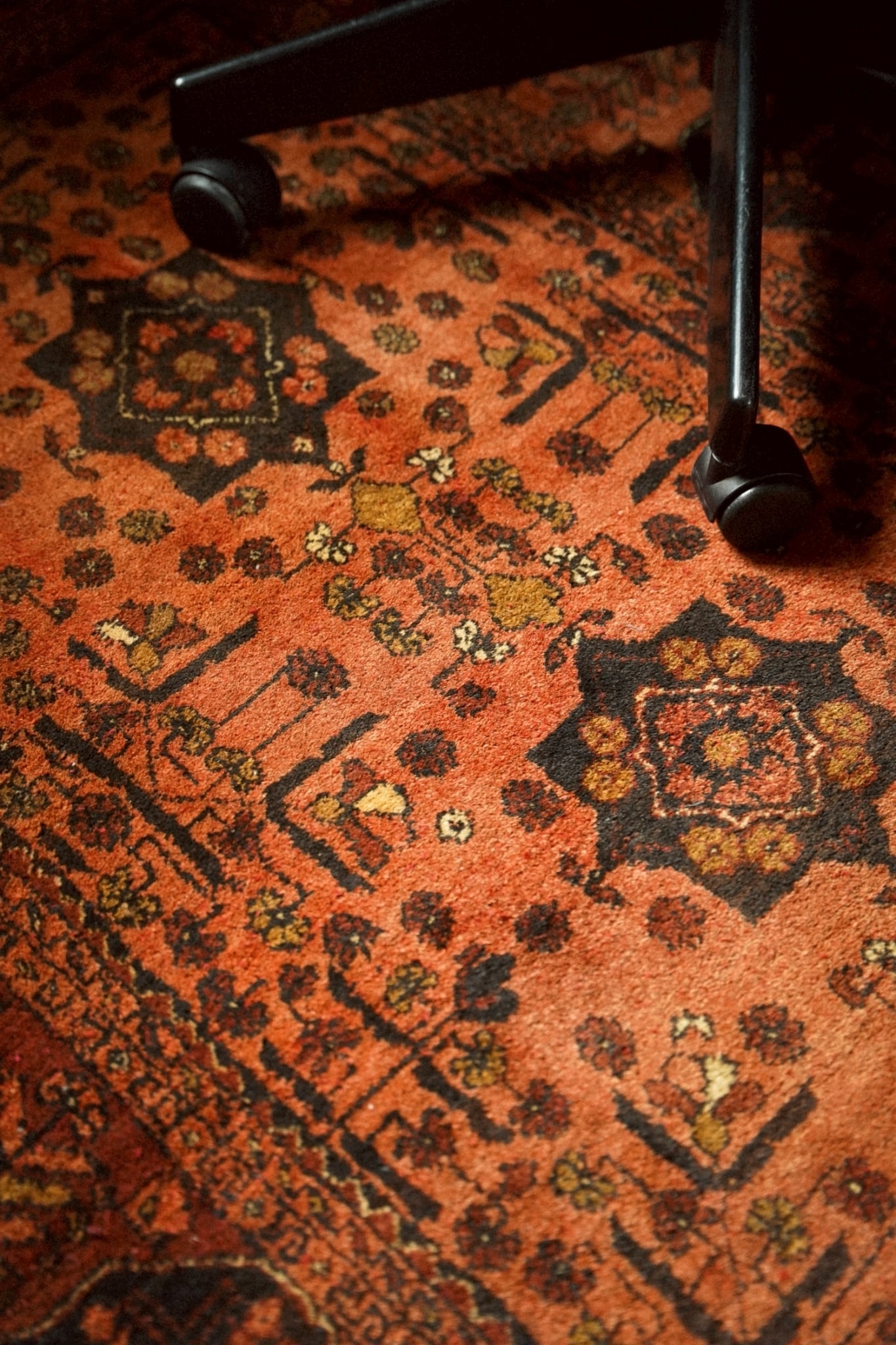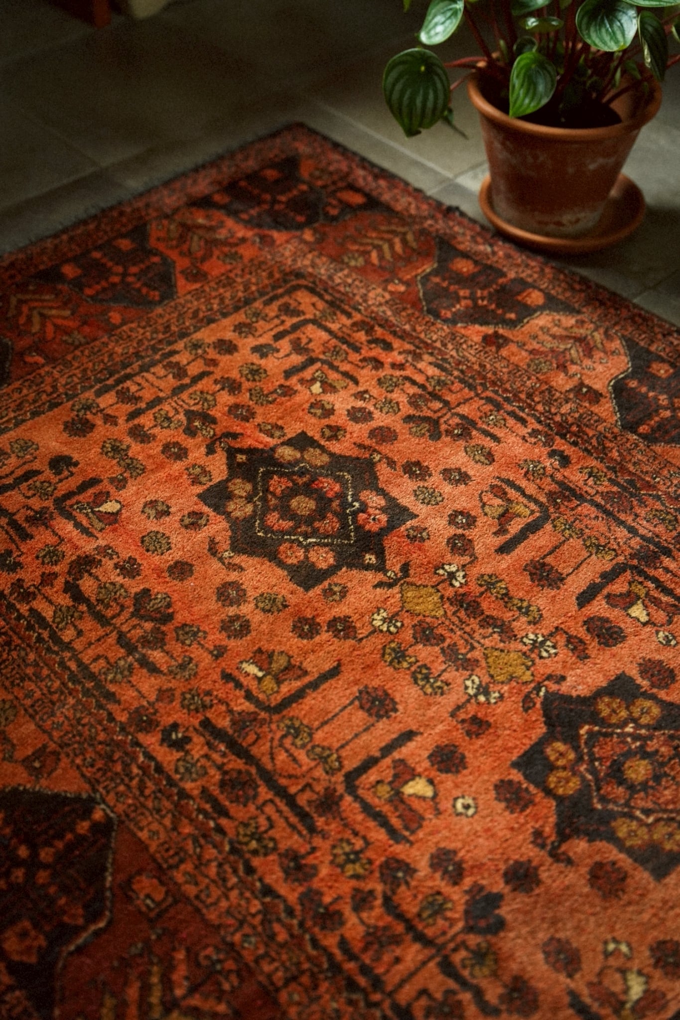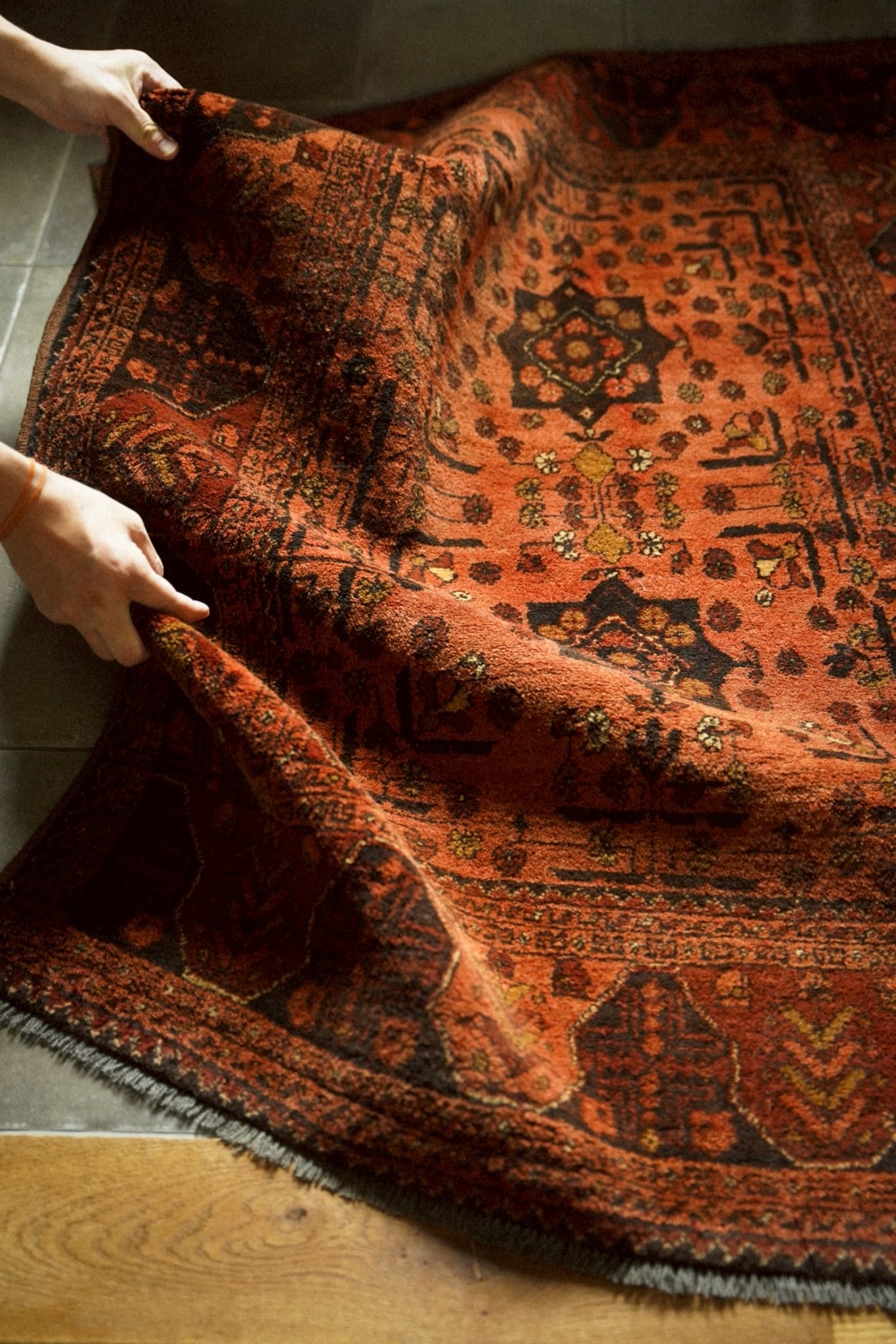 温かみのあるテラコッタに近い朱赤のフィールドに沢山のお花で装飾されたギュル紋様、ボーダー部分には生命の樹とミフラーブ紋様が織り込まれた華やかなデザイン。