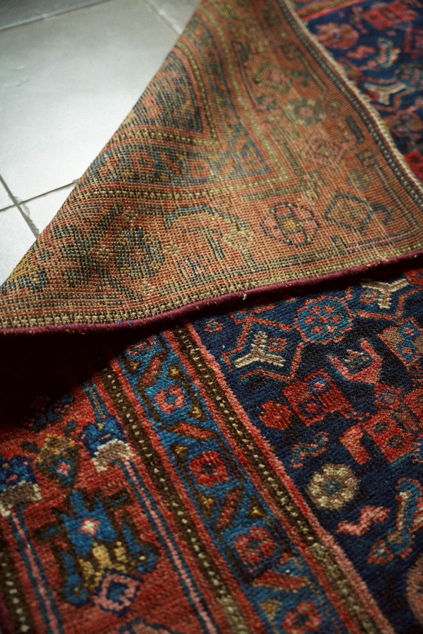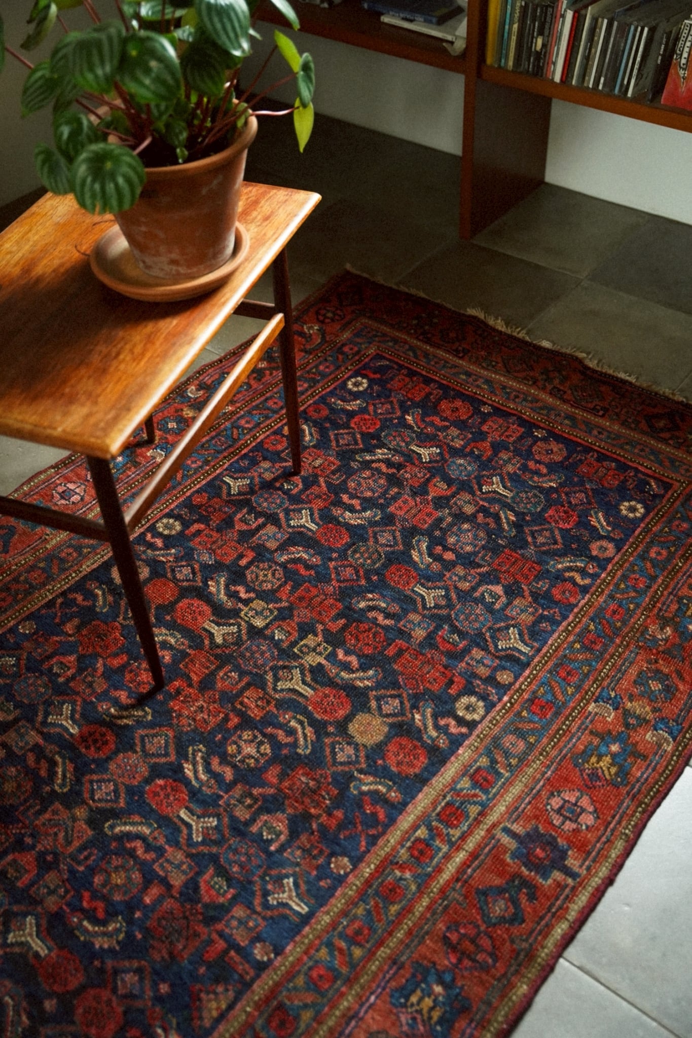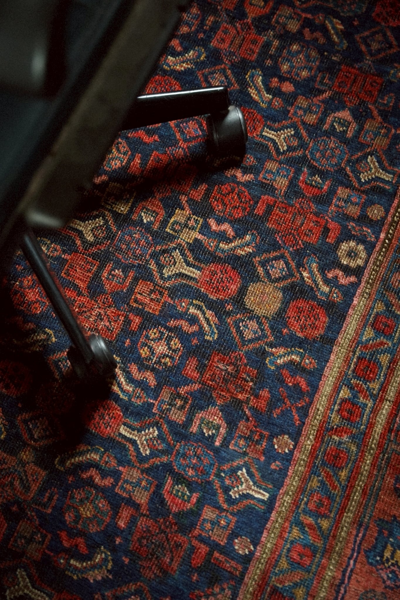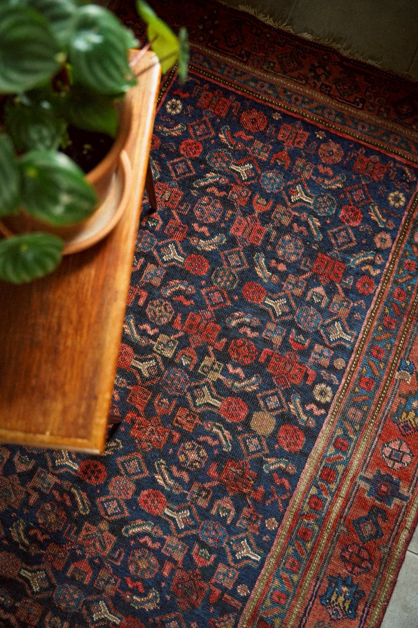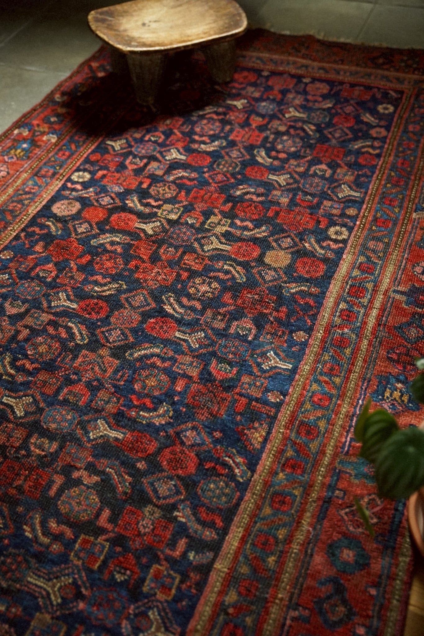 古いラグならではの熟成された色味とクラシカルなデザインのバランスが良く、どこに敷こうか考えるだけでワクワクする一枚。