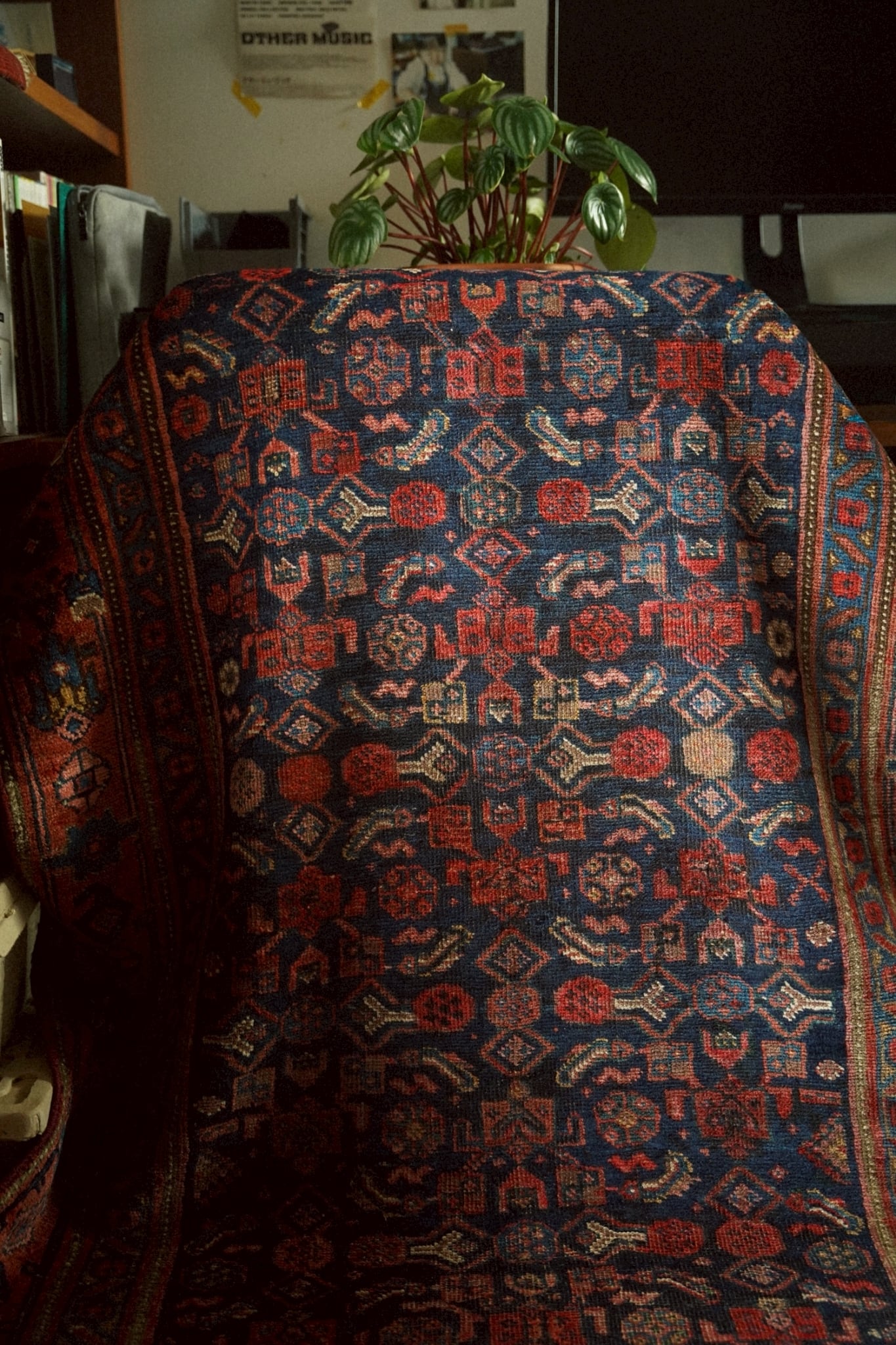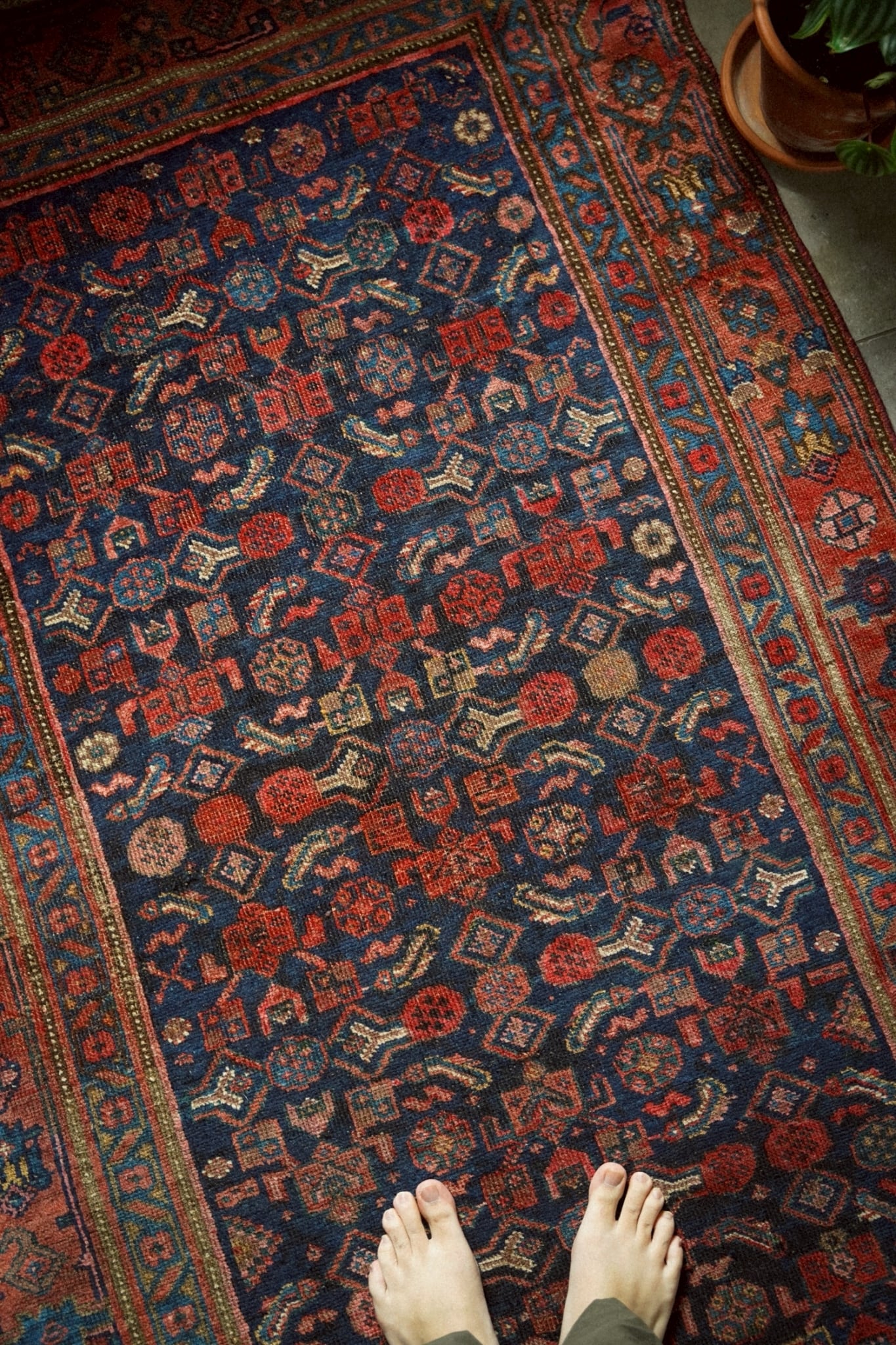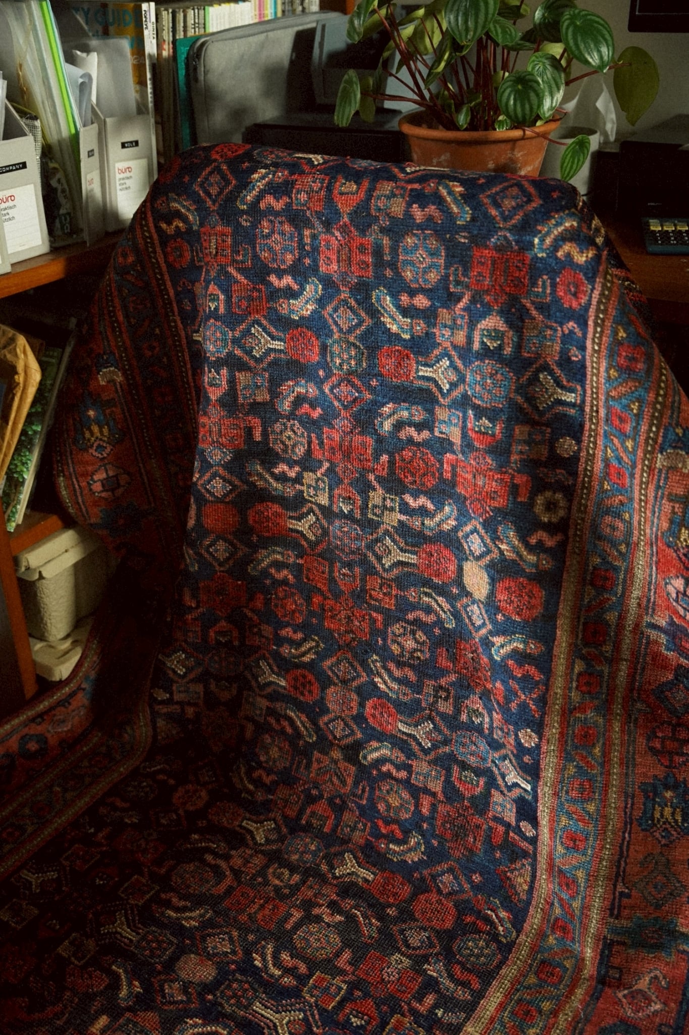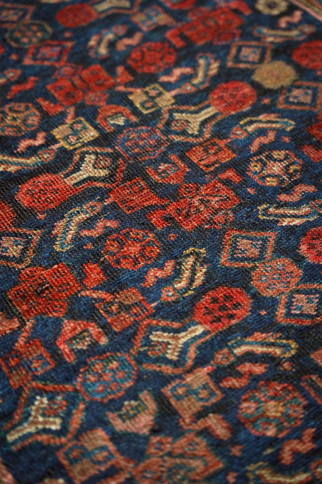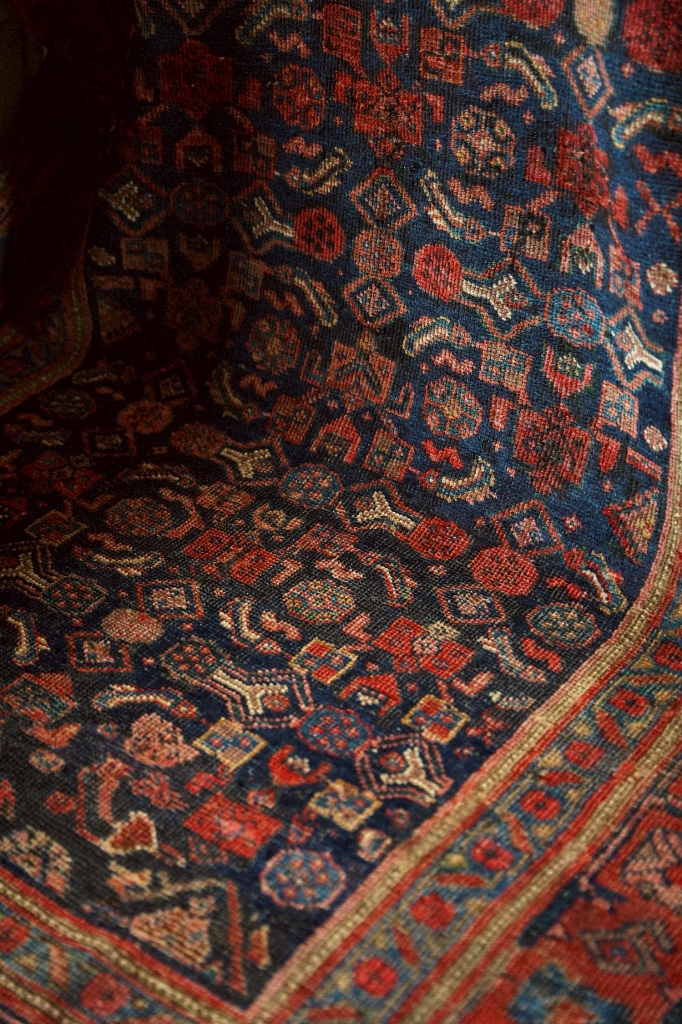 古いラグならではの熟成された色味とクラシカルなデザインのバランスが良く、どこに敷こうか考えるだけでワクワクする一枚。