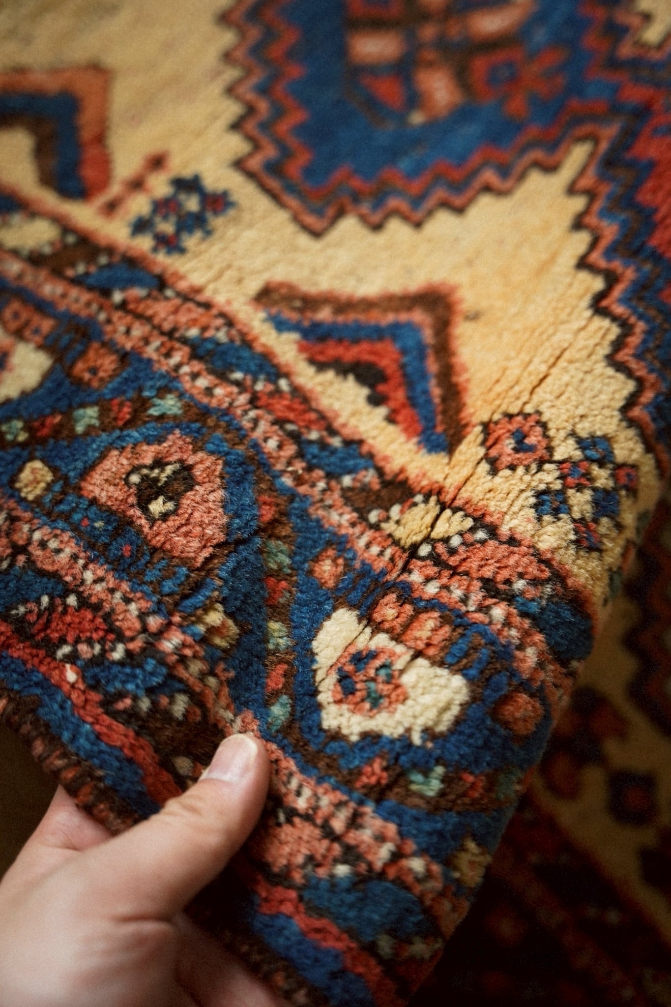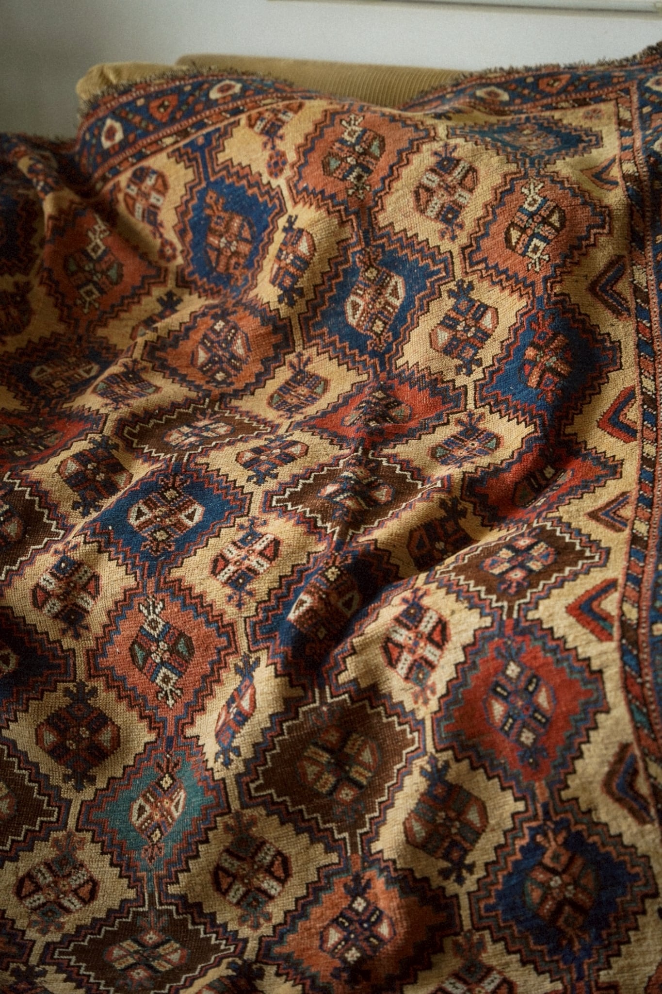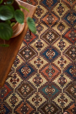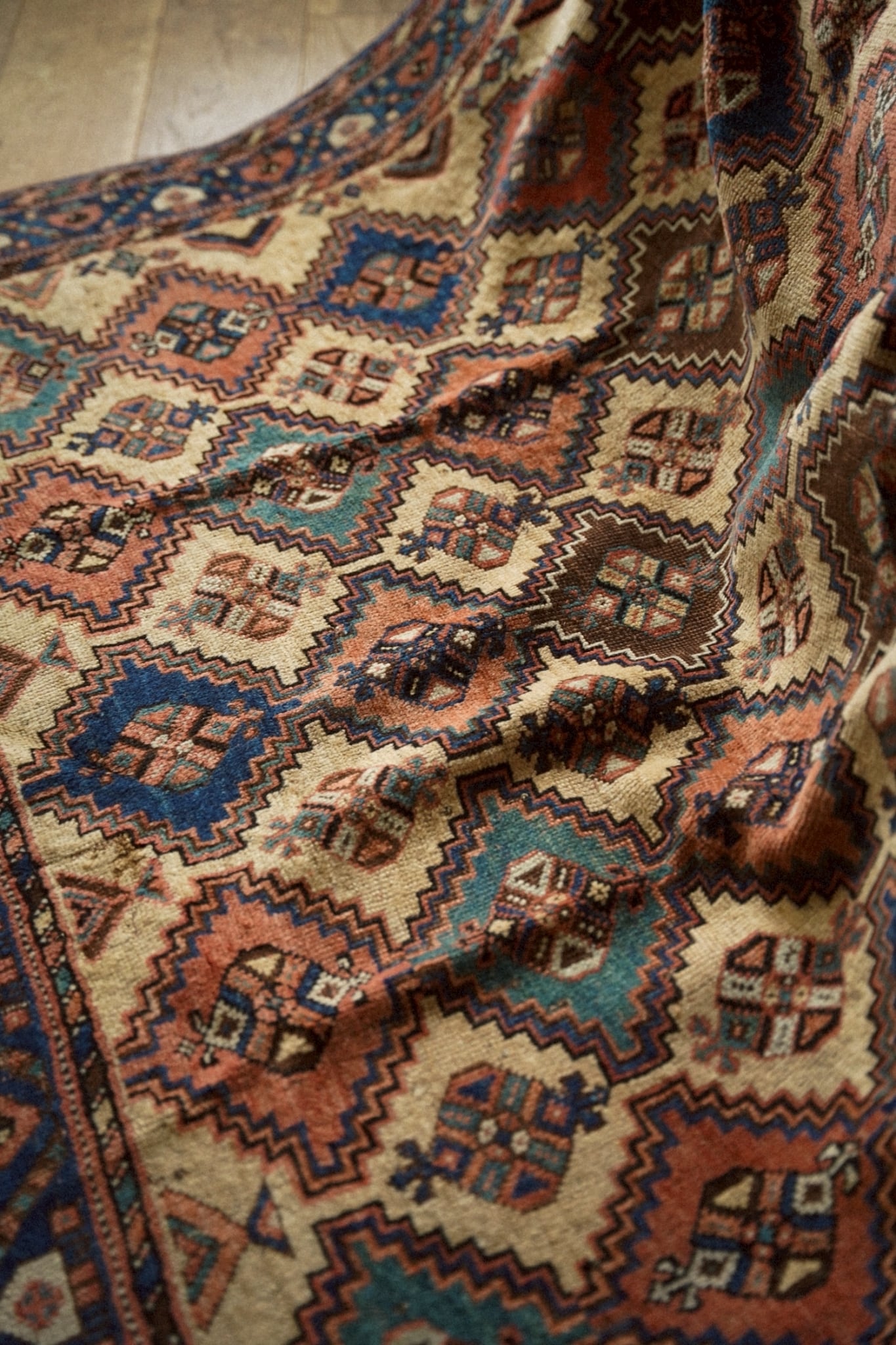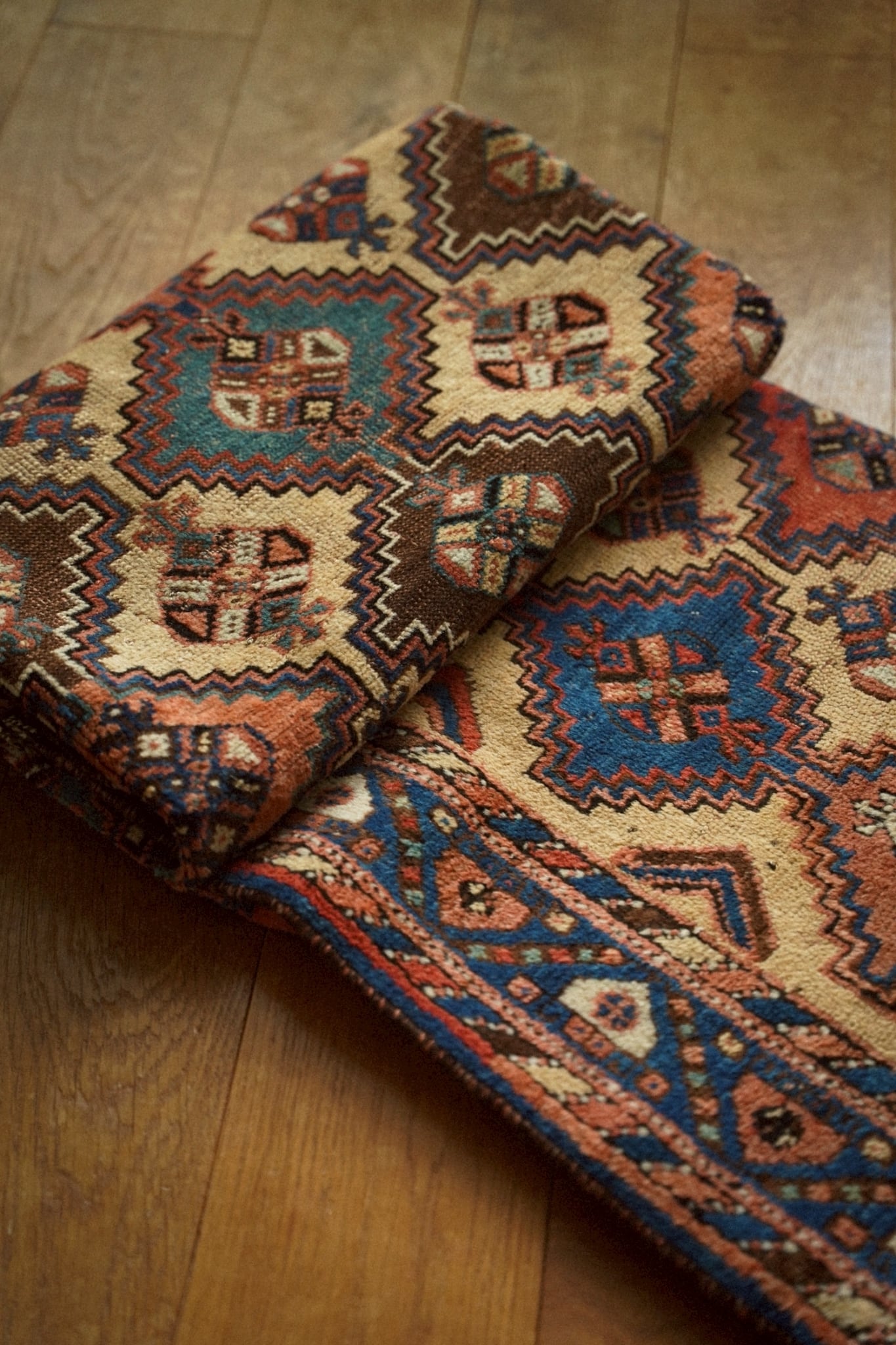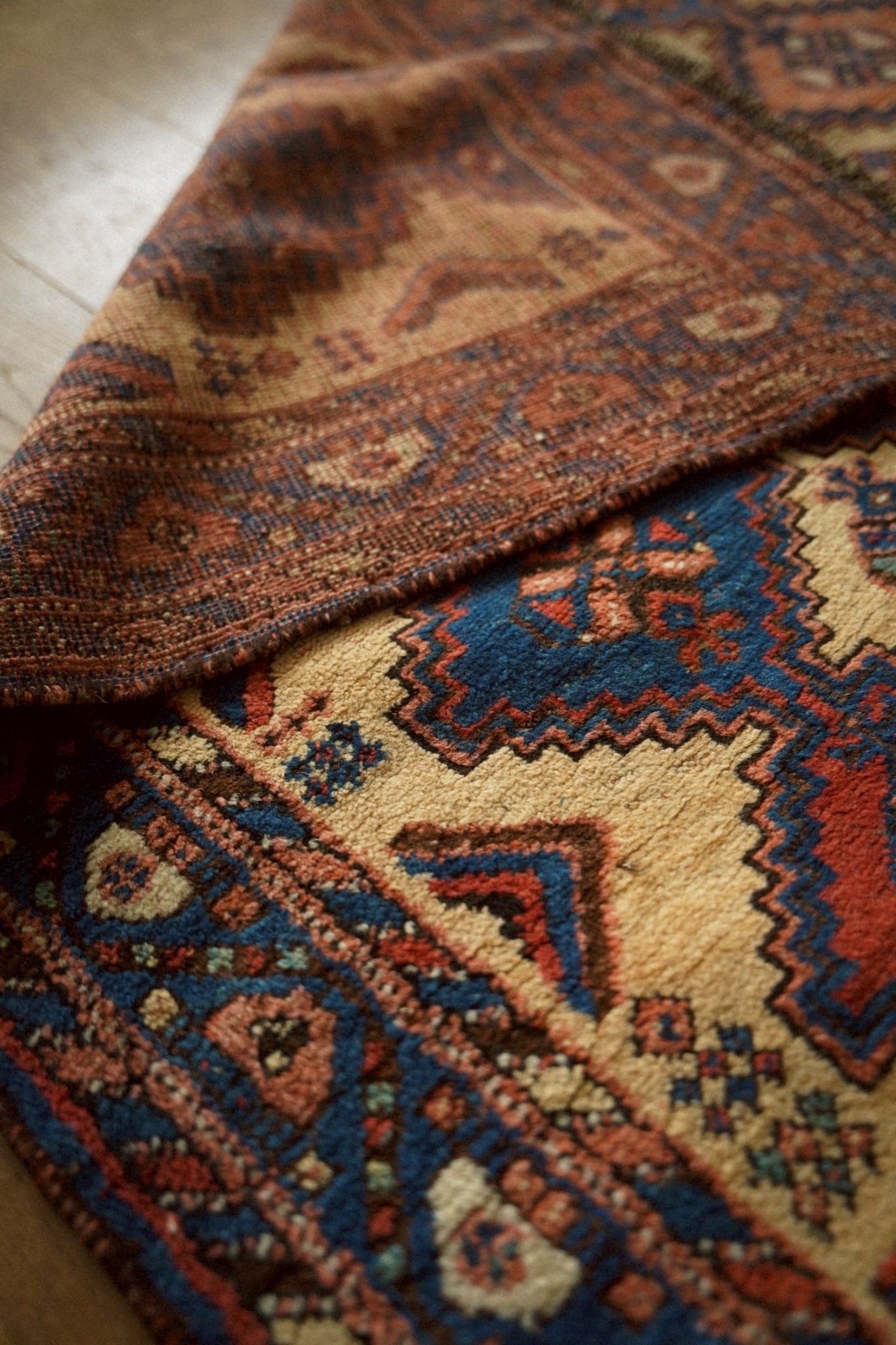 アンティークに近い古いラグのため多少パイルの低い箇所や補修跡もありますが、使用に問題はなく大事に受け継がれてきた歴史を感じさせます。