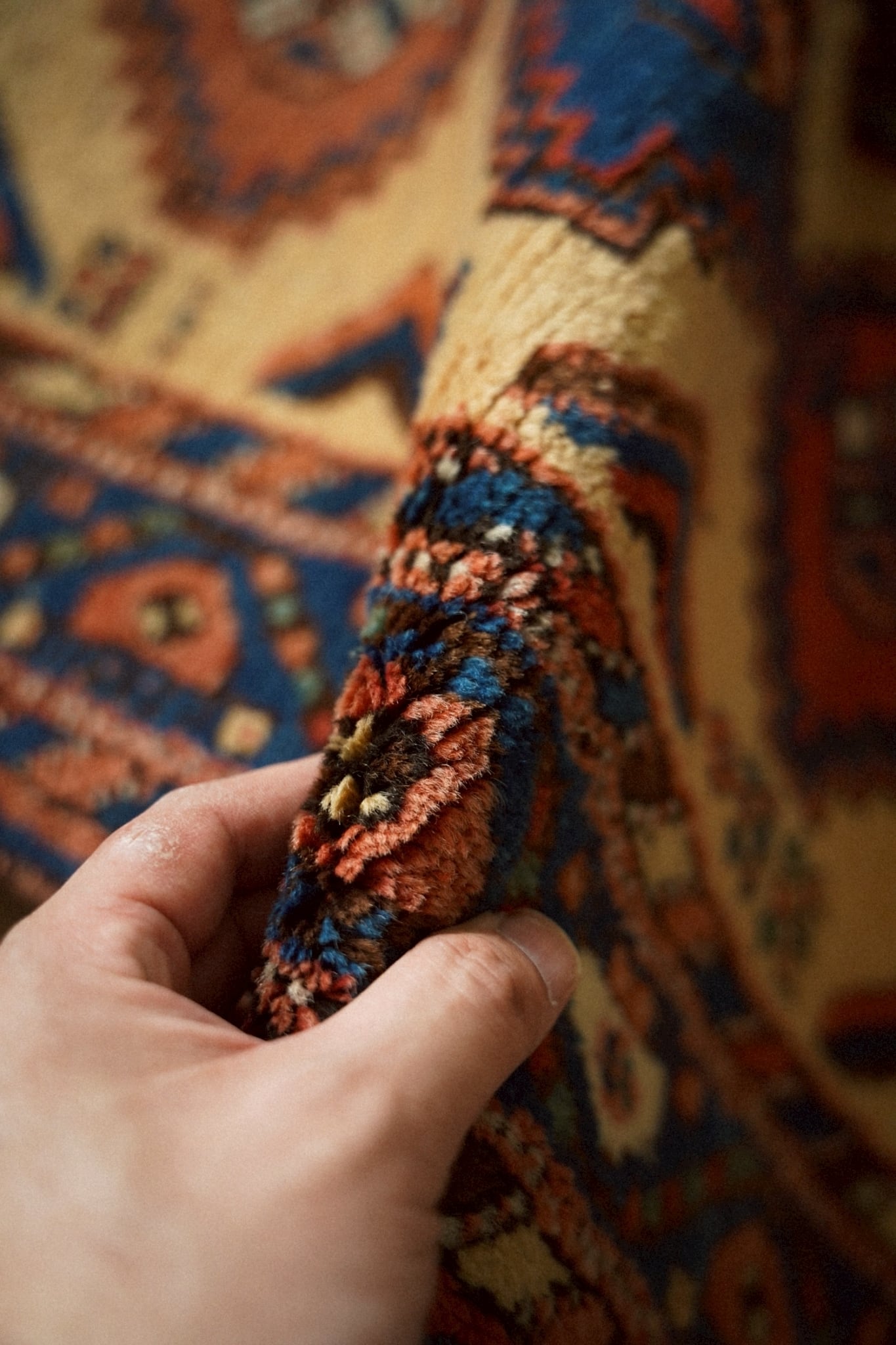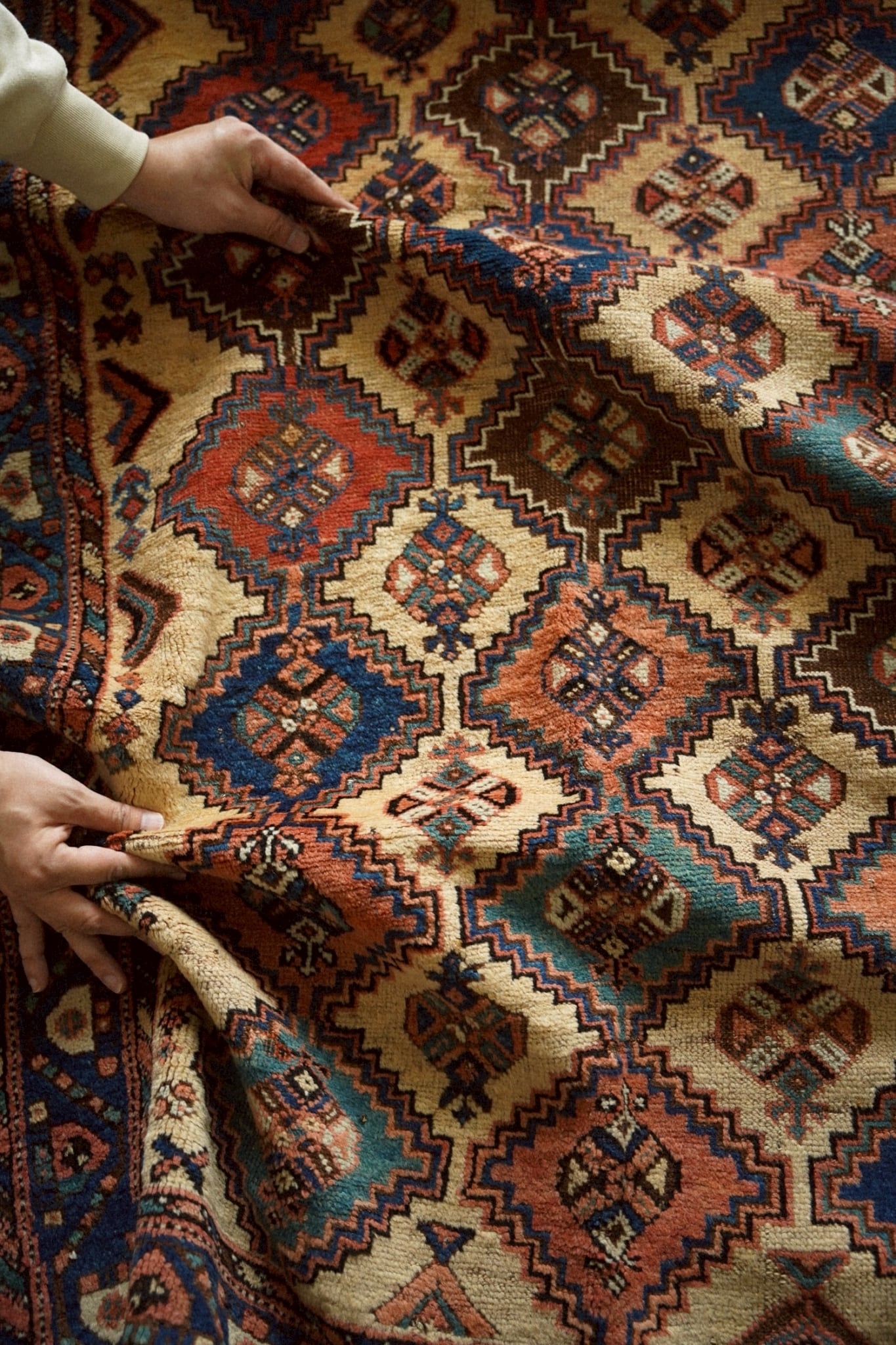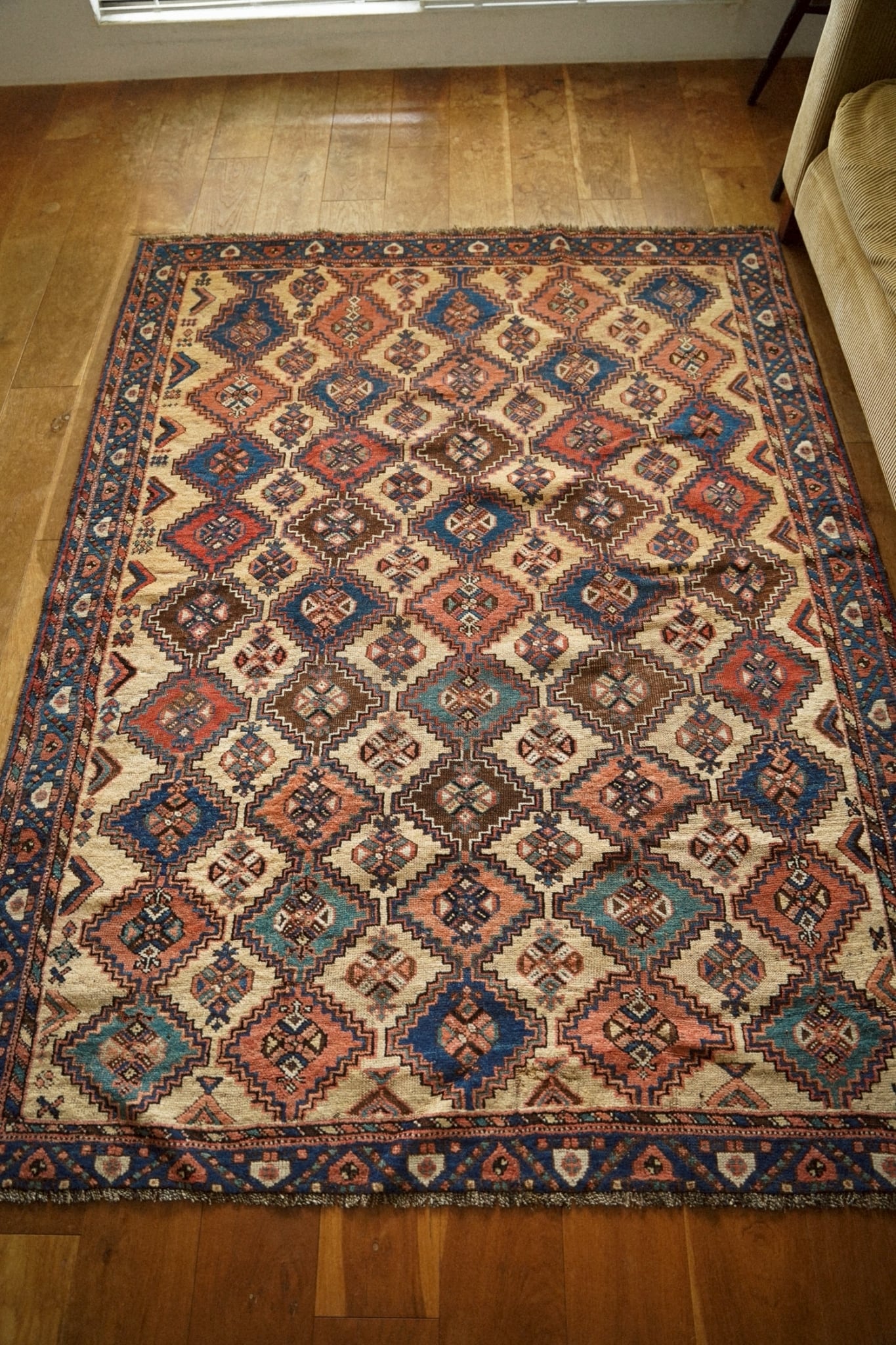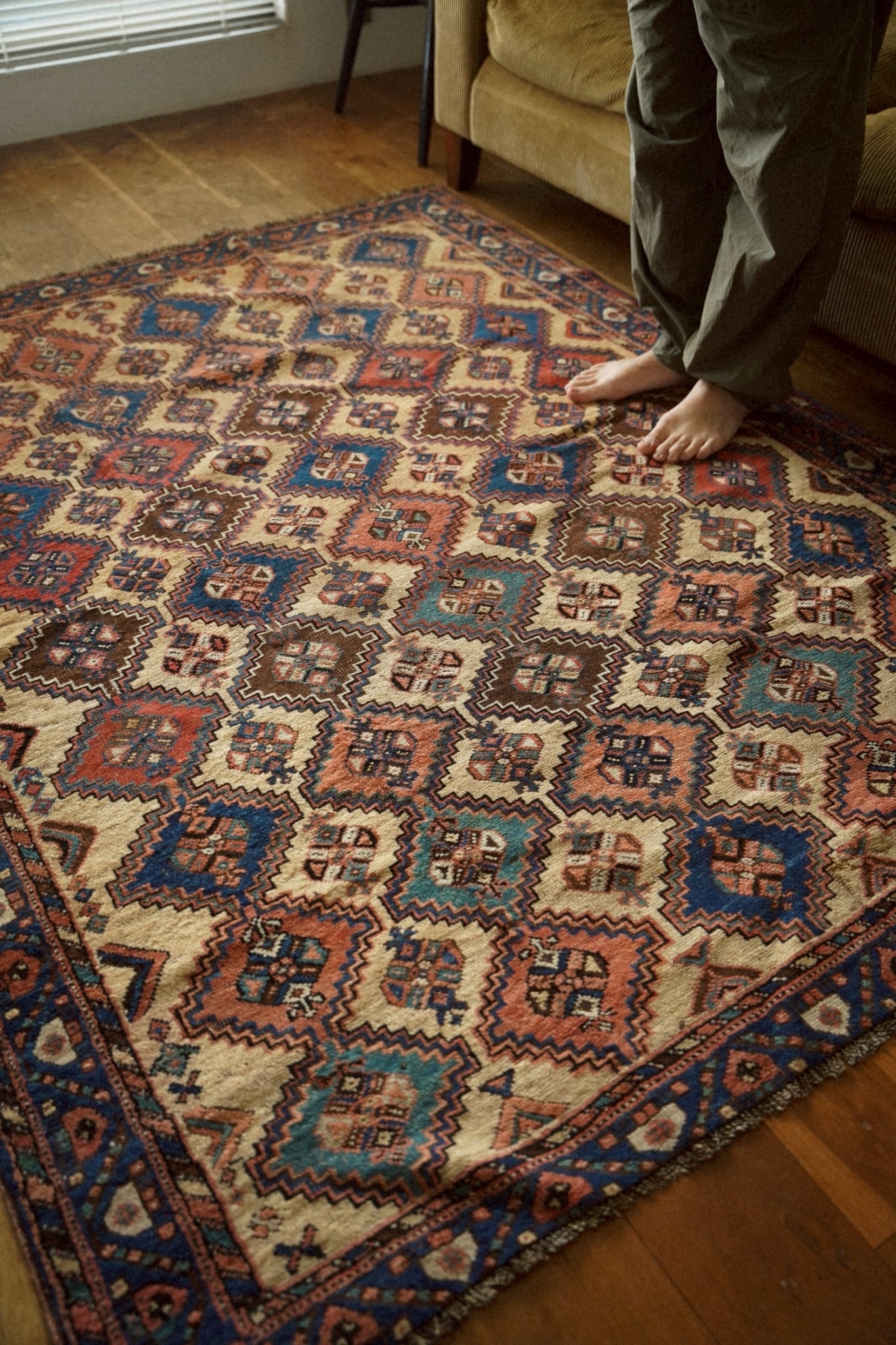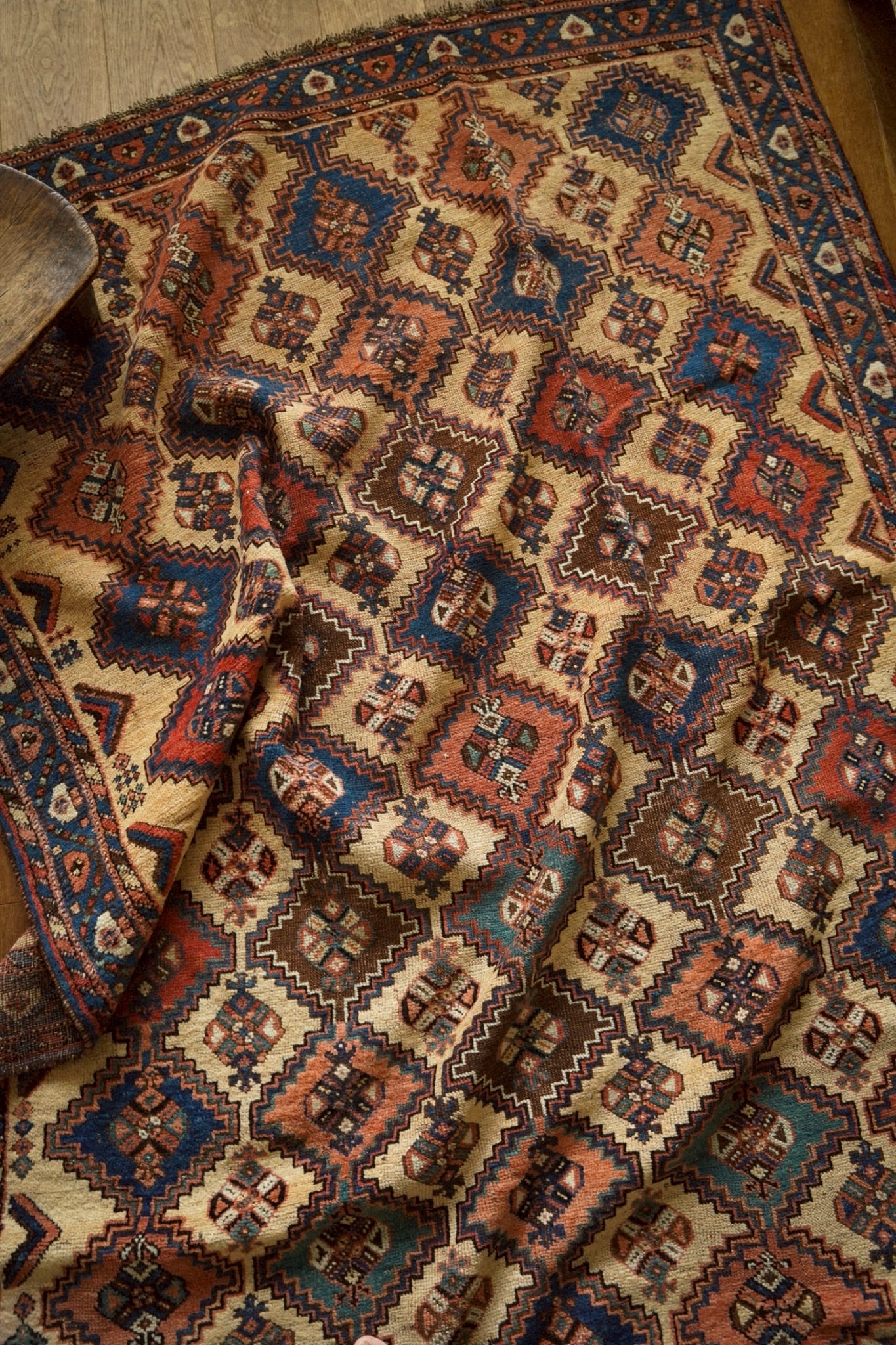 アンティークに近い古いラグのため多少パイルの低い箇所や補修跡もありますが、使用に問題はなく大事に受け継がれてきた歴史を感じさせます。