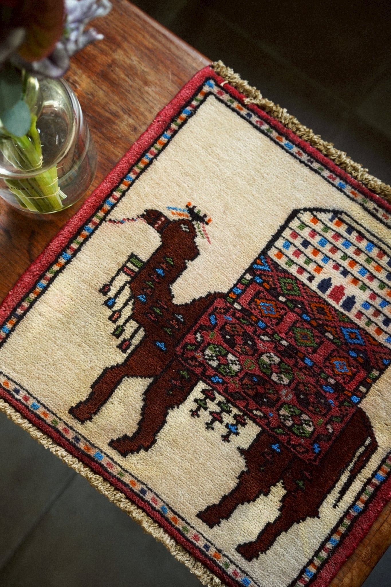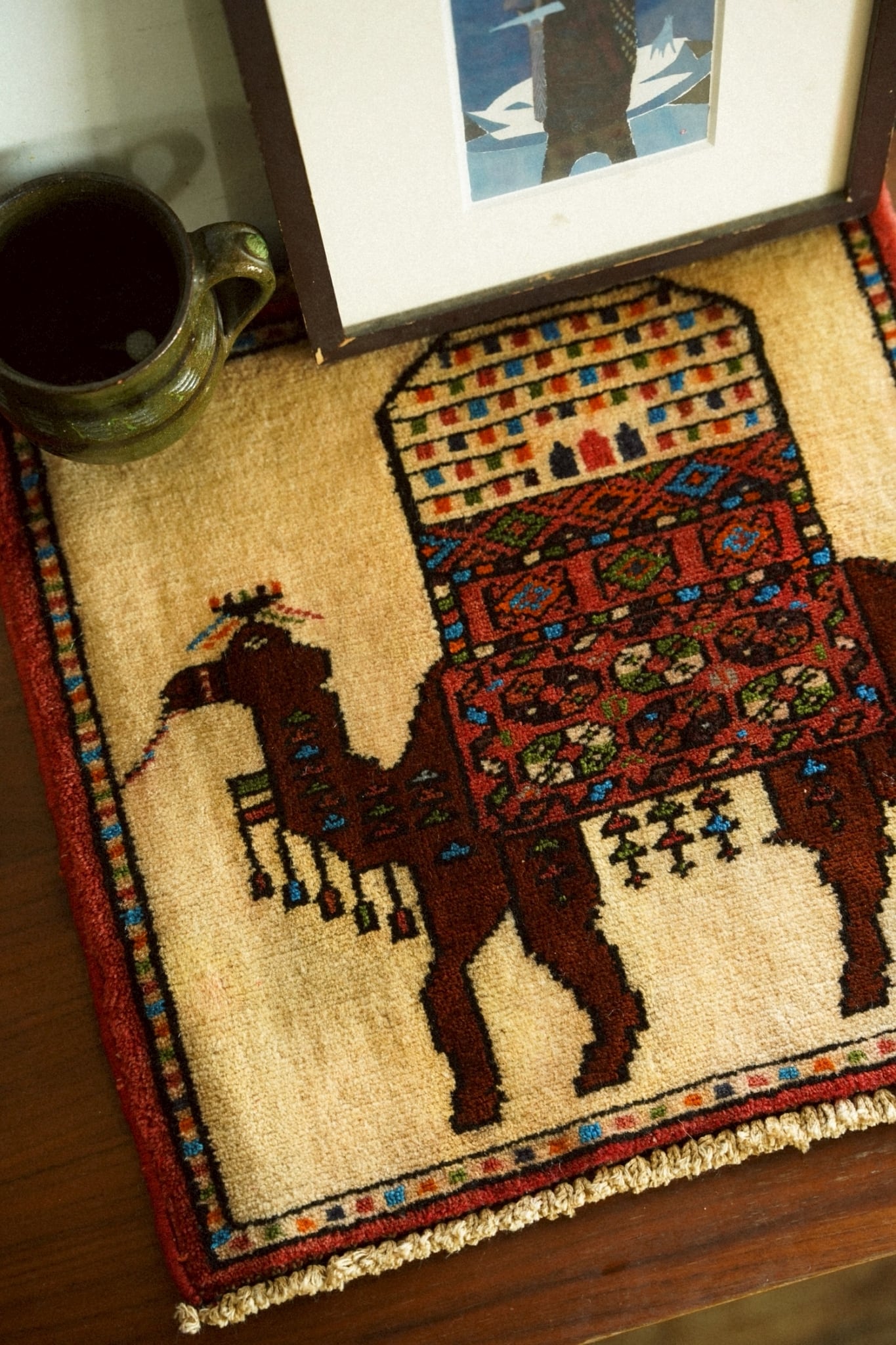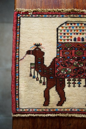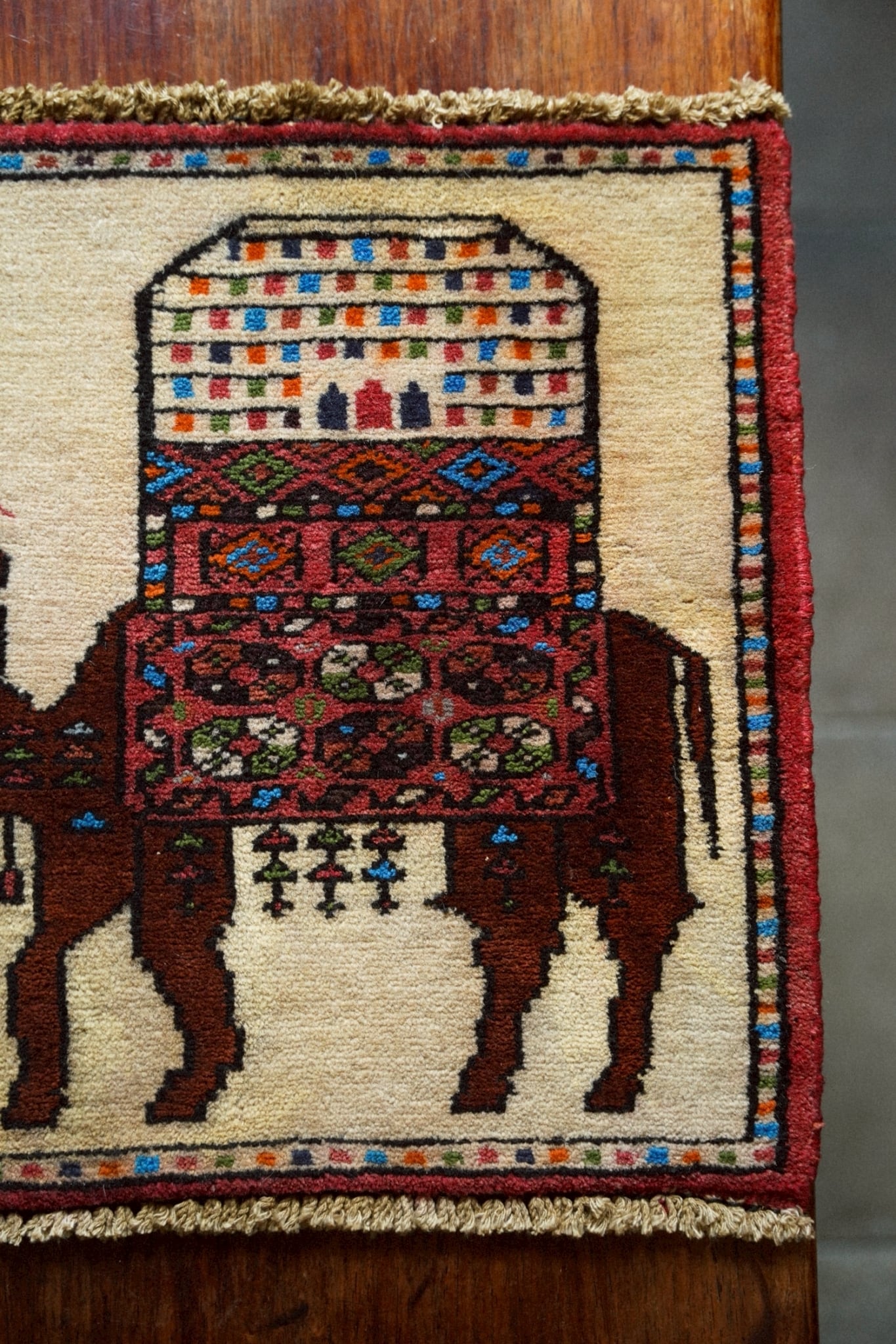 砂漠を旅するキャラバンをモチーフにしたアフガニスタン産のラグ。