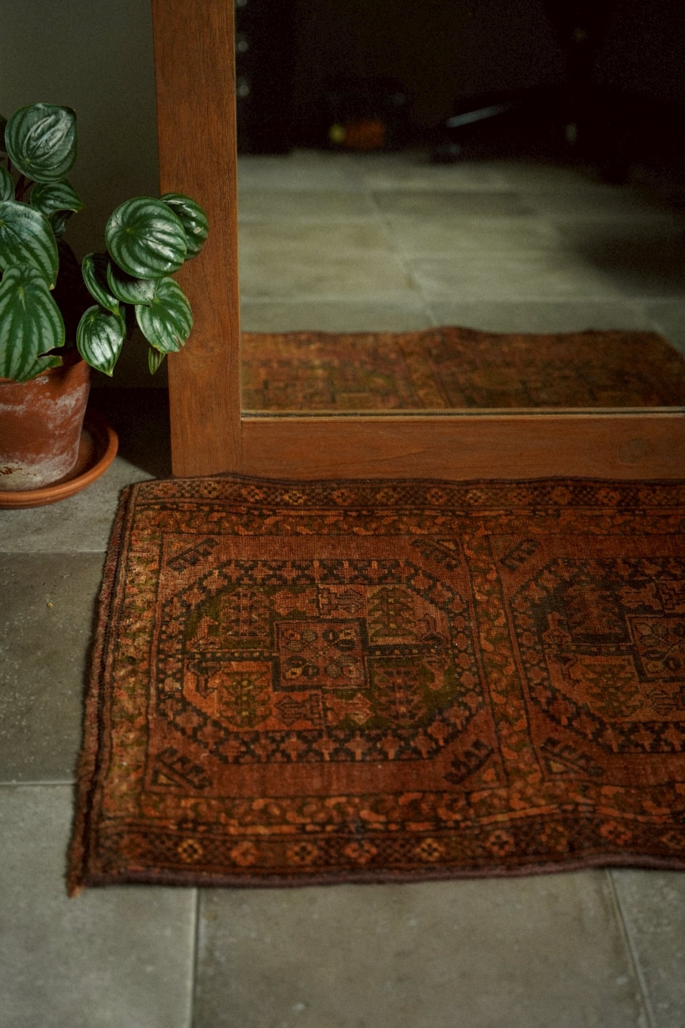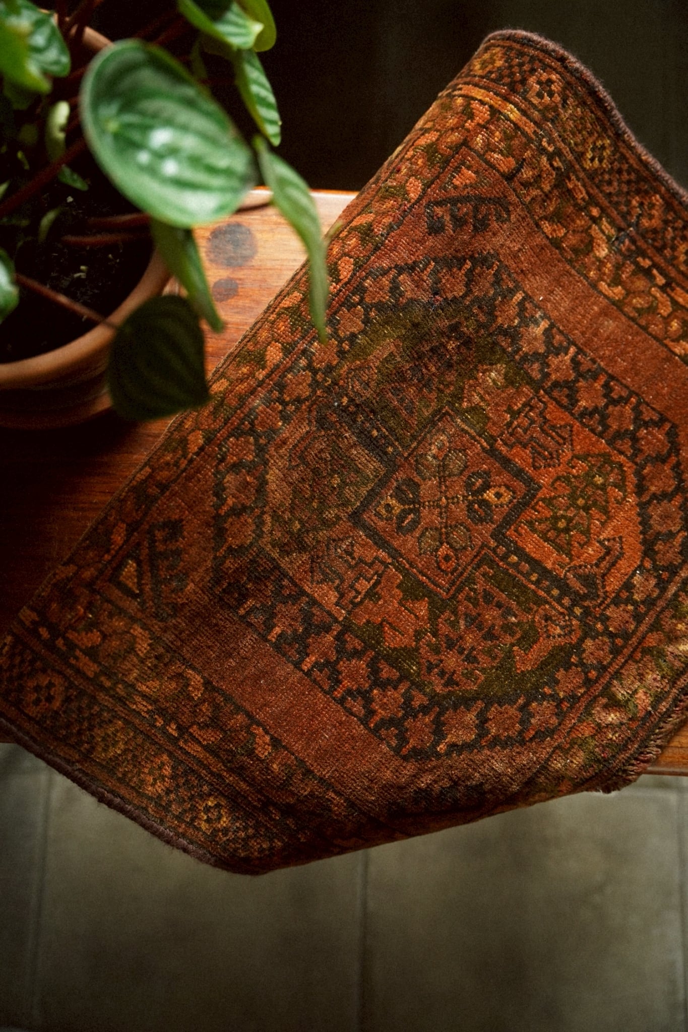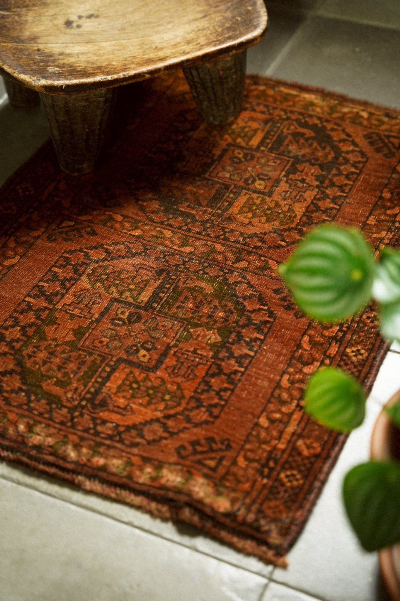 経年によるわずかな擦れや褪色は見られますが、それもまたヴィンテージラグならではの表情。長い時間を経て生まれた風合いとしてお楽しみください。