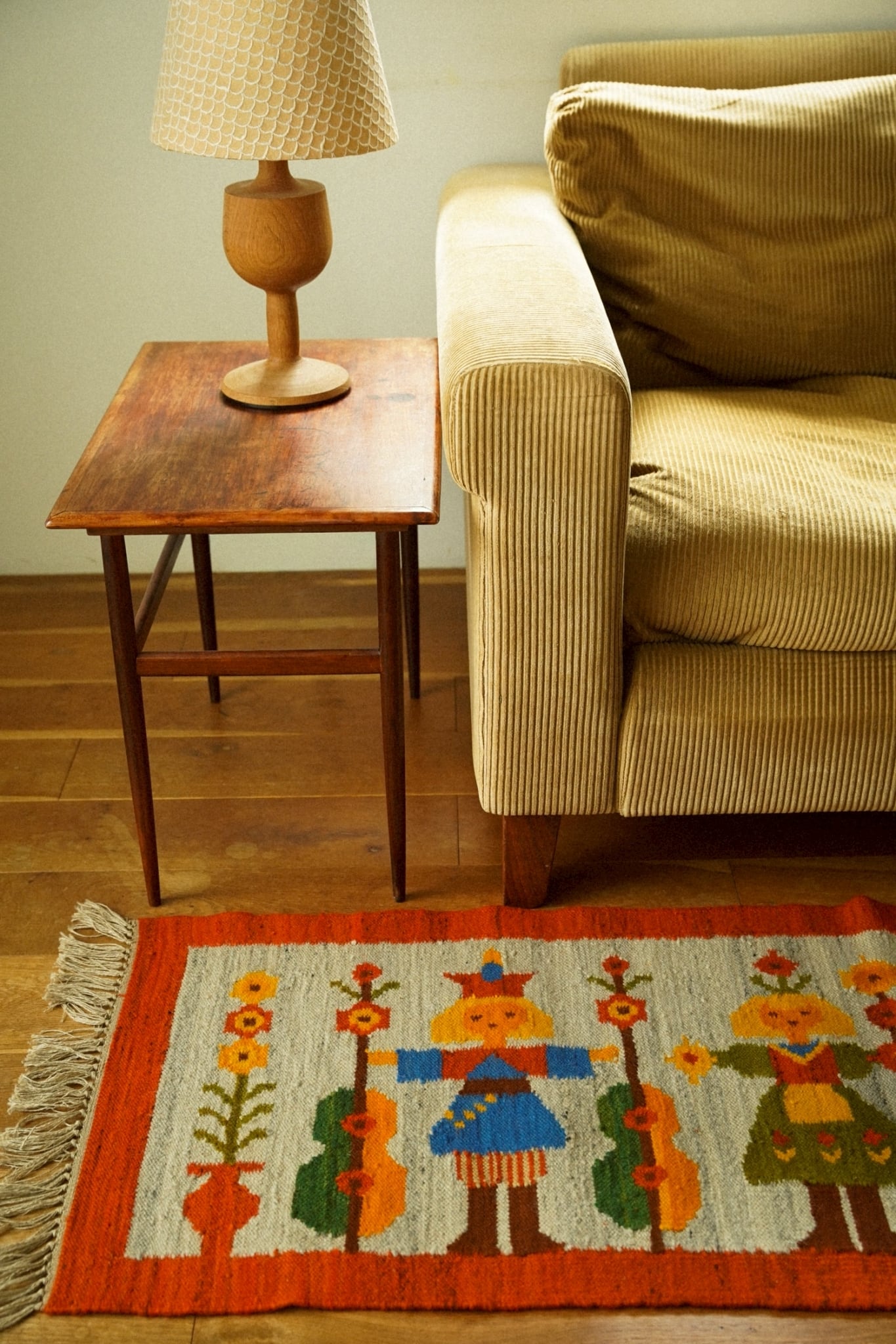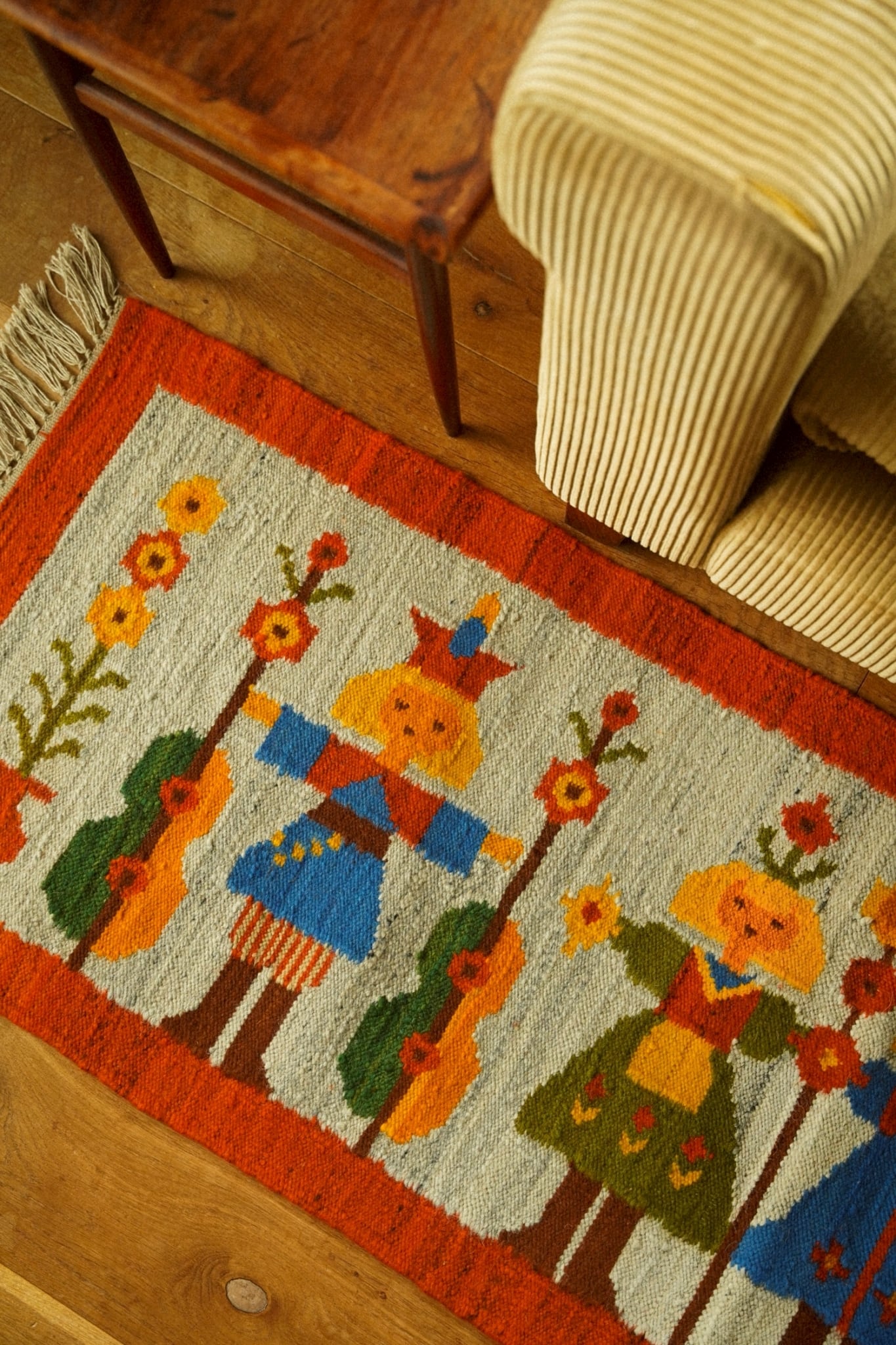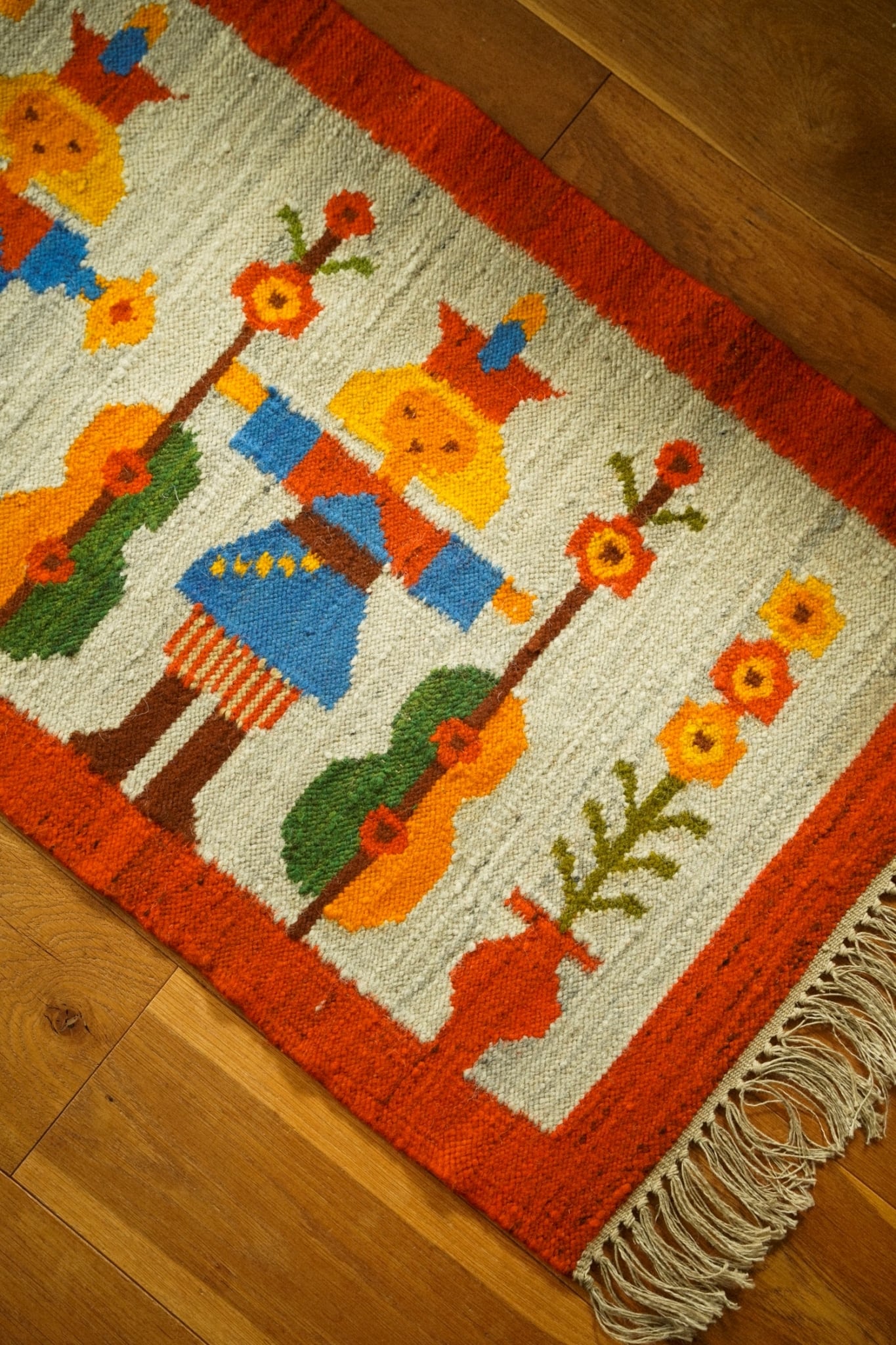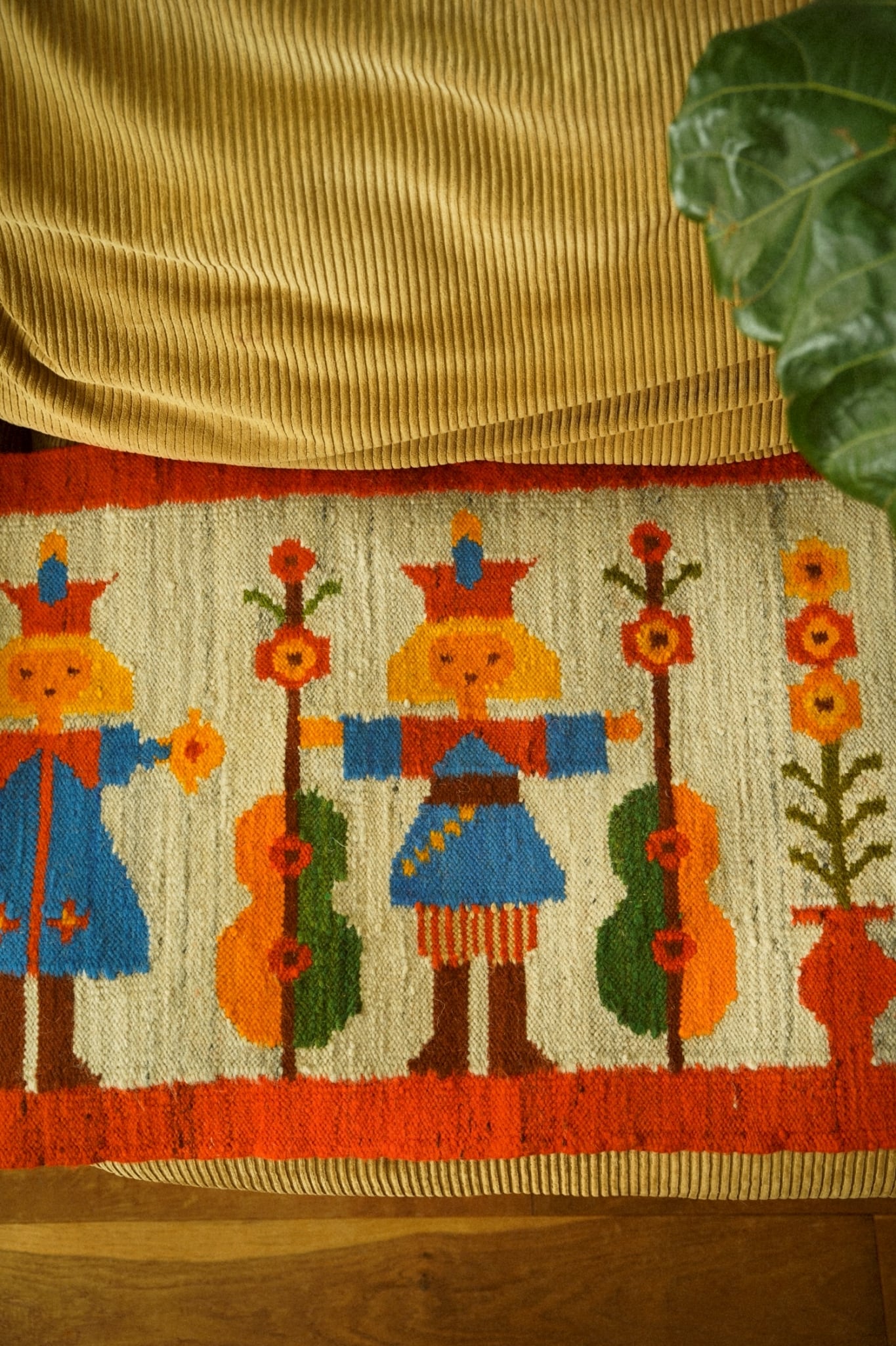 キリムには横一列に並んだ女の子、草花や木のモチーフが描かれたレトロな雰囲気のある可愛らしい一枚。